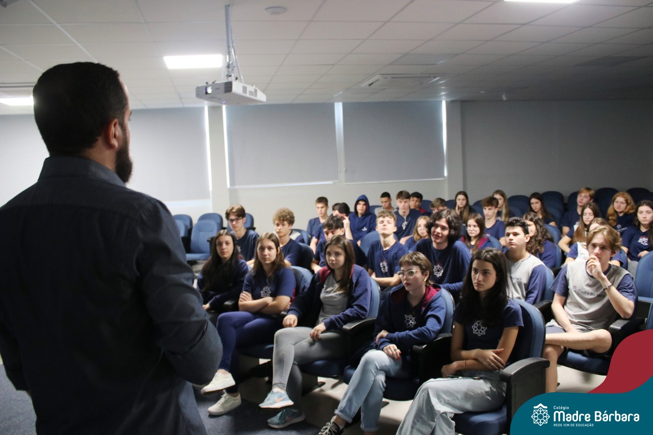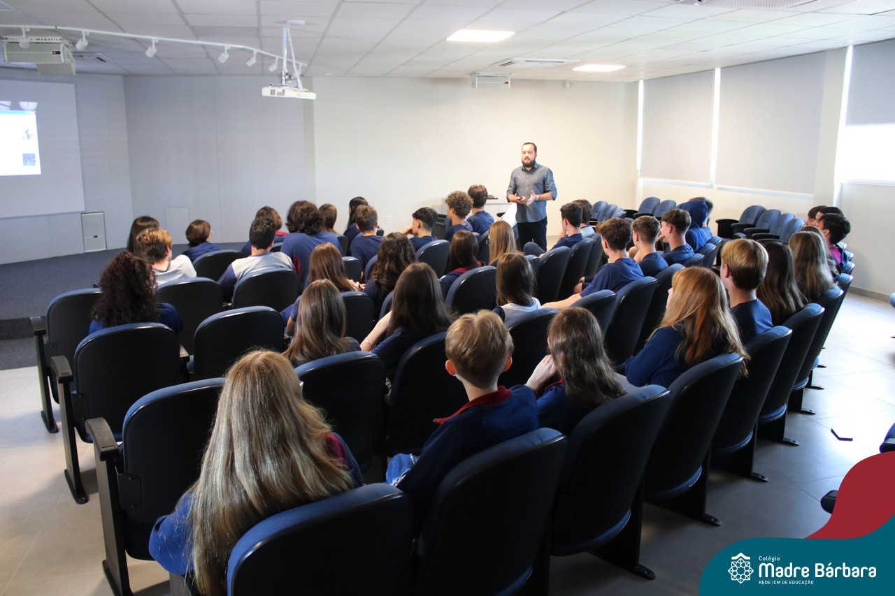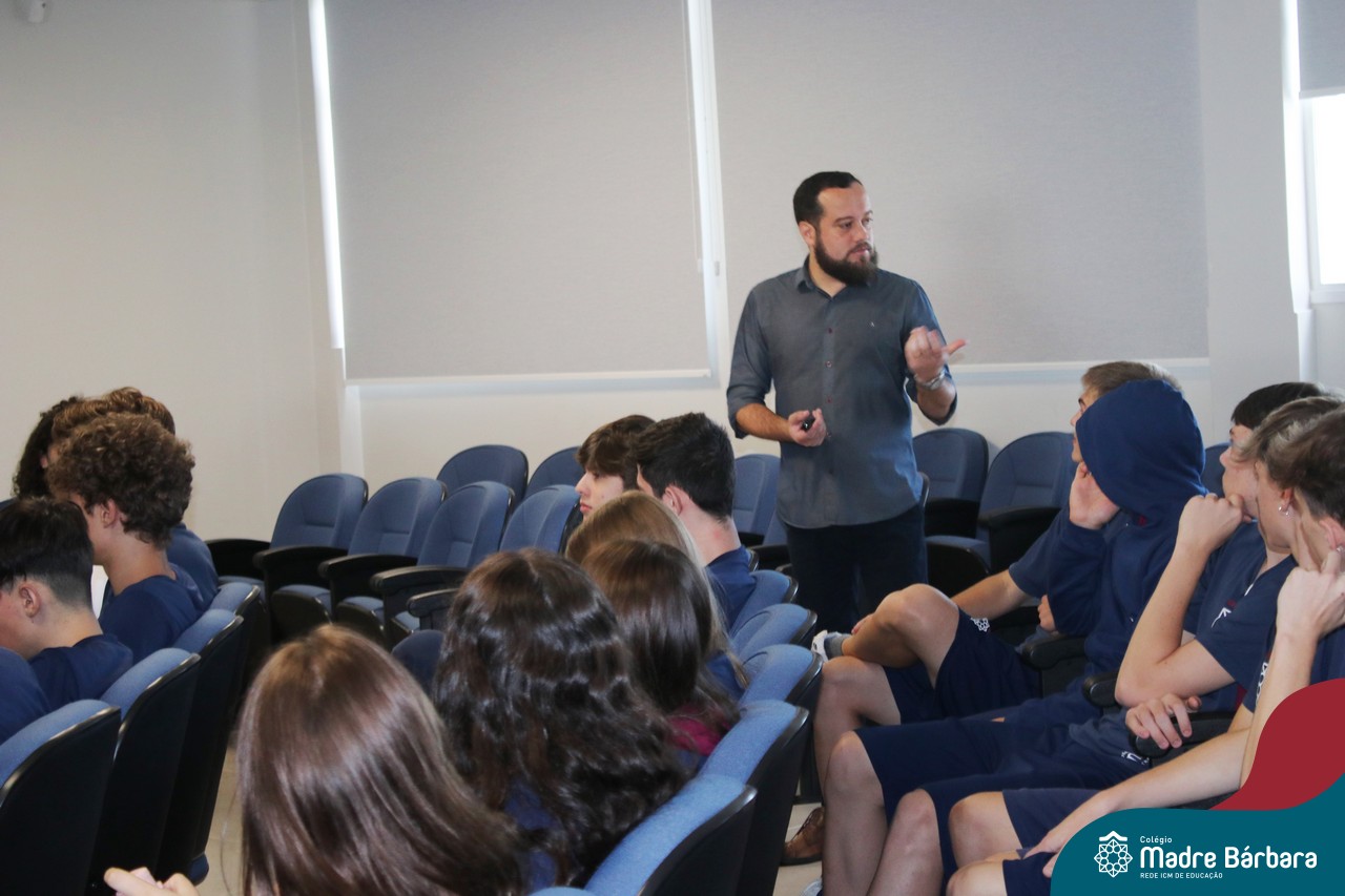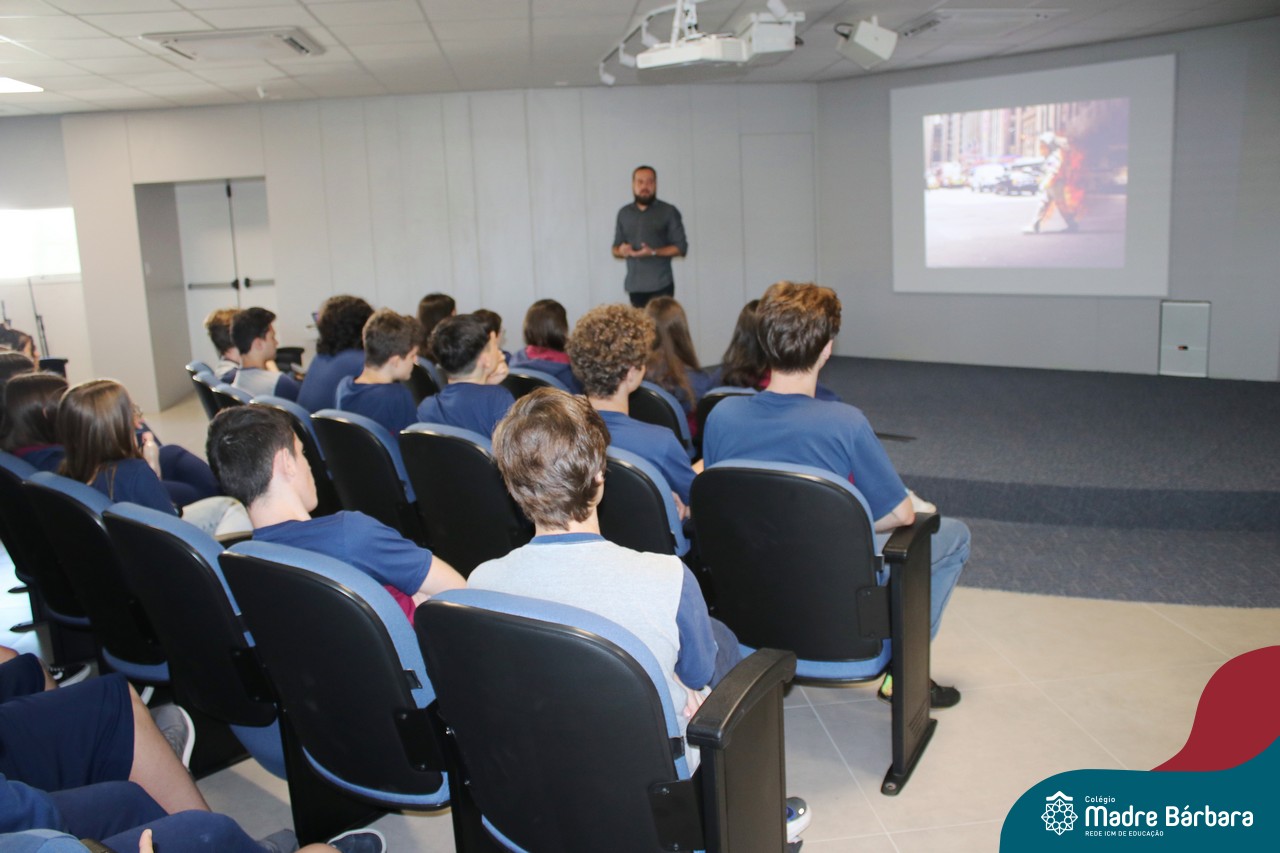 Na manhã dessa segunda-feira (10.04), os estudantes das turmas 201 e 202 do Ensino Médio do Colégio Madre Bárbara – Rede ICM – participaram de um momento com o jornalista Marcus Staudt, professor do Curso de Comunicação Social da Univates, sobre produção audiovisual e edição de vídeos. Os estudantes puderam tirar dúvidas e entender sobre o processo de produção, gravação e edição dos curtas cinematográficos para o XIII  Festival de Cinema, que terá como tema “Comédias da vida real”. O Festival é coordenado pela professora Francieli Winck.