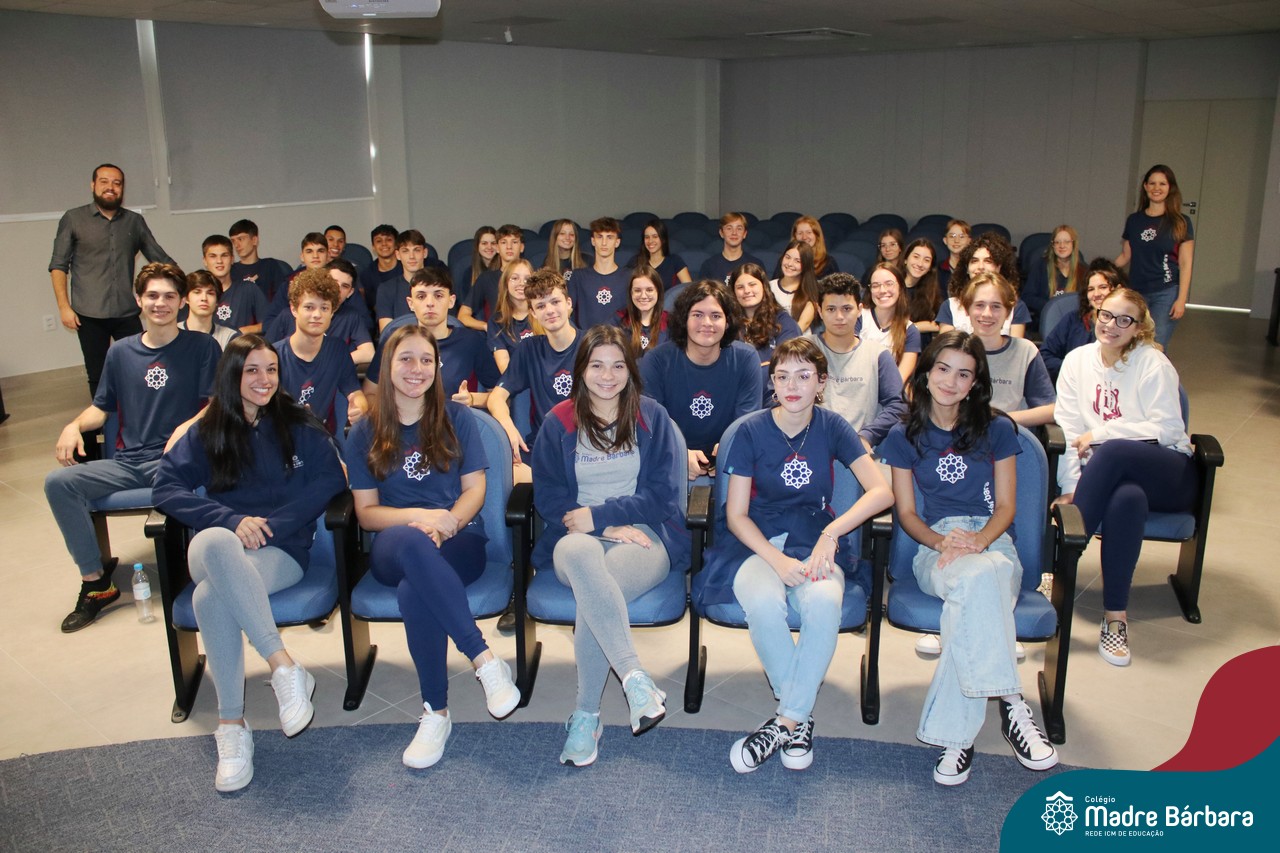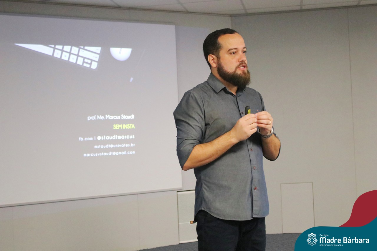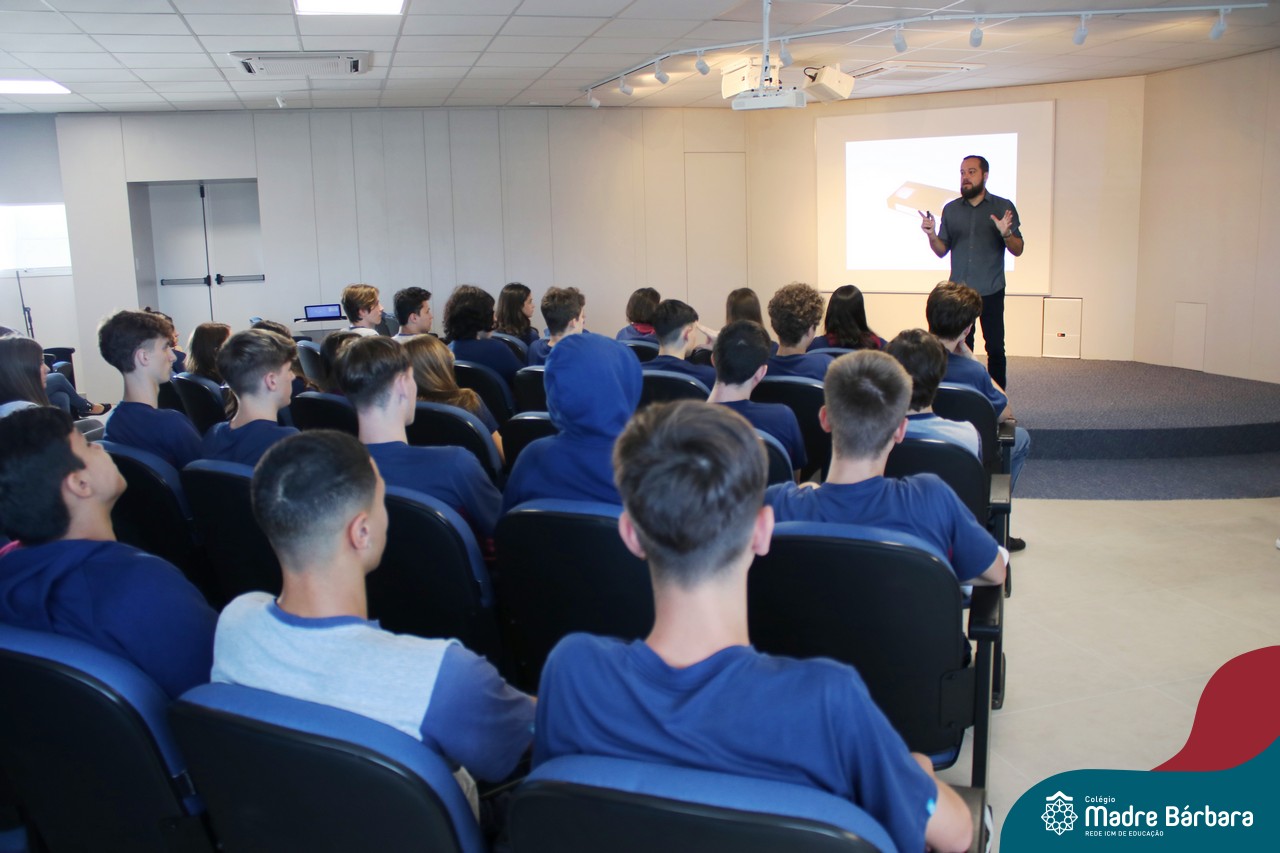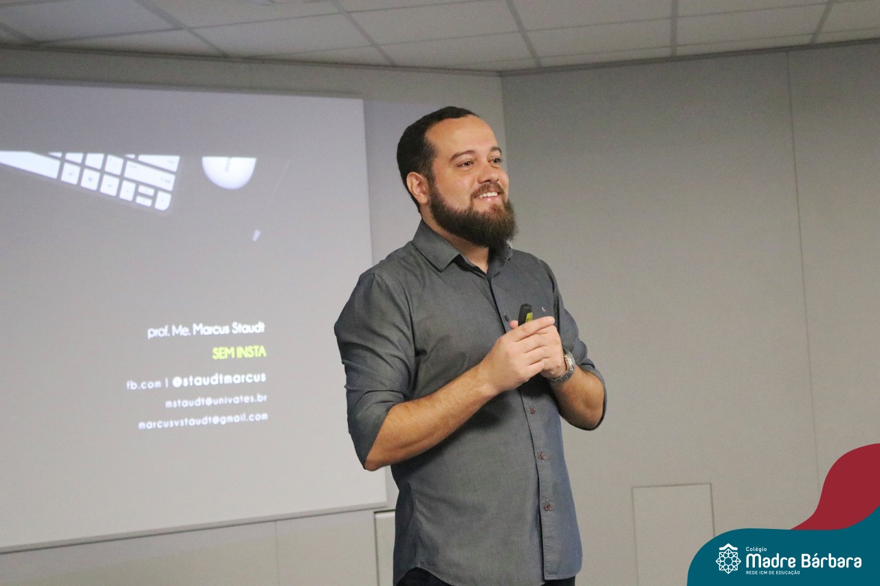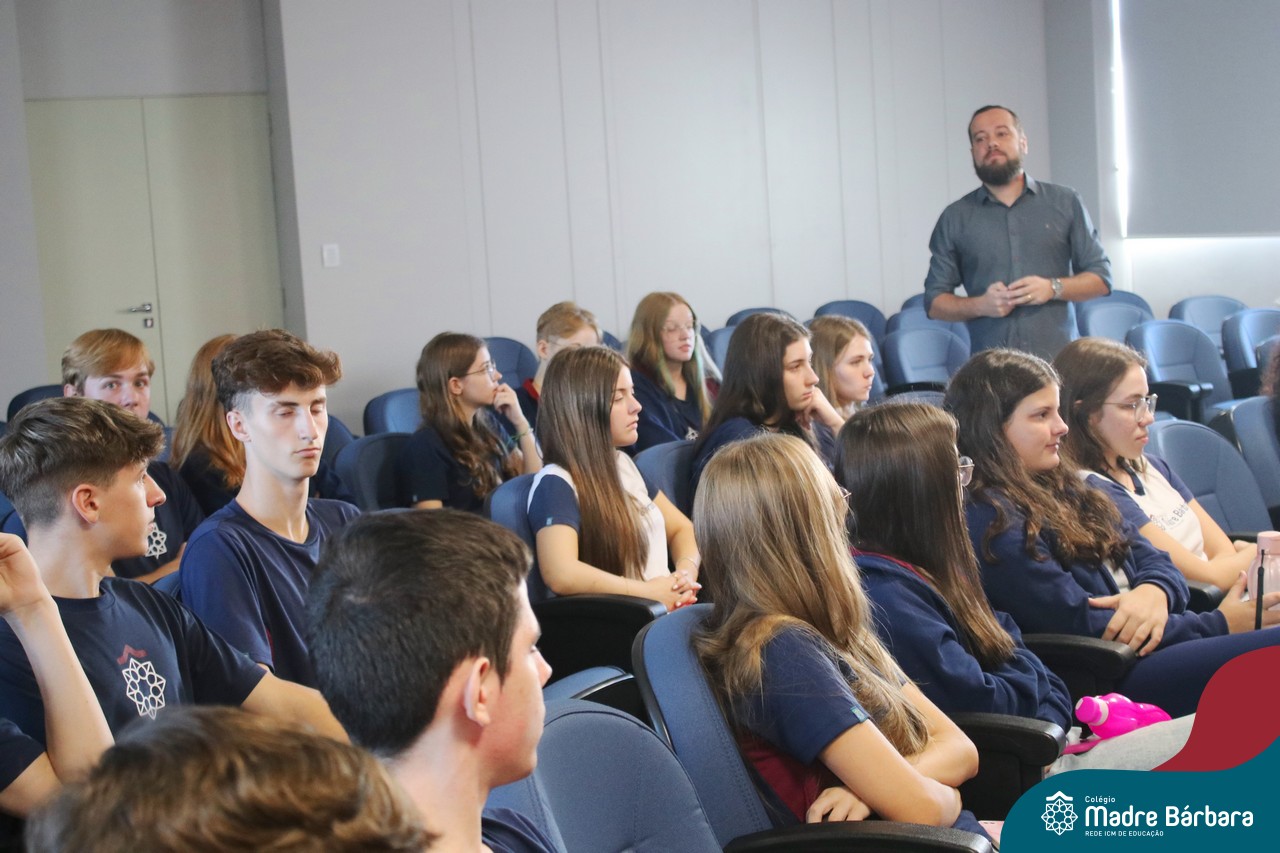 Na manhã dessa segunda-feira (10.04), os estudantes das turmas 201 e 202 do Ensino Médio do Colégio Madre Bárbara – Rede ICM – participaram de um momento com o jornalista Marcus Staudt, professor do Curso de Comunicação Social da Univates, sobre produção audiovisual e edição de vídeos. Os estudantes puderam tirar dúvidas e entender sobre o processo de produção, gravação e edição dos curtas cinematográficos para o XIII  Festival de Cinema, que terá como tema “Comédias da vida real”. O Festival é coordenado pela professora Francieli Winck.