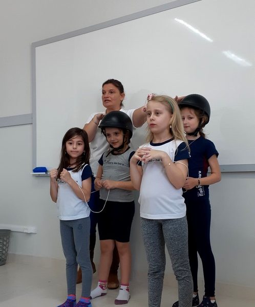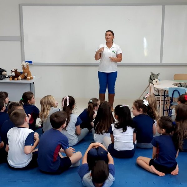 Na última quinta-feira (24.10) a turma 14 recebeu a visita da fisioterapeuta e equoterapeuta Olga Bonh Martins, que possui o Instituto Lado a Lado Equoterapia, localizado em Cruzeiro do Sul. Foi muito emocionante as técnicas utilizadas com os alunos que participaram ativamente fazendo muitos questionamentos e aprofundando seus conhecimentos já estudados em sala de aula com a professora Caroline Bozzetto e Monitora Júlia. A mensagem que mais nos inspirou foi: Equoterapia não é só montar. Aproximar, tocar e observar o cavalo, sempre acompanhado de um profissional, estimula a parte sensorial e desenvolve a confiança, o cérebro, a respiração, o cuidado, a paciência, o afeto, além de muitos outros benefícios.