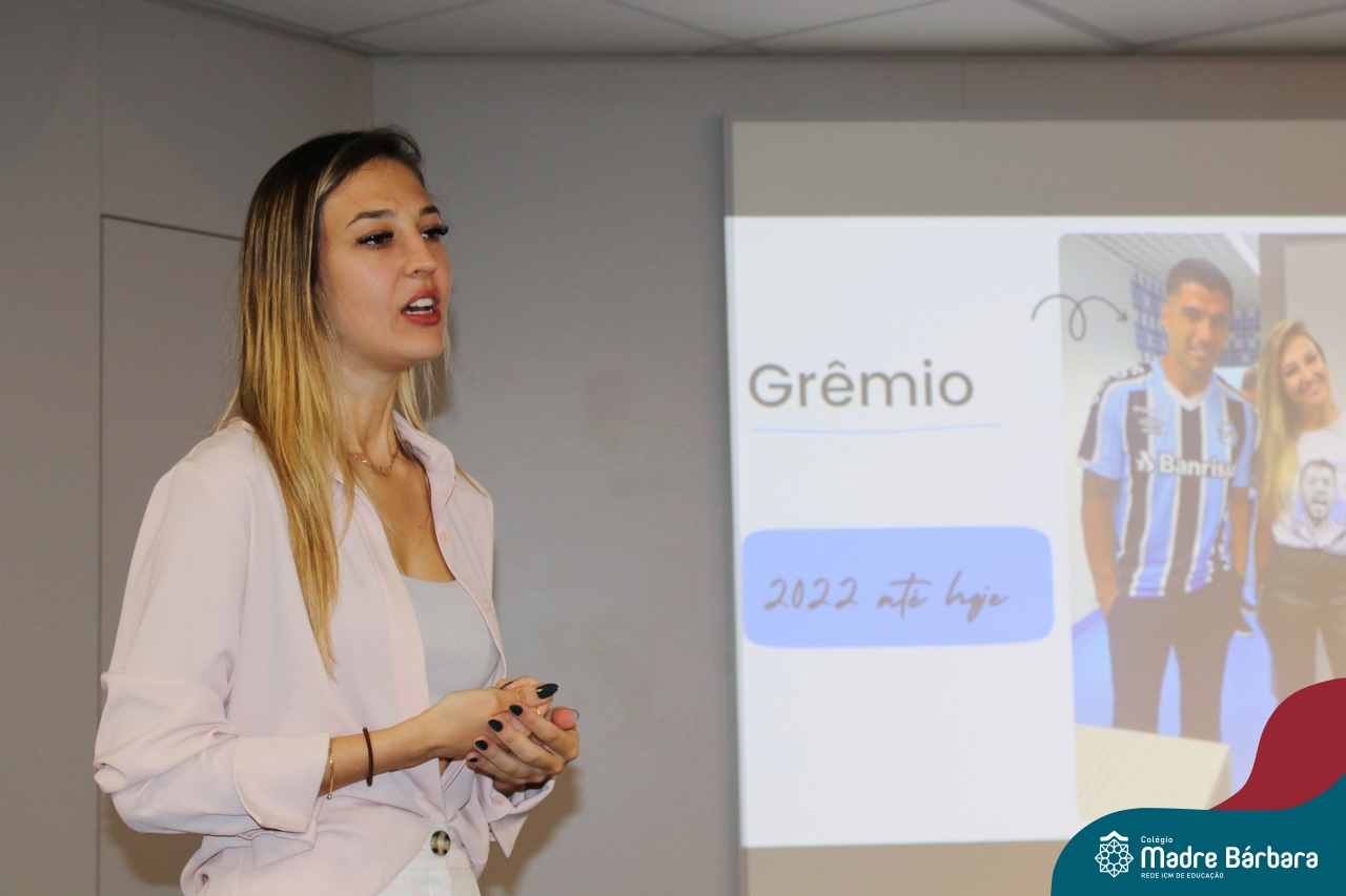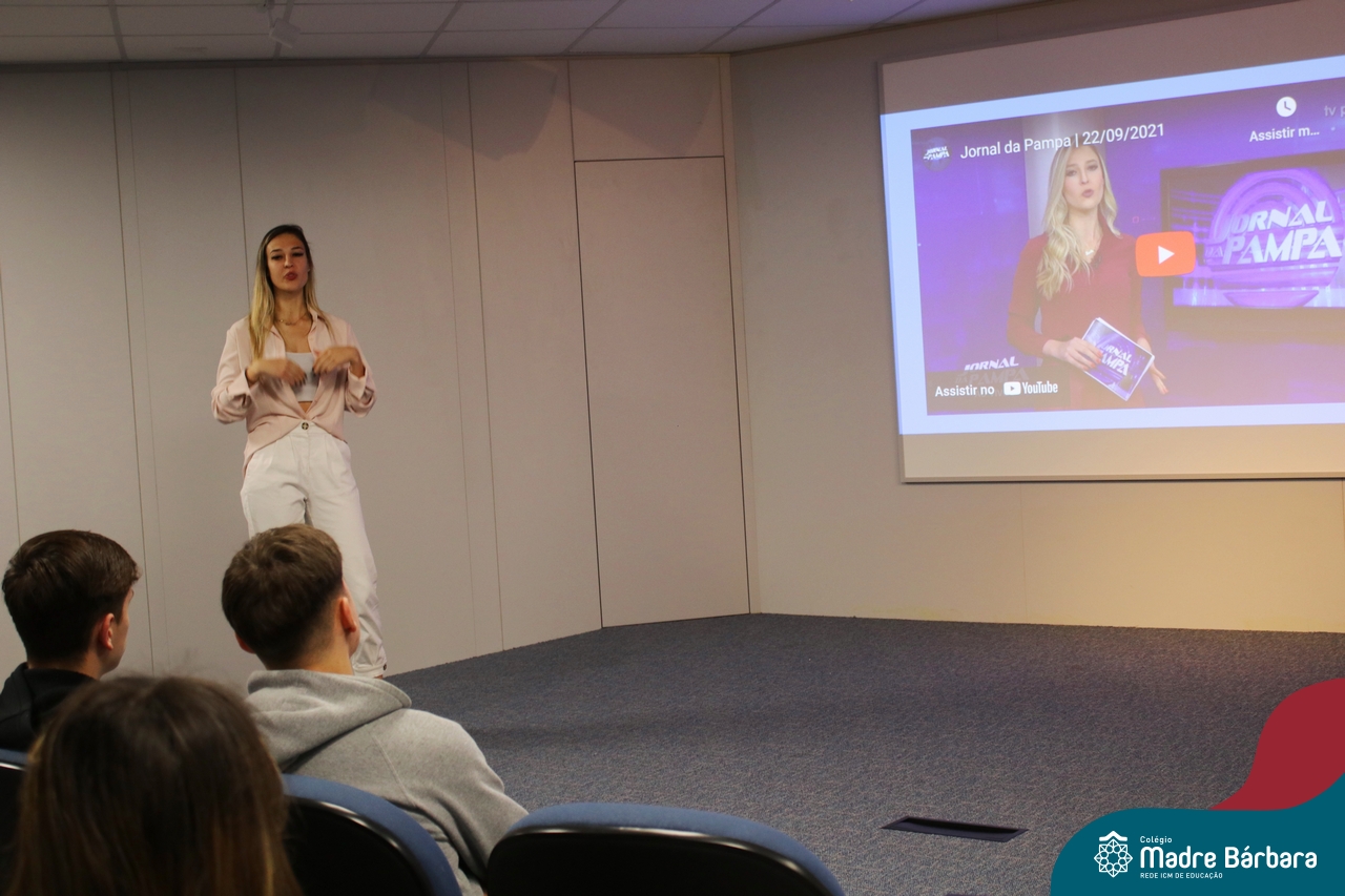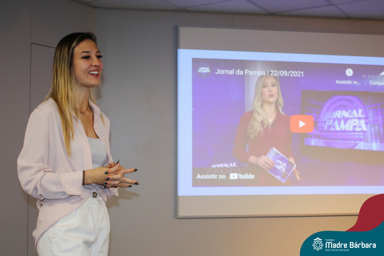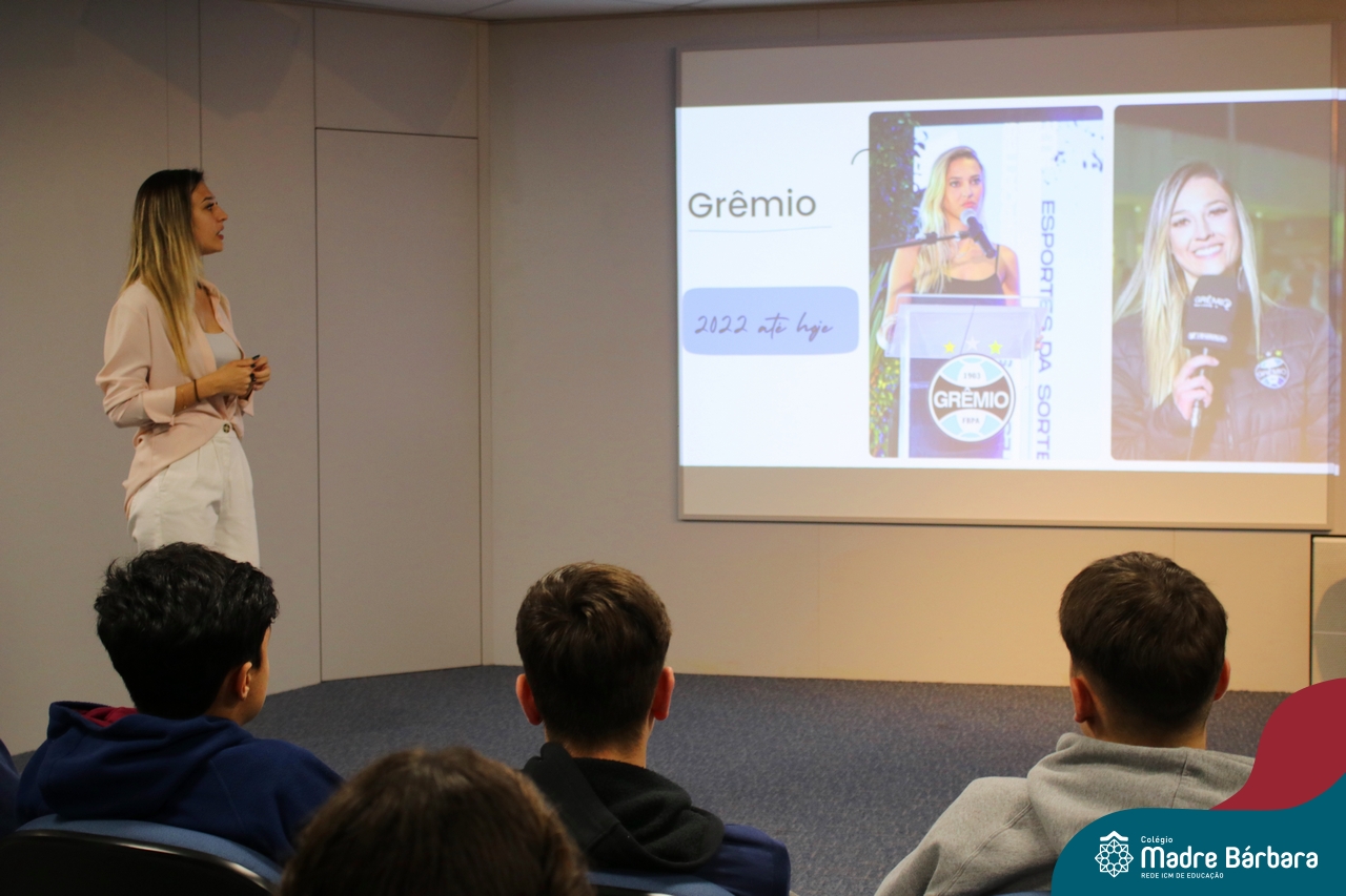 A jornalista Bárbara Assmann compartilhou, nesta manhã de quarta-feira, dia 04.10, suas experiências acadêmicas e profissionais com os alunos do Itinerário de Jornalismo Digital. Bárbara, ex-aluna do Colégio Madre Bárbara, relatou o quanto a sua paixão por esportes a conduziu ao curso de Jornalismo, além de relatar suas experiências na área de escrita de matérias jornalísticas, repórter, apresentadora de noticiário e assessora de comunicação. Atualmente, Bárbara é social media do Grêmio Futebol Clube. O momento se constituiu não só como uma oportunidade de conhecer o mundo do Jornalismo, como também de refletir sobre as escolhas profissionais de nossos alunos e aspectos a serem levados em consideração nesse momento.