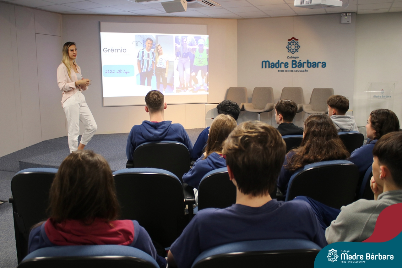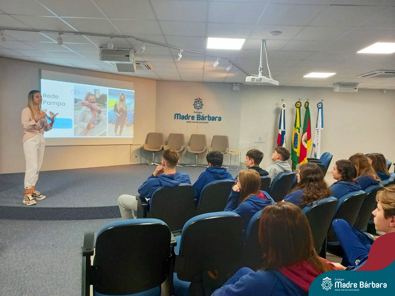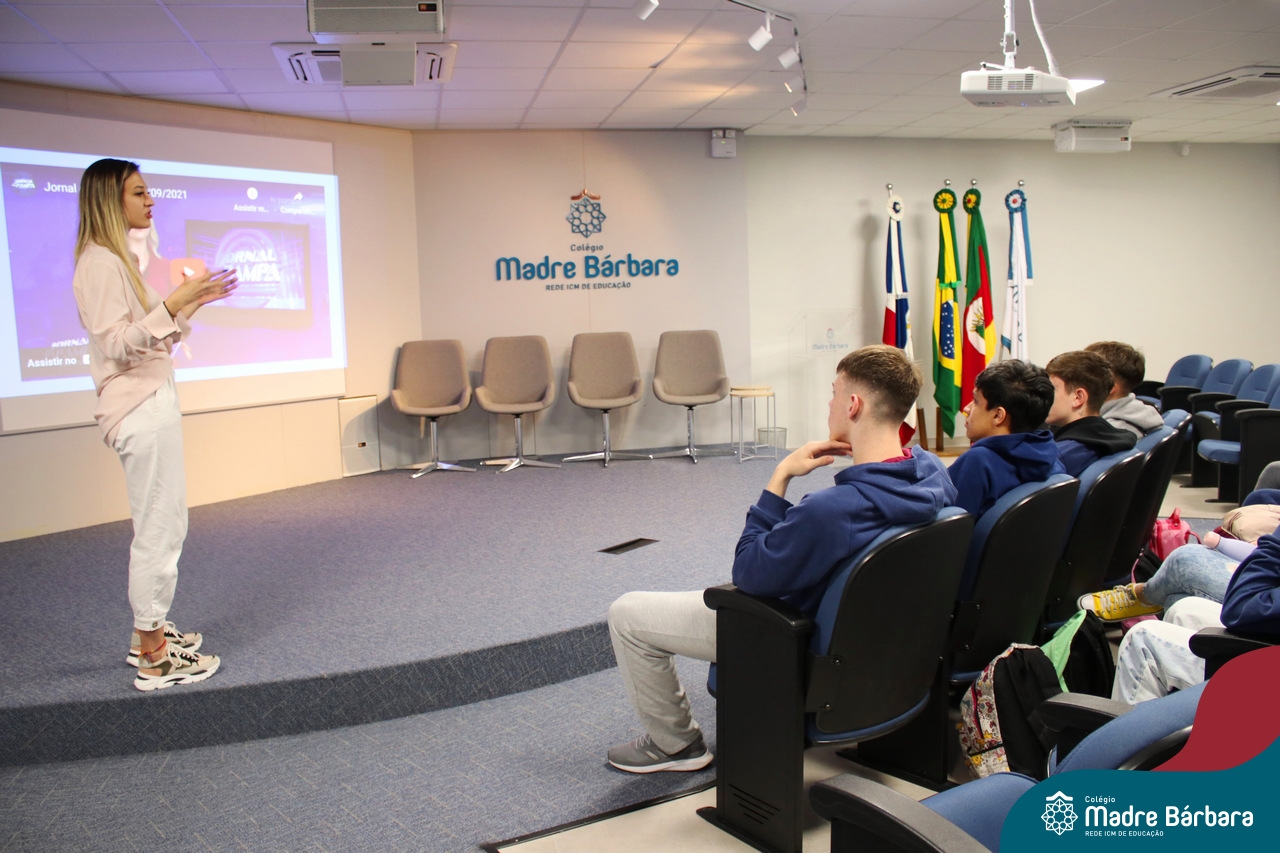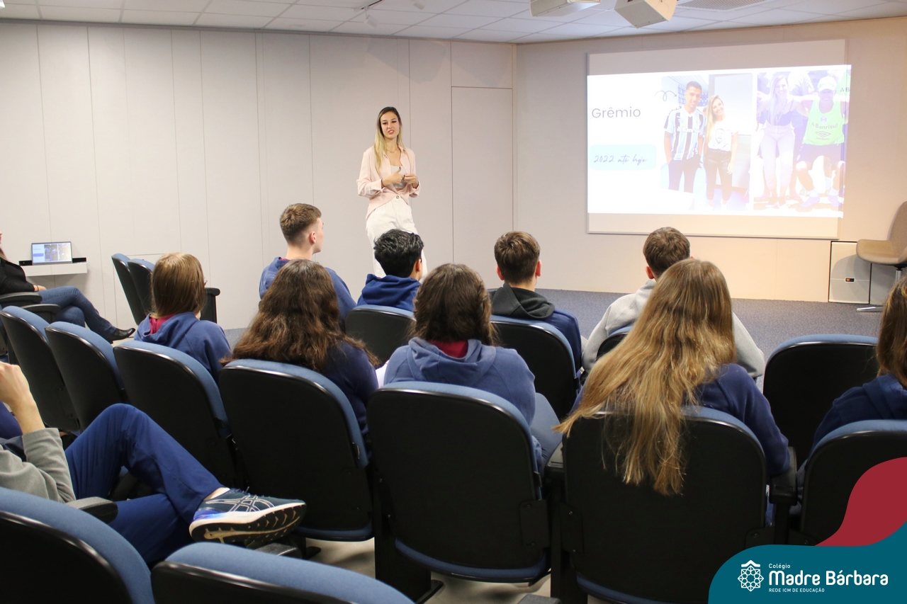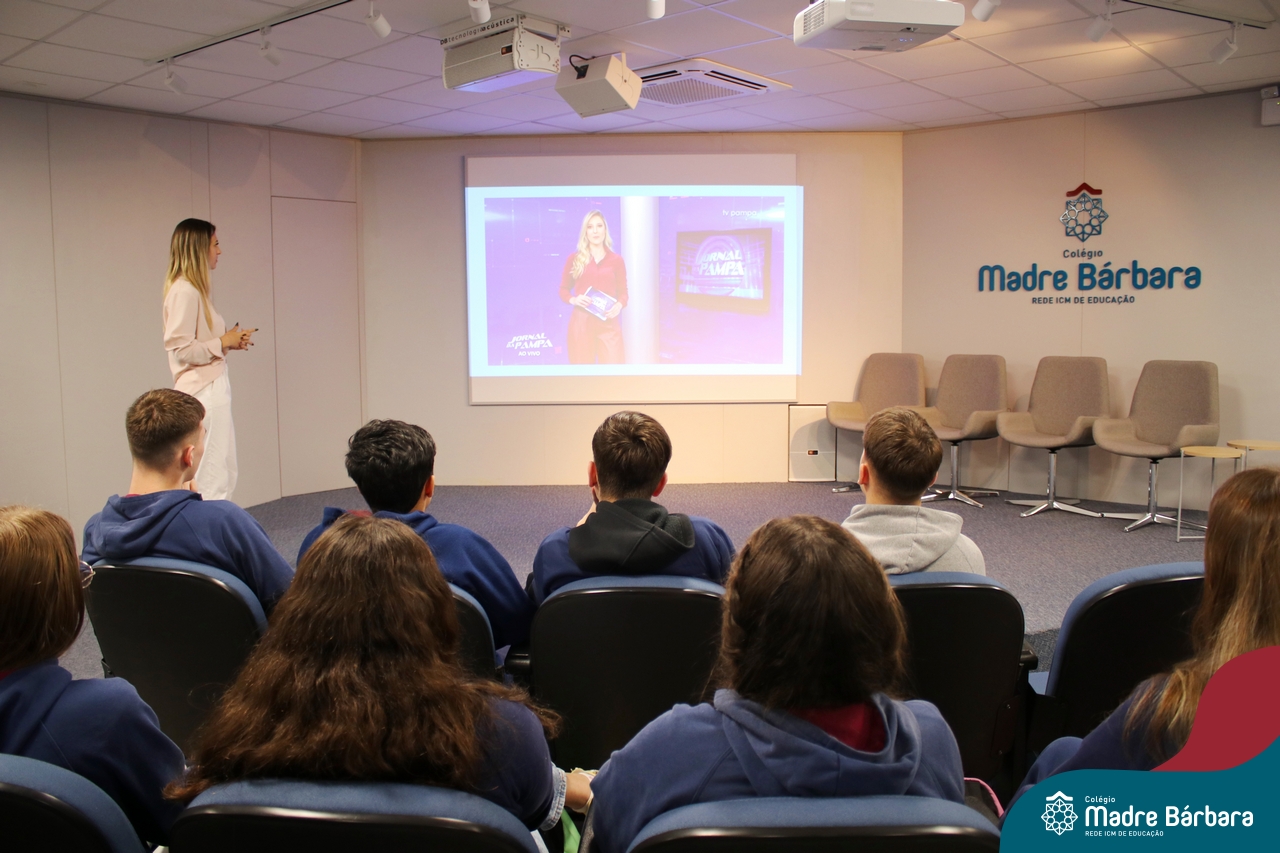 A jornalista Bárbara Assmann compartilhou, nesta manhã de quarta-feira, dia 04.10, suas experiências acadêmicas e profissionais com os alunos do Itinerário de Jornalismo Digital. Bárbara, ex-aluna do Colégio Madre Bárbara, relatou o quanto a sua paixão por esportes a conduziu ao curso de Jornalismo, além de relatar suas experiências na área de escrita de matérias jornalísticas, repórter, apresentadora de noticiário e assessora de comunicação. Atualmente, Bárbara é social media do Grêmio Futebol Clube. O momento se constituiu não só como uma oportunidade de conhecer o mundo do Jornalismo, como também de refletir sobre as escolhas profissionais de nossos alunos e aspectos a serem levados em consideração nesse momento.
