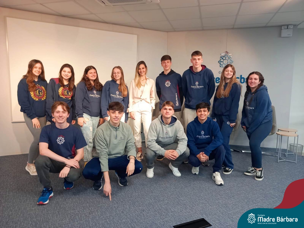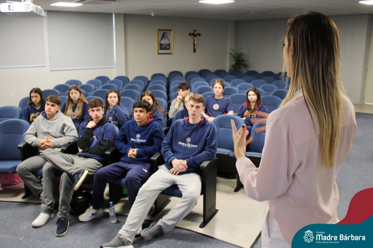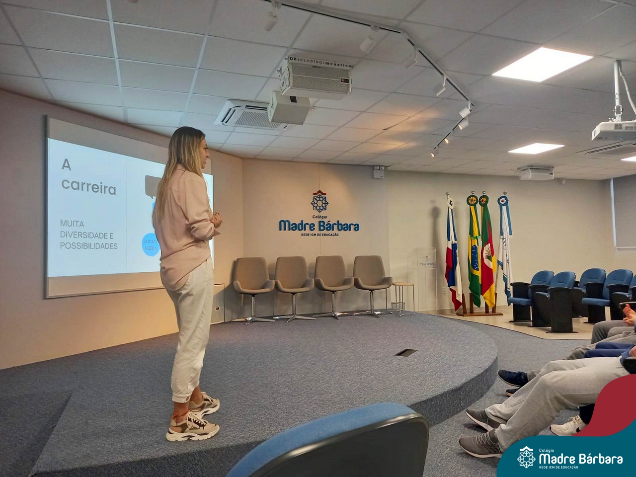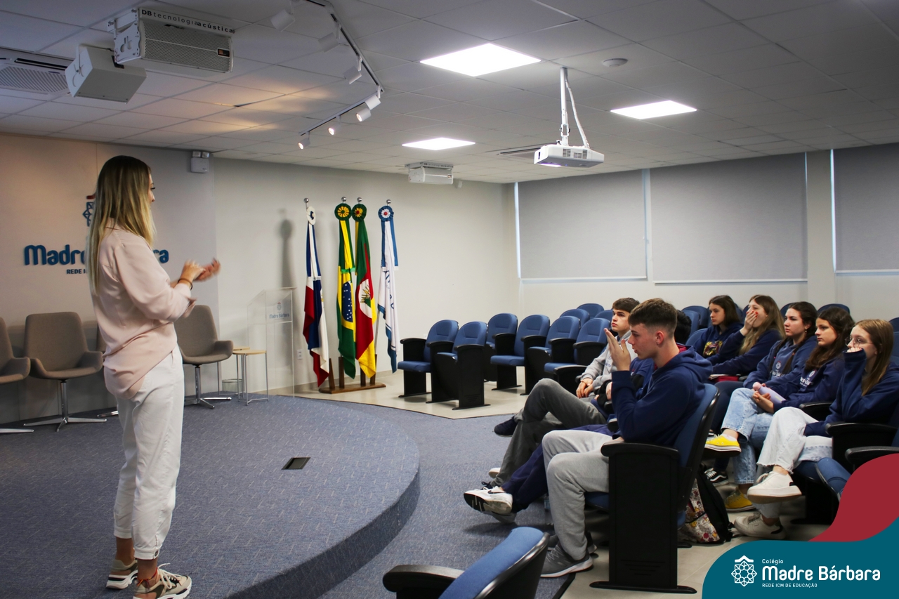 A jornalista Bárbara Assmann compartilhou, nesta manhã de quarta-feira, dia 04.10, suas experiências acadêmicas e profissionais com os alunos do Itinerário de Jornalismo Digital. Bárbara, ex-aluna do Colégio Madre Bárbara, relatou o quanto a sua paixão por esportes a conduziu ao curso de Jornalismo, além de relatar suas experiências na área de escrita de matérias jornalísticas, repórter, apresentadora de noticiário e assessora de comunicação. Atualmente, Bárbara é social media do Grêmio Futebol Clube. O momento se constituiu não só como uma oportunidade de conhecer o mundo do Jornalismo, como também de refletir sobre as escolhas profissionais de nossos alunos e aspectos a serem levados em consideração nesse momento.