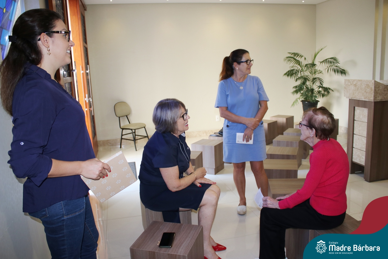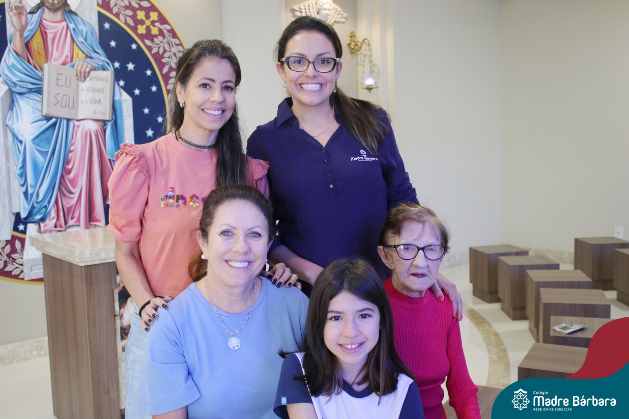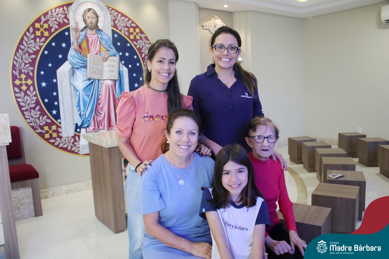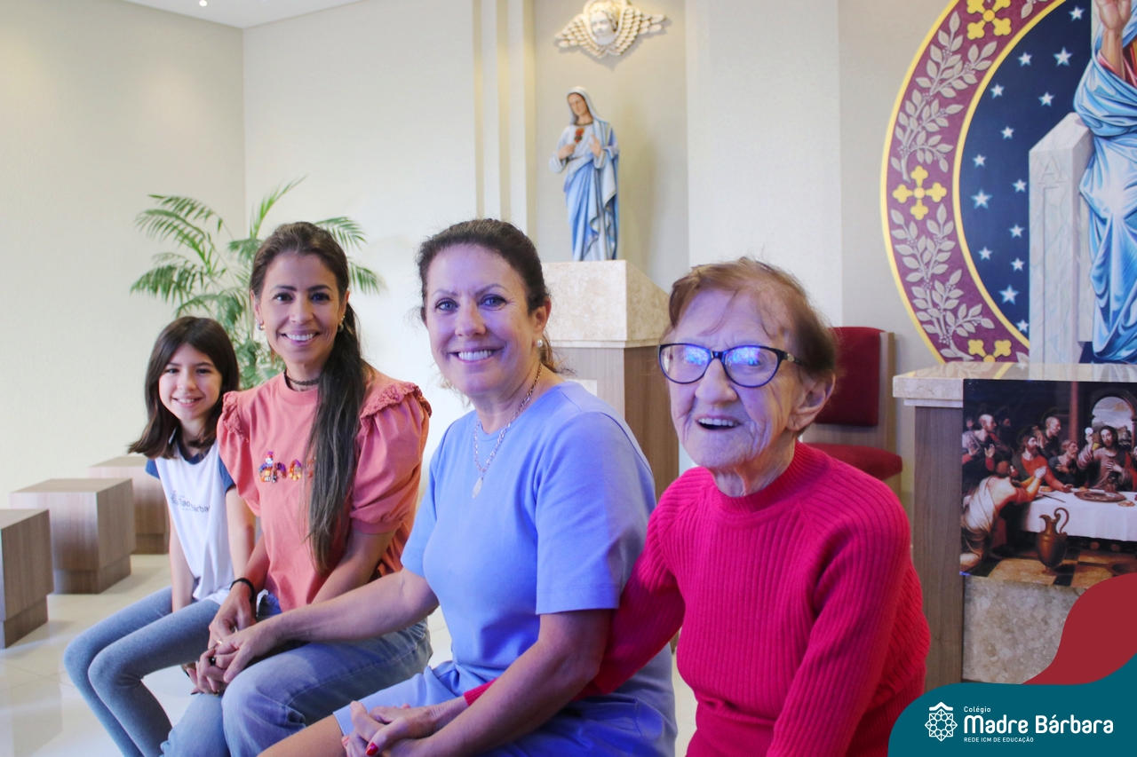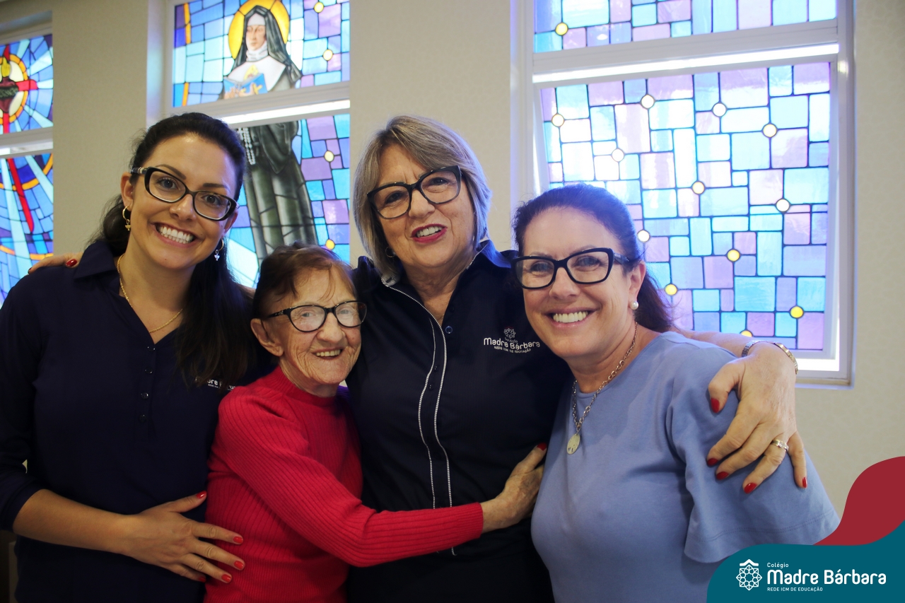Na manhã dessa terça-feira (11.04) a ex-aluna Maria Laíre Ruchel de 86 anos, esteve visitando o Colégio Madre Bárbara – Rede ICM e relembrando os momentos que viveu na instituição, até a sua formatura no magistério, em 1960. Além de rever os espaços, dona Laíre, que veio acompanhada da filha Marilene, encontrou as netas Marília e Déborah e os bisnetos Amália (10), Miguel (6) e Teodoro (3). Todas as gerações estudaram e estudam no Madre Bárbara. Foi um momento especial para rever o local onde foi tão feliz e também estar reunida com a família, recordando e vendo as netas e os bisnetos, que tanto ama. A diretora Maria Elena Jacques e a Irmã Íris fizeram uma acolhida calorosa a Laíre, revendo um álbum com fotos da formatura no Colégio. A ex-aluna é avó da professora do 1º ano do Ensino Fundamental – Anos Iniciais, Marília Junqueira Marmitt. Foi especial sua visita e alegria, dona Laíre, volte sempre!