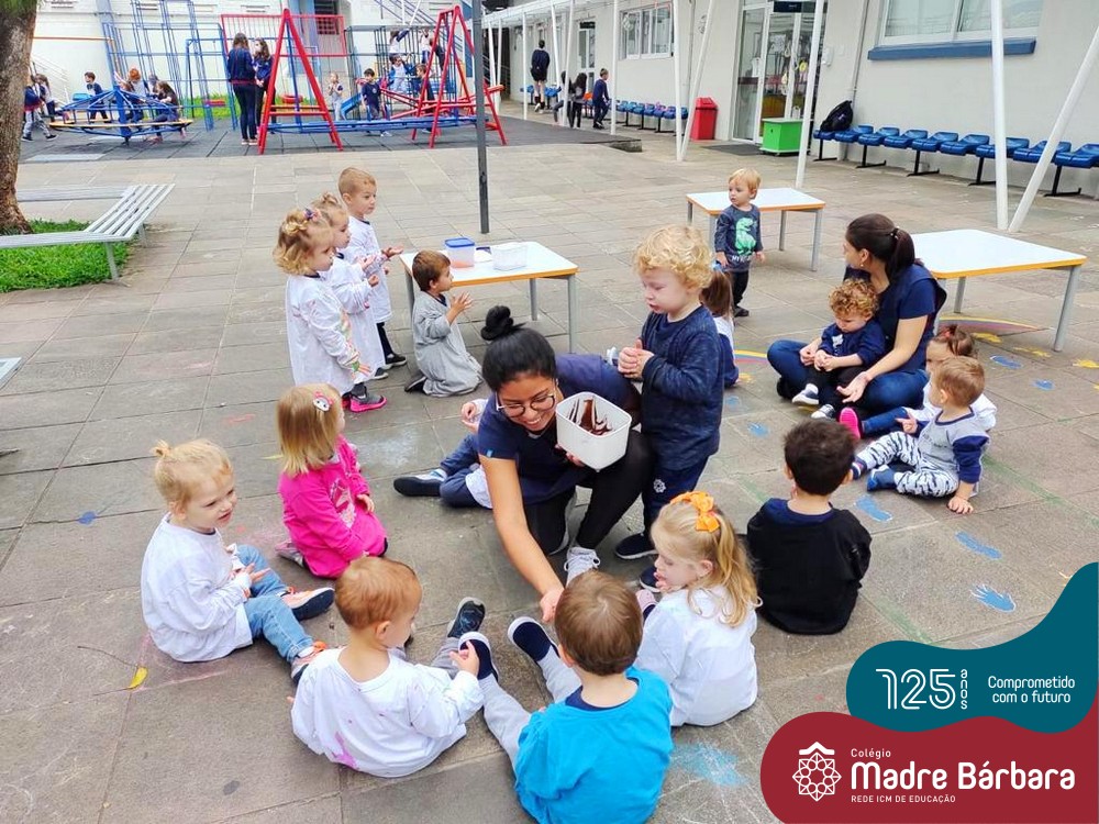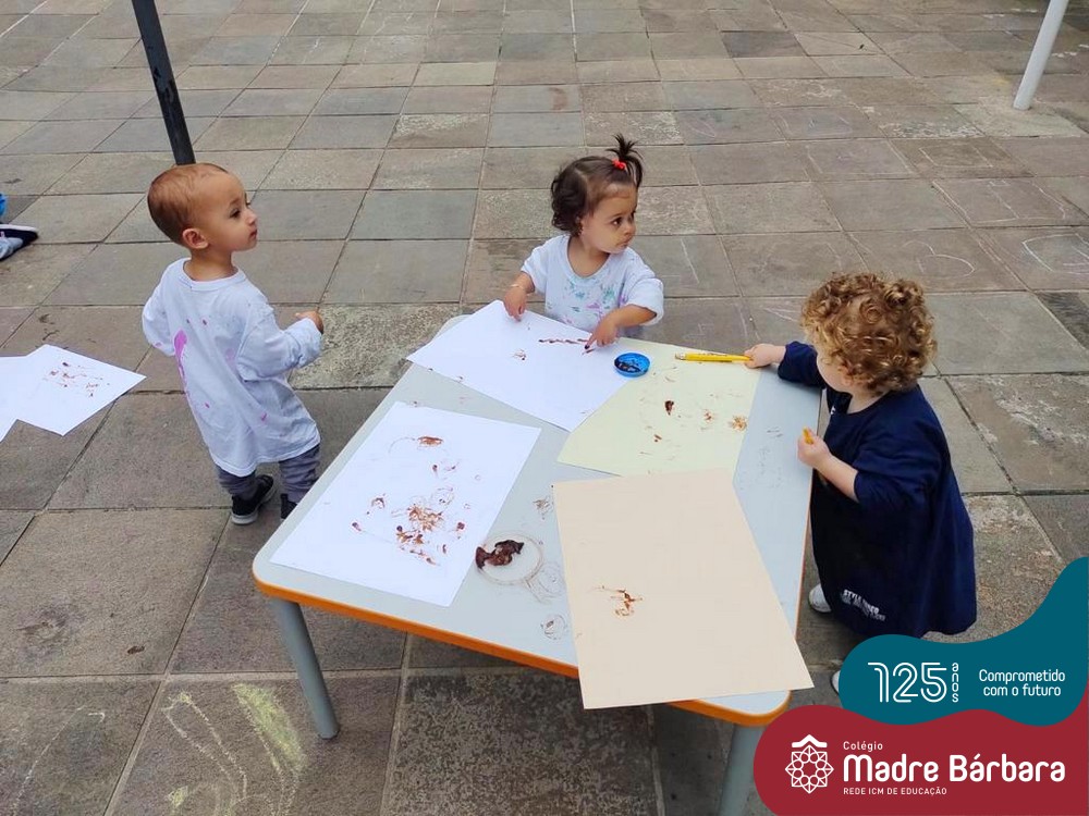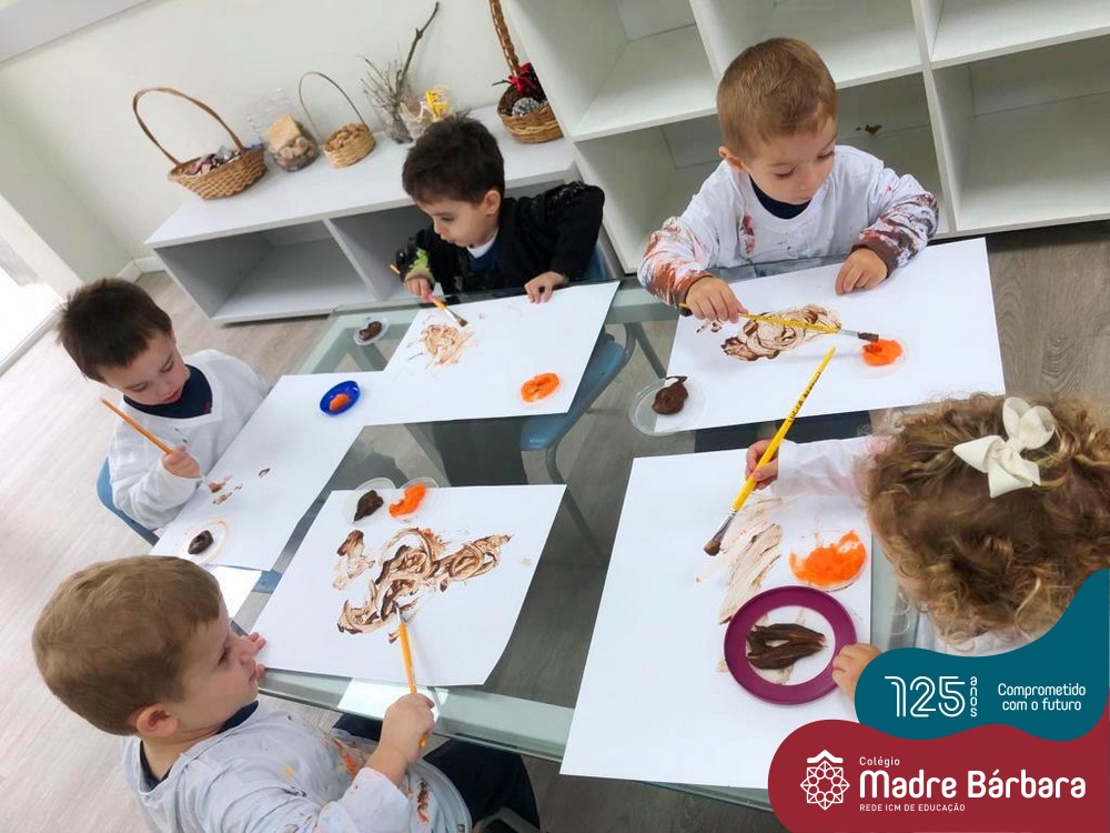 Na semana que antecede a Páscoa, as crianças das turmas do nível 2B e 1C vivenciaram a exploração de tintas naturais. Tinta de Cacau e de cenoura foram as escolhidas para entrarem no clima da Páscoa. Sentir o cheiro, o gosto e a textura foram algumas das descobertas feitas pelos pequenos, que além de expressarem diferentes sensações, se divertiram muito.