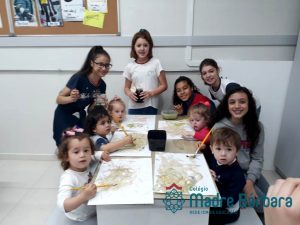 Dando sequência ao projeto “Explorando e divertindo-se com cores e texturas” na última quinta-feira (27.09) as crianças do nível 1D-tarde tiveram um momento de integração com alunos da turma 61 na sala de artes. Os alunos prepararam junto com a professora de artes Vanderleia Freitas Dos Santos as tintas naturais, utilizando pigmentos líquidos que deixaram em infusão no álcool, de molho na água ou os ferveram. Tudo foi preparado uma semana antes para soltar tinta e experimentaram com amostras. A vivência com as crianças do nível 1D foram com as tintas naturais de: erva, tijolo, terra, que foram misturados com água e cola, pois são pigmentos em pó. Líquidos: repolho roxo, feijão preto, chás variados, sucos e pétalas de flores variadas. Exploraram também a tinta de café, vinho, beterraba, carvão moído misturado com água e cola. Este momento foi muito significativo, recheado de aprendizagens.