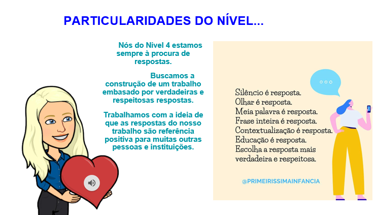 A partir do desafio de apresentar às Professoras e Coordenação através de uma ferramenta explorada na Formação da For Education, como os Níveis da Educação Infantil do Colégio Madre Bárbara – Rede ICM estavam se organizando durante o Ensino Remoto, as professoras dos Níveis 4, utilizaram a ferramenta do Google Apresentações. Neste recurso, colocaram cenários escolares e seus avatares criados no aplicativo Bitmoji. Em seguida, fizeram gravações de áudios que, ao clicarem, reproduziam a fala das professoras. A apresentação, ocorreu em uma Reunião Pedagógica.