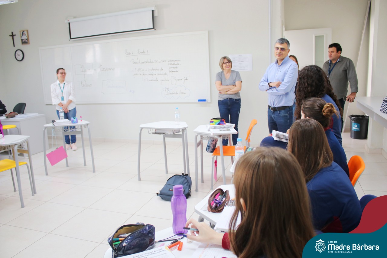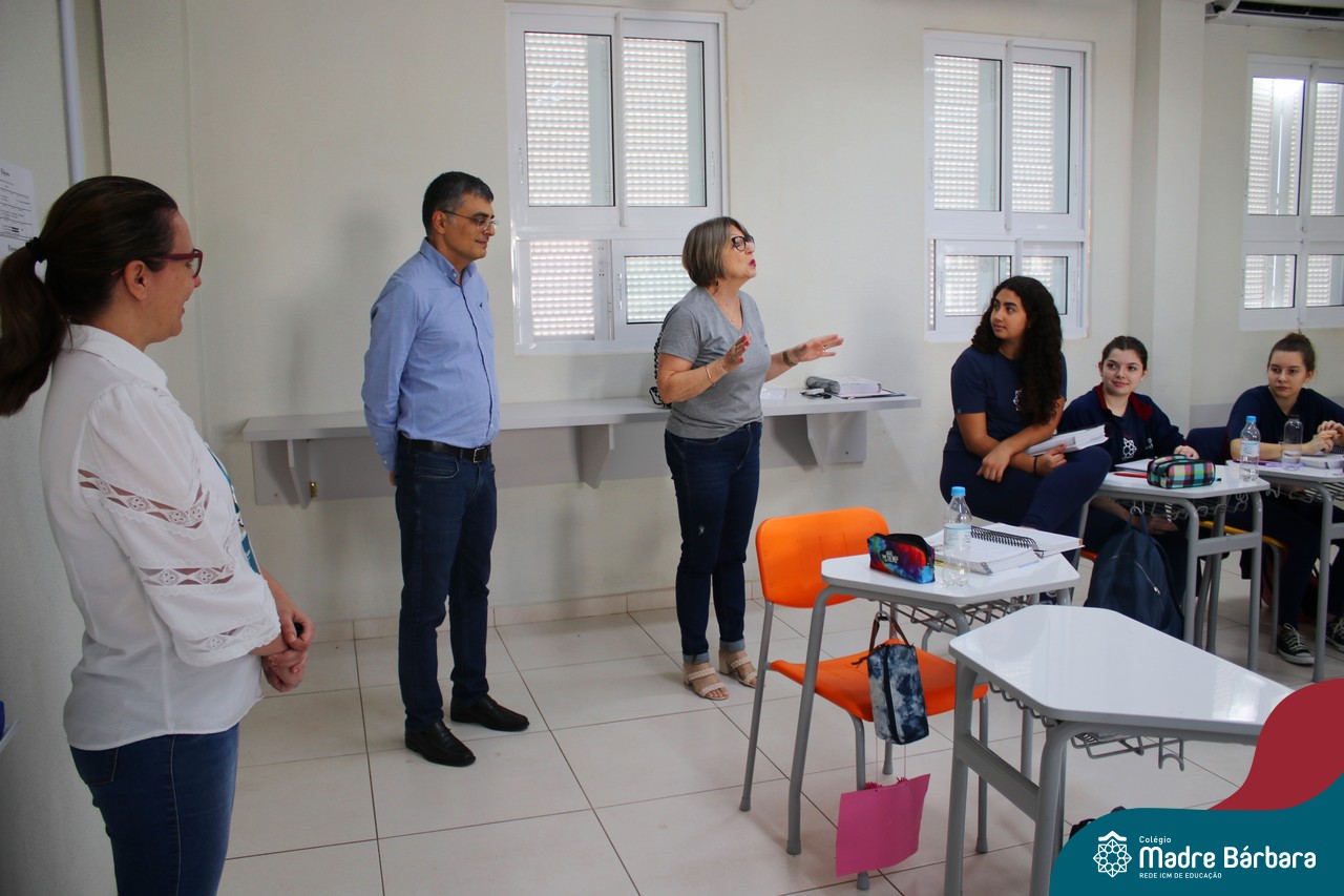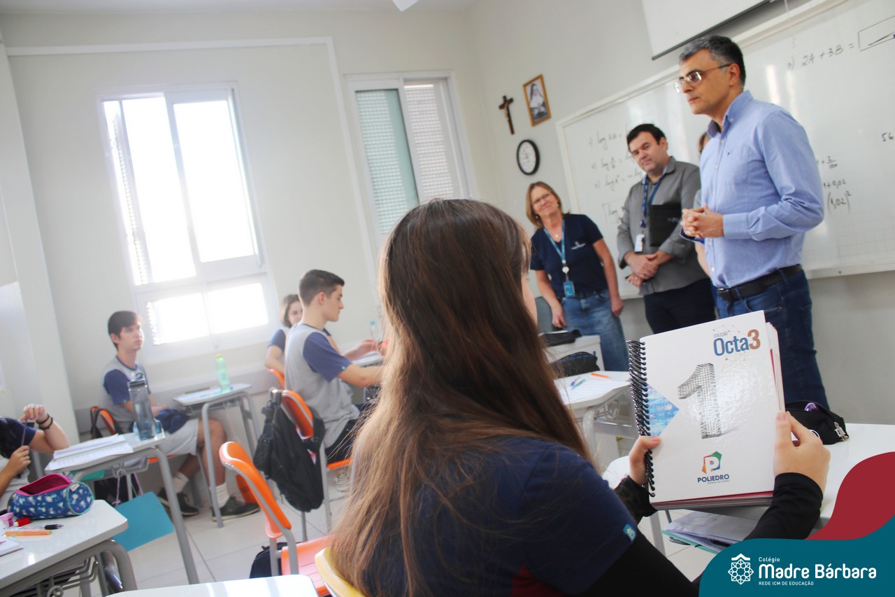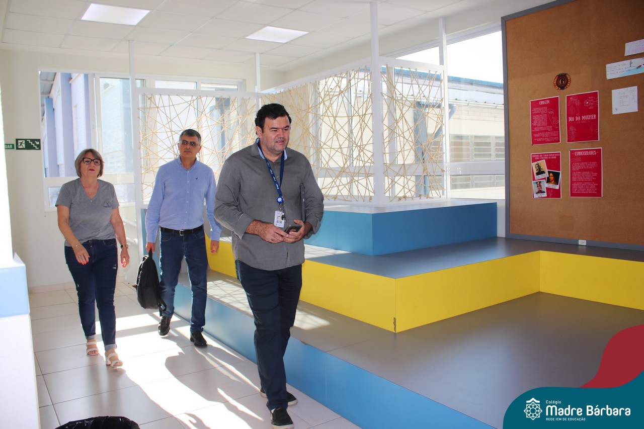 Na manhã desta terça-feira (28.03) o Colégio Madre Bárbara – Rede ICM recebeu a visita do Fundador/mantenedor das unidades Poliedro e Sistema de Ensino, Nicolau Sarkis e do coordenador pedagógico do Sistema de Ensino, Mateus Duarte. Acompanhados da diretora Maria Elena Jacques e da coordenadora pedagógica Justine Thomas, puderam conhecer a estrutura do Madre Bárbara e também algumas turmas para conversar com os estudantes sobre o Sistema, escutando os adolescentes sobre a visão que tem do Poliedro.
