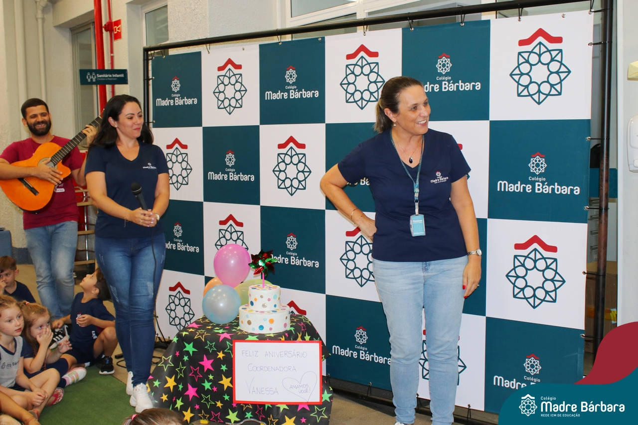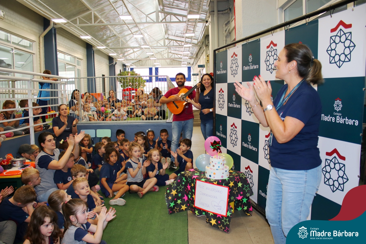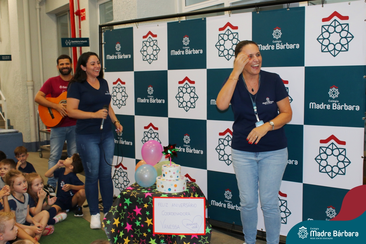 Hoje foi dia de festa na Educação Infantil. Nesta terça-feira, dia 5 de março, a Coordenadora Pedagógica, Vanessa Ely, comemorou seu aniversário com as crianças da Educação Infantil. Todos reunidos para as surpresas, tanto no turno da manhã quando da tarde, para um parabéns especial e entrega de mimos personalizados, cheios de carinho e amor. No turno da manhã, a professora Marta Lorde esteve junto recebendo parabéns e o carinho das crianças, pois também comemora seu aniversário neste dia! Feliz aniversário, que Bárbara Maix e Deus abençoe sempre a vida de vocês com muita saúde! Sigam amando o que fazem em nosso Colégio Madre Bárbara!