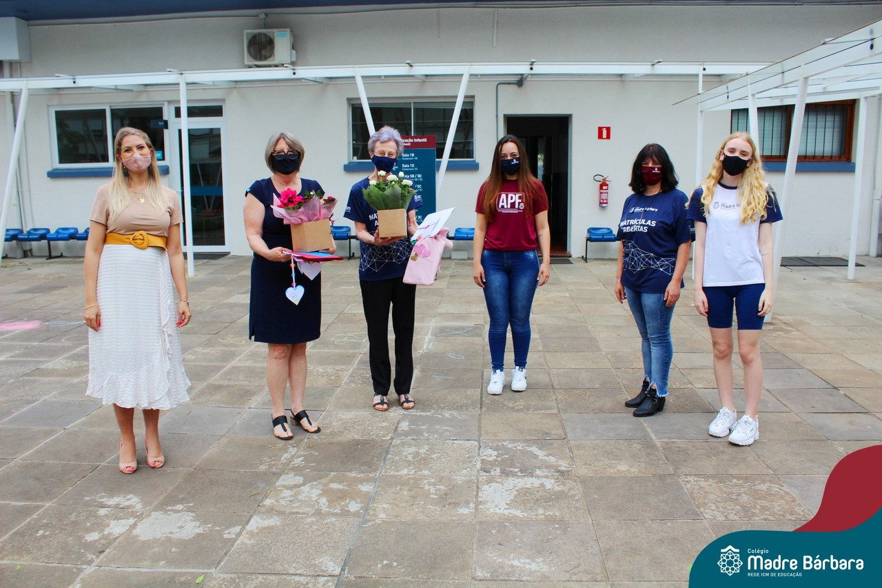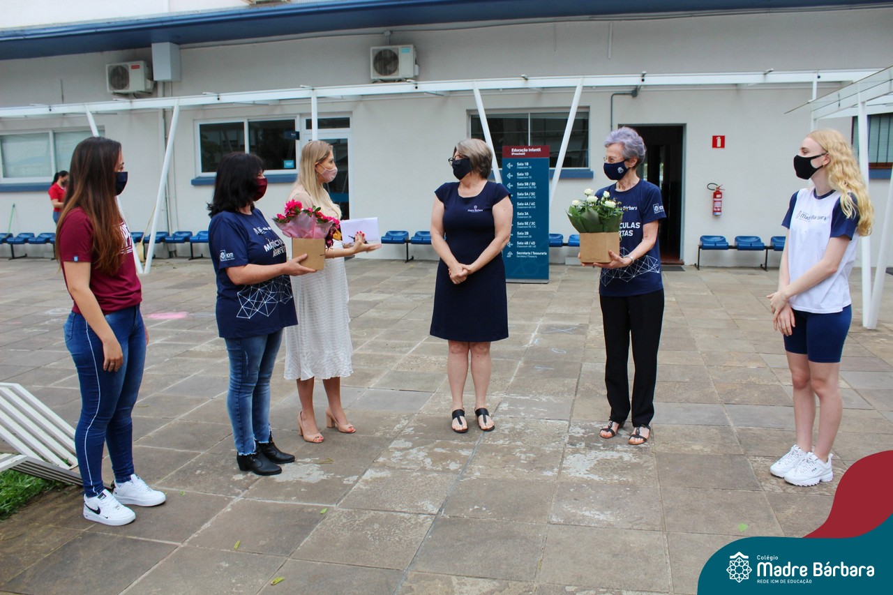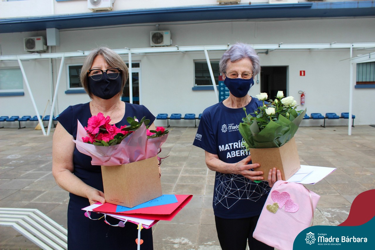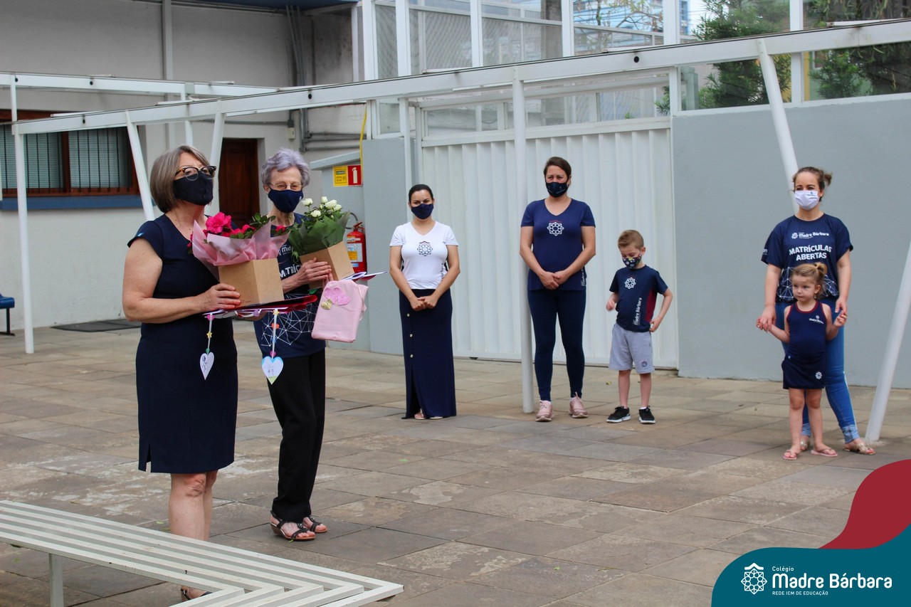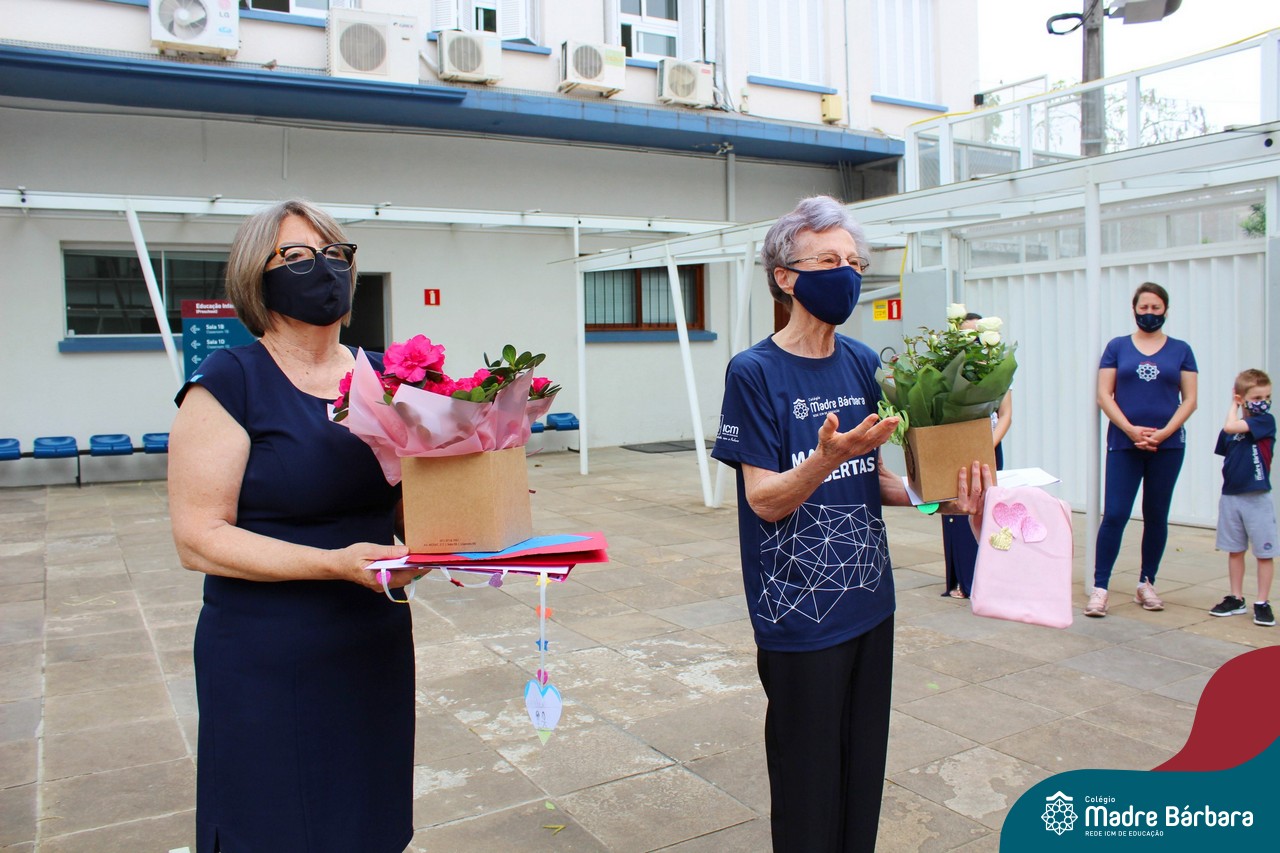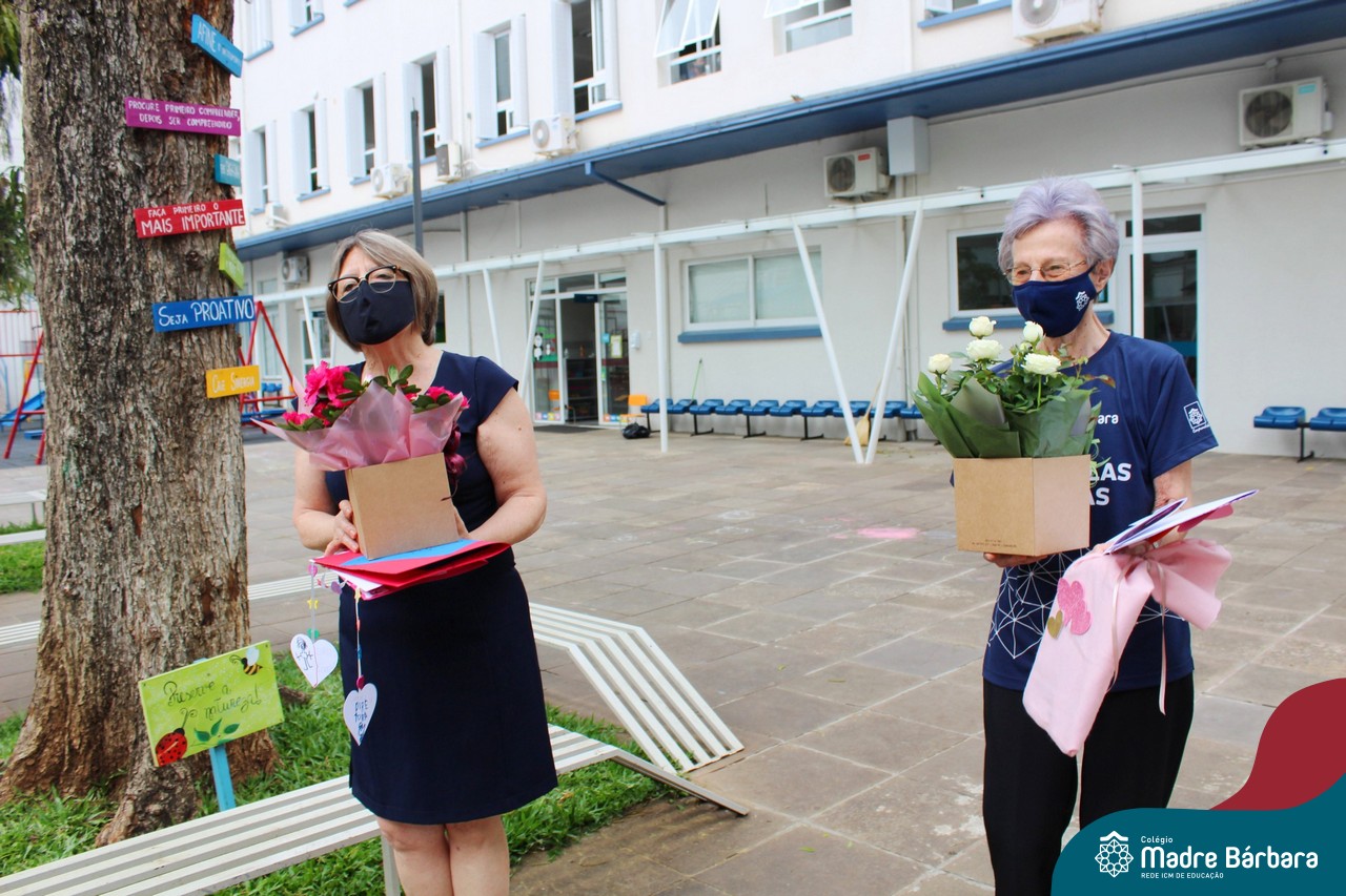 Nesta quinta-feira (12) representantes de alunos, pais, professores, funcionários e equipe diretiva estiveram homenageando a diretora Maria Elena Jacques e a vice-diretora Irmã Anita Dal Piva pelo Dia do Diretor. A ação ocorreu no pátio da educação infantil, de forma reduzida devido a pandemia e também com todos os protocolos de segurança. Parabéns diretora e vice-diretora! Obrigada por servirem ao Colégio Madre Bárbara – Rede ICM com tanto amor e dedicação.