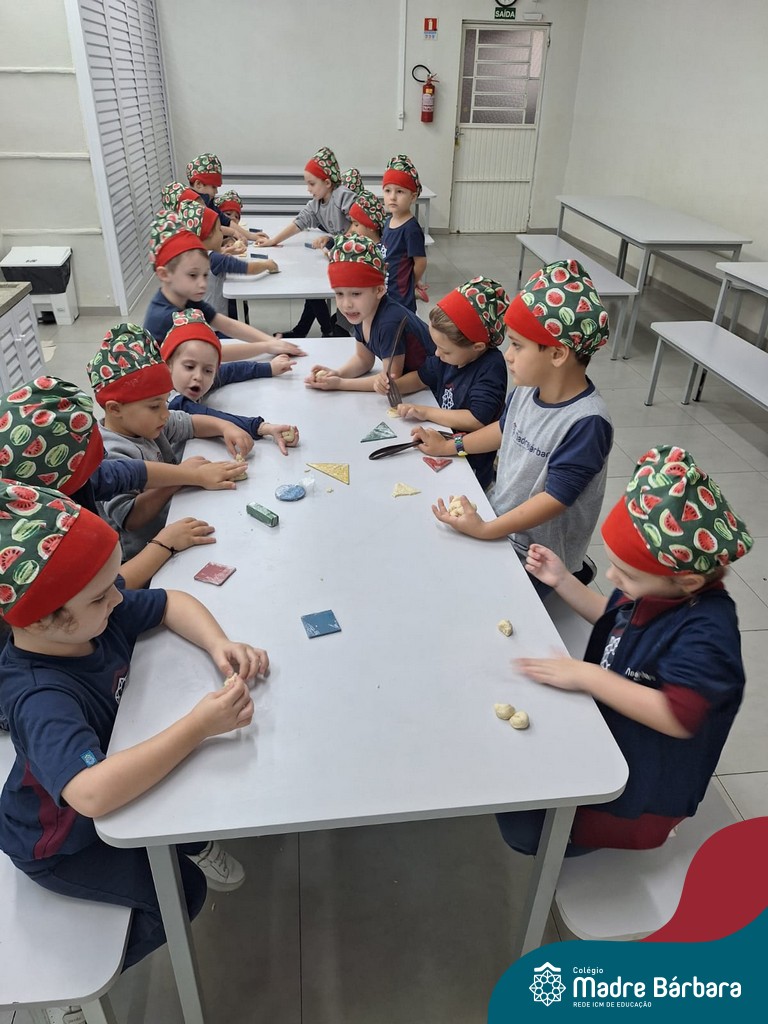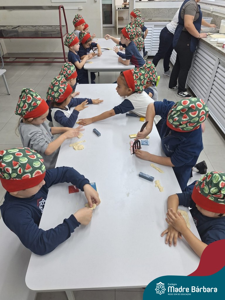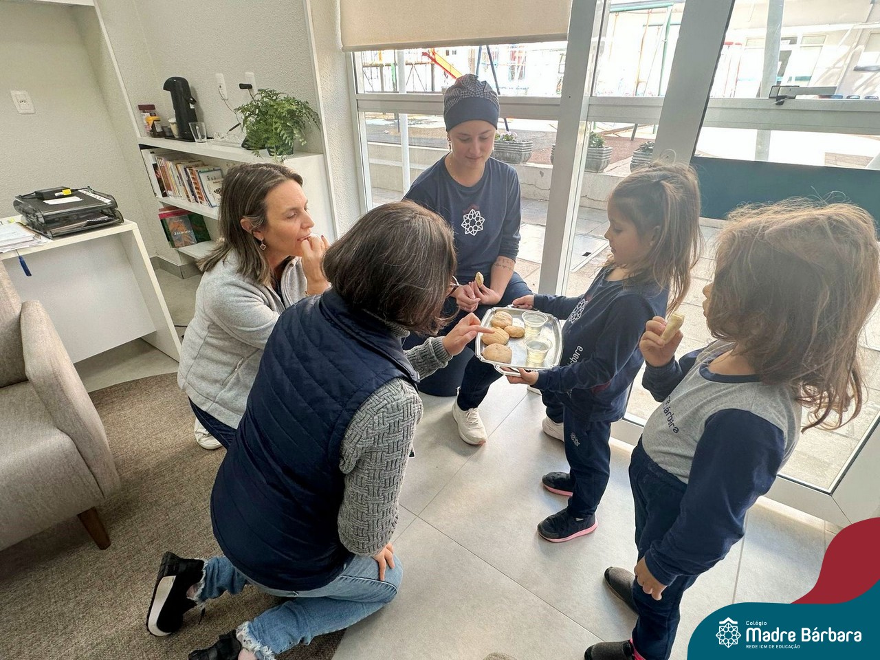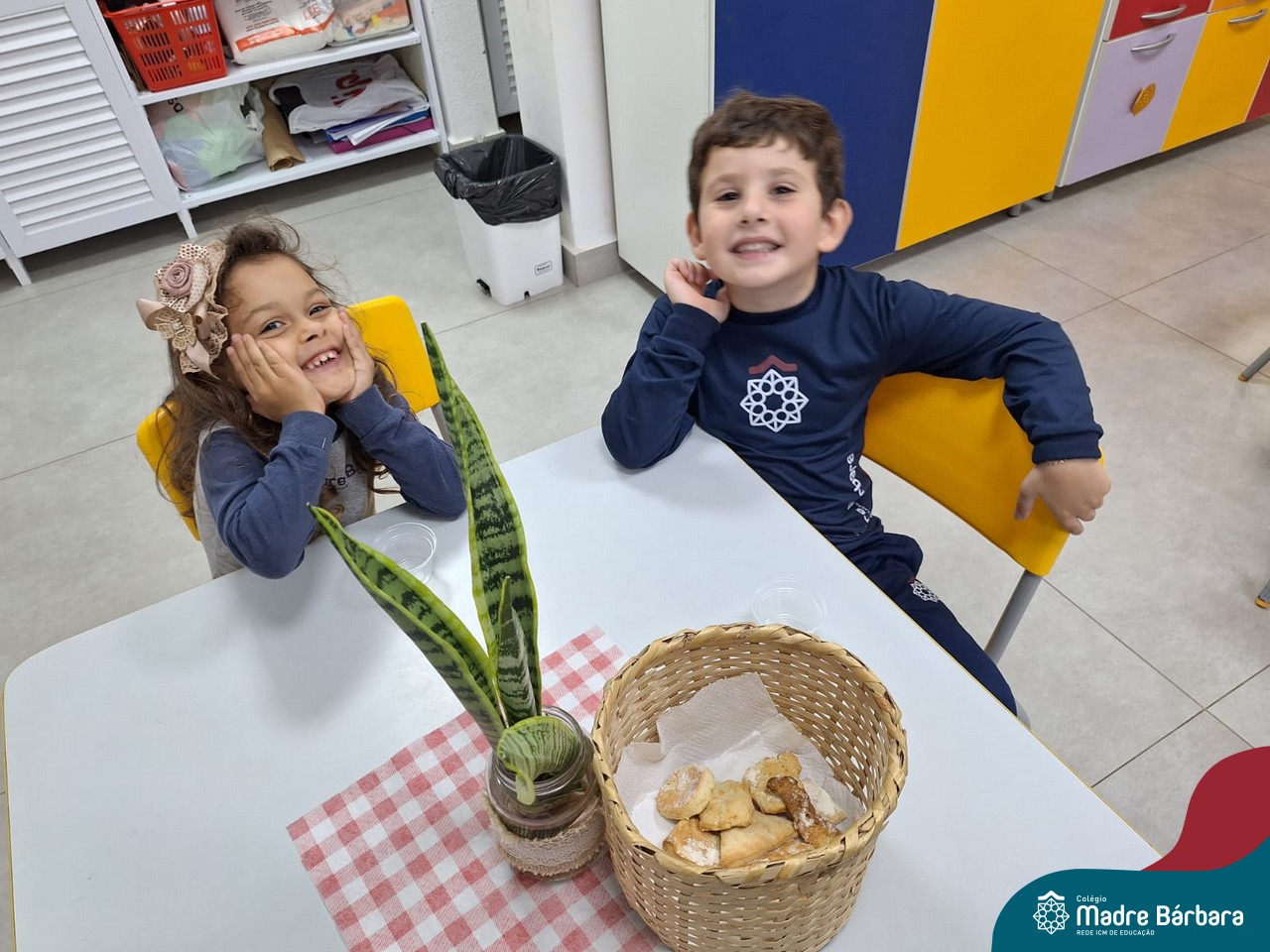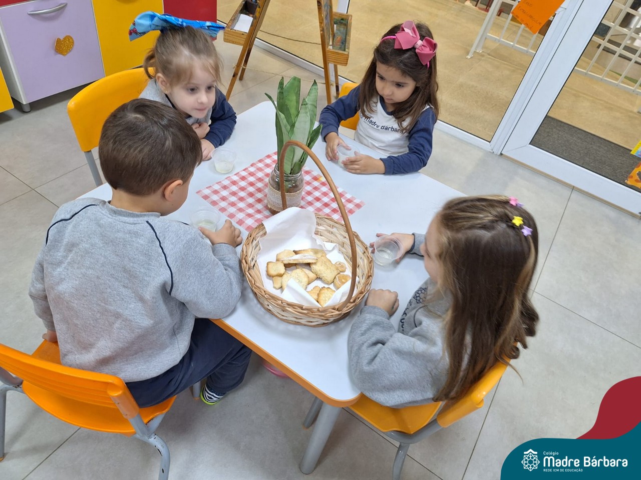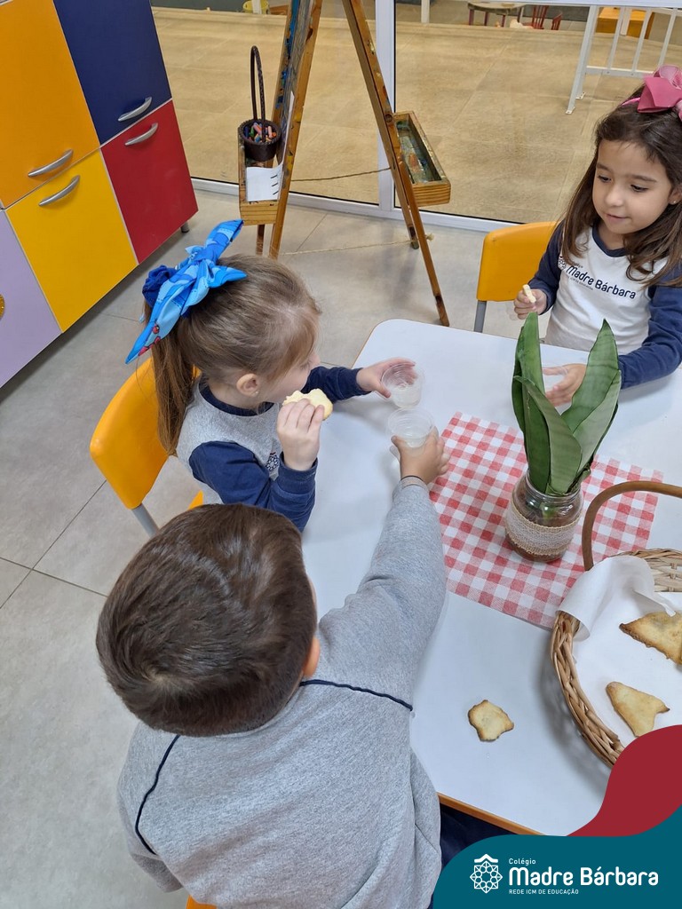 Nesta quarta-feira (30.04) ocorreu um momento muito especial preparado com carinho pelas crianças: a Hora do Chá! Cada detalhe foi pensado por elas, desde a confecção das bolachas até a organização do ambiente. As bolachas foram feitas à mão, em formas geométricas divertidas, como: círculos, quadrados e triângulos. As crianças colocaram a mão na massa, mediram os ingredientes e moldaram cada biscoito com atenção e alegria.