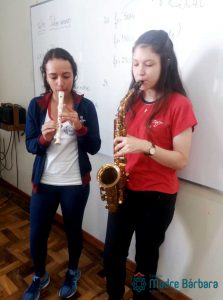 Na sexta-feira (16.11) a aula de Física da turma 201, com a professora Aline Fischer, foi sobre os tubos sonoros. Foi a vez dos instrumentos musicais de sopro: saxofone e flauta. As alunas Maíssa e Gabriela explicaram o funcionamento desses instrumentos. Além disso, os colegas tiveram a oportunidade de “tentar” tocar. Foi divertido.