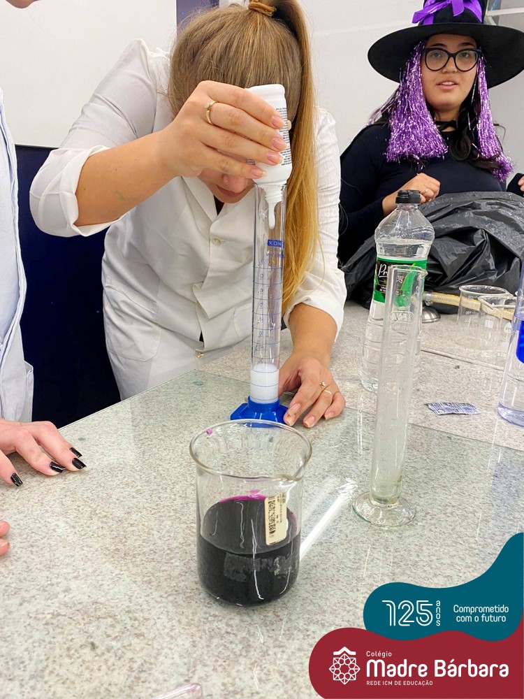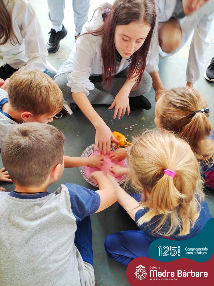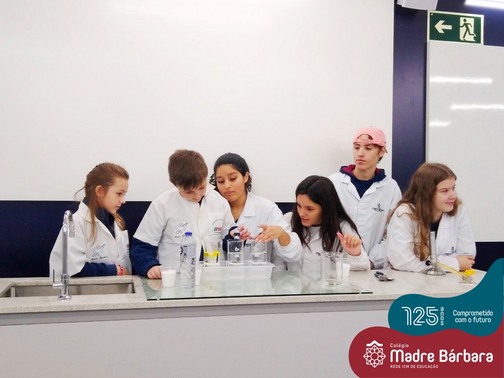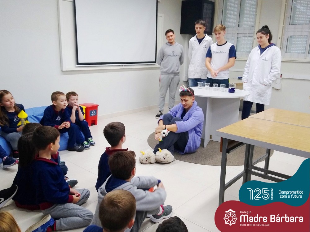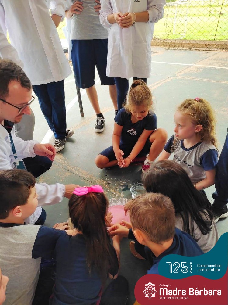 As turmas do 3º ano do Ensino Médio puderam aplicar os seus conhecimentos de termodinâmica, ligações químicas, interações intermoleculares, reações de neutralização e oxirredução, desenvolvendo práticas experimentais aplicadas às séries iniciais do Ensino Fundamental.