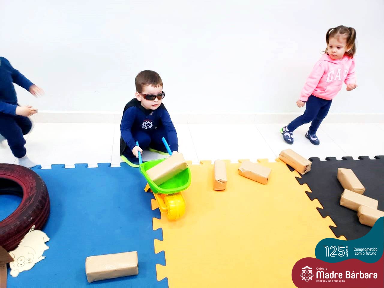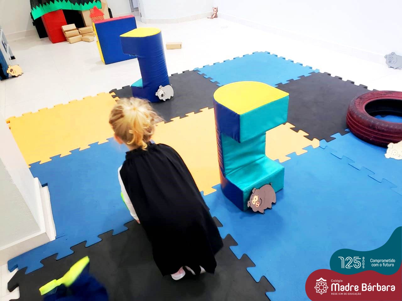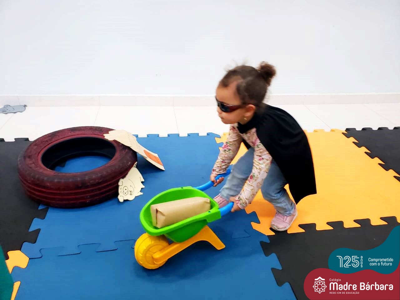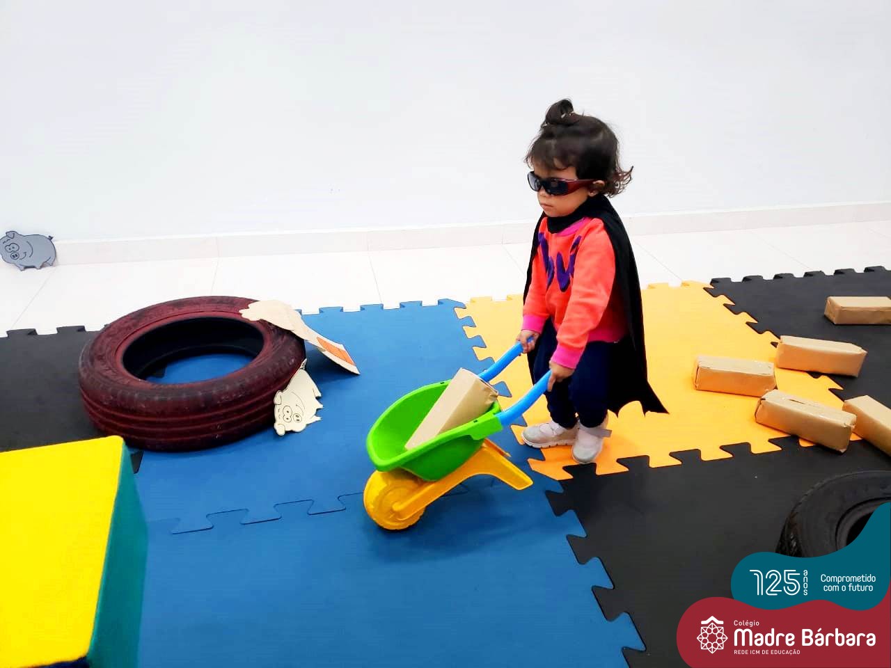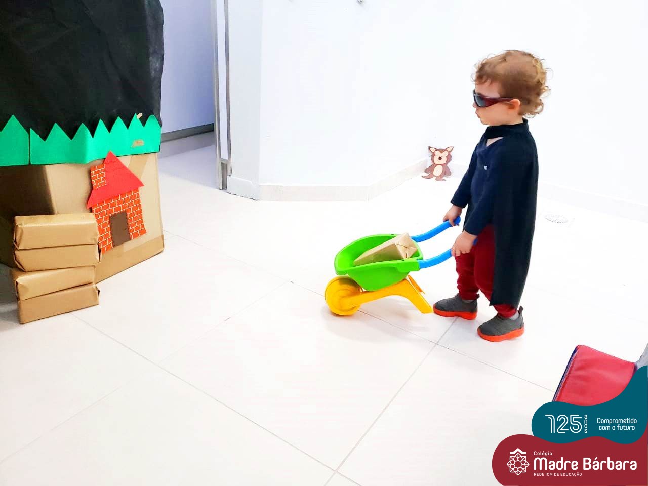 Na tarde desta segunda-feira (03.10), as crianças participaram de um momento de psicomotricidade bem especial. Dentro do projeto “Explorando, criando e recriando”, a turma está vivenciando propostas envolvendo o jogo simbólico e as professoras Isabel, Joice e Laura propuseram um momento lúdico e muito significativo. As crianças usaram um óculos, uma capa para que ficassem invisíveis para que o lobo não as visse. Assim, utilizavam o carrinho de mão para levar os tijolinhos até a casa dos porquinhos para auxiliá-los. Durante a brincadeira, passavam por desafios corporais, equilibrando o tijolo no carrinho, onde o imaginário se fez muito presente.