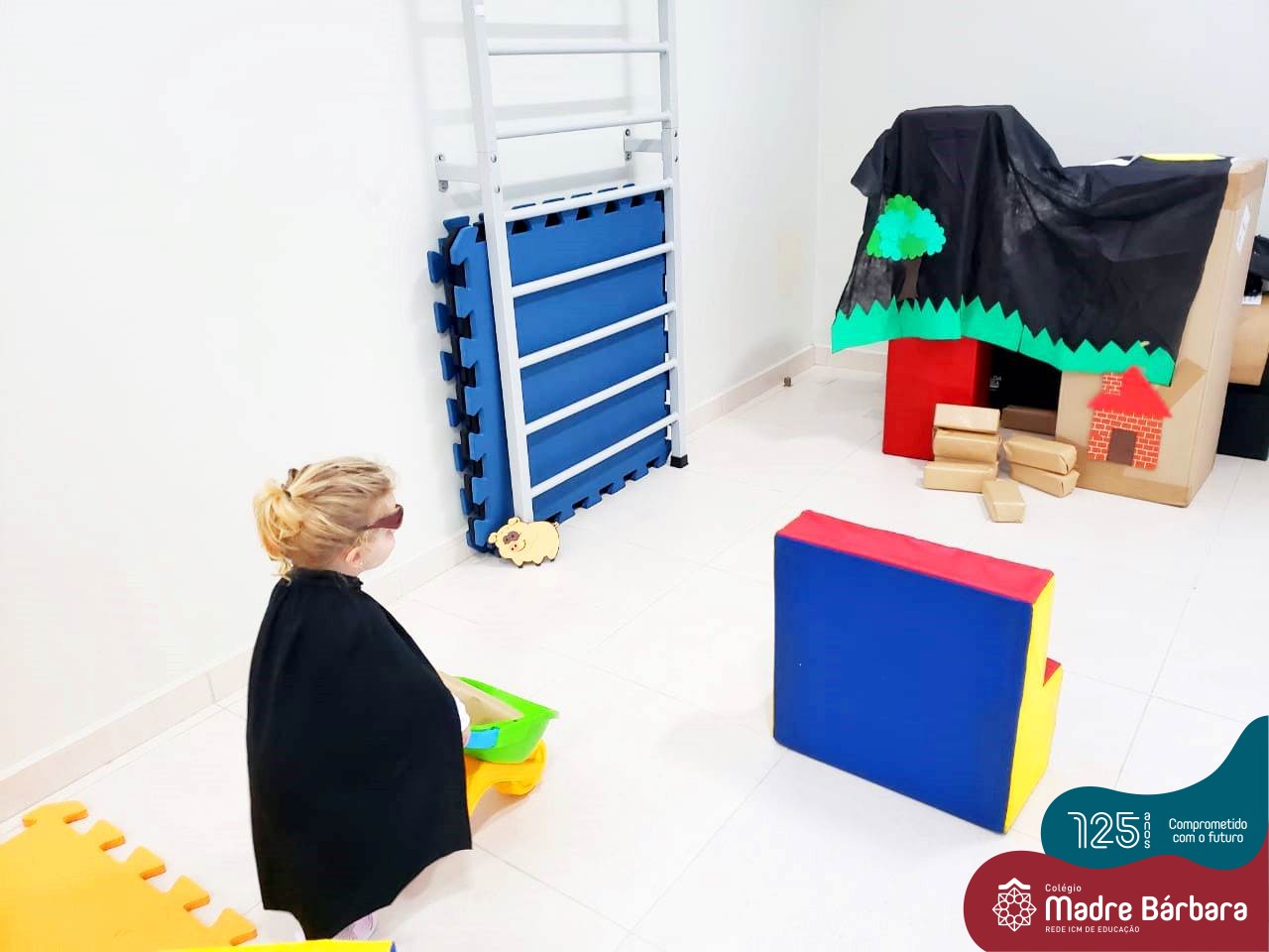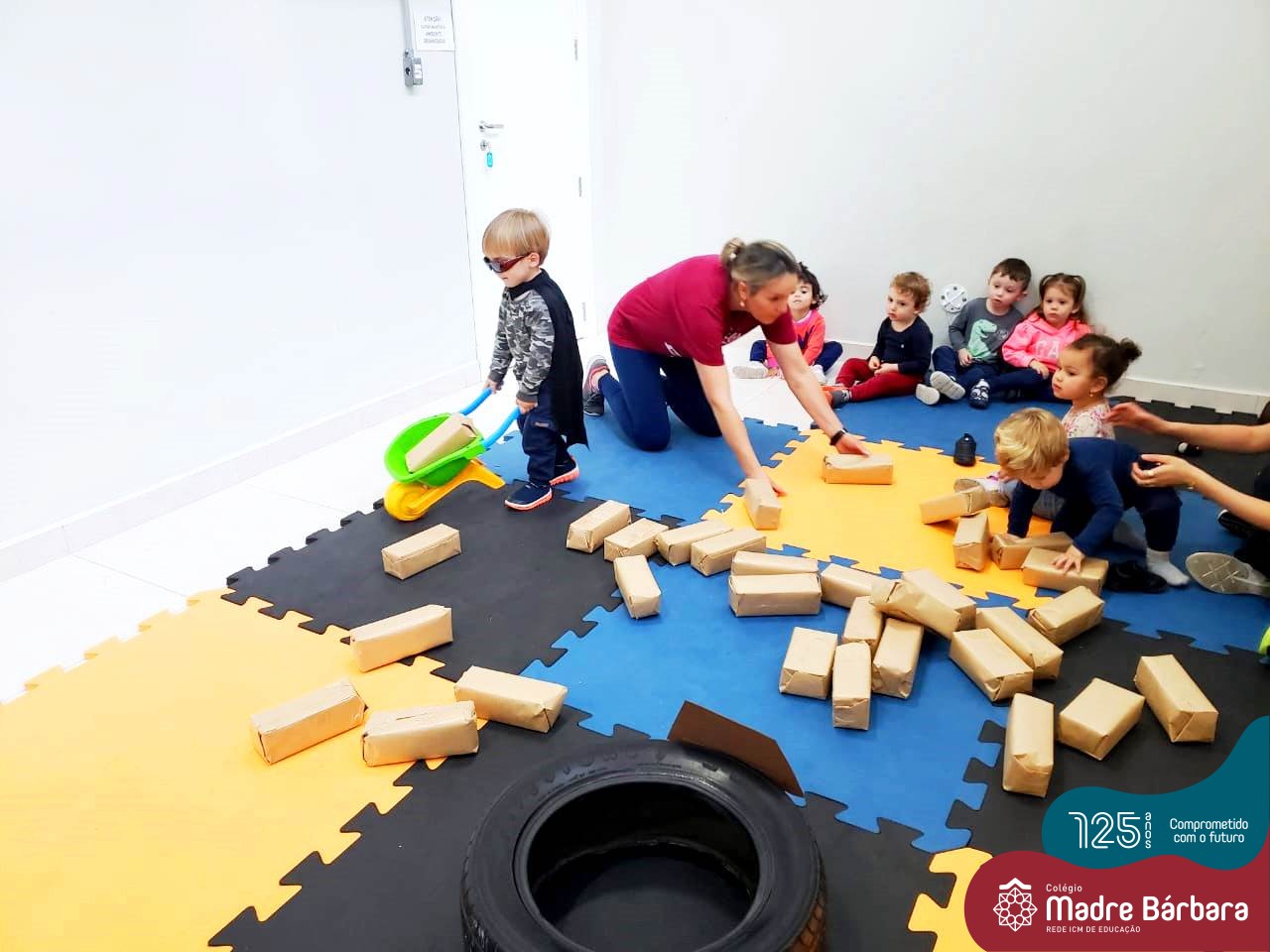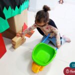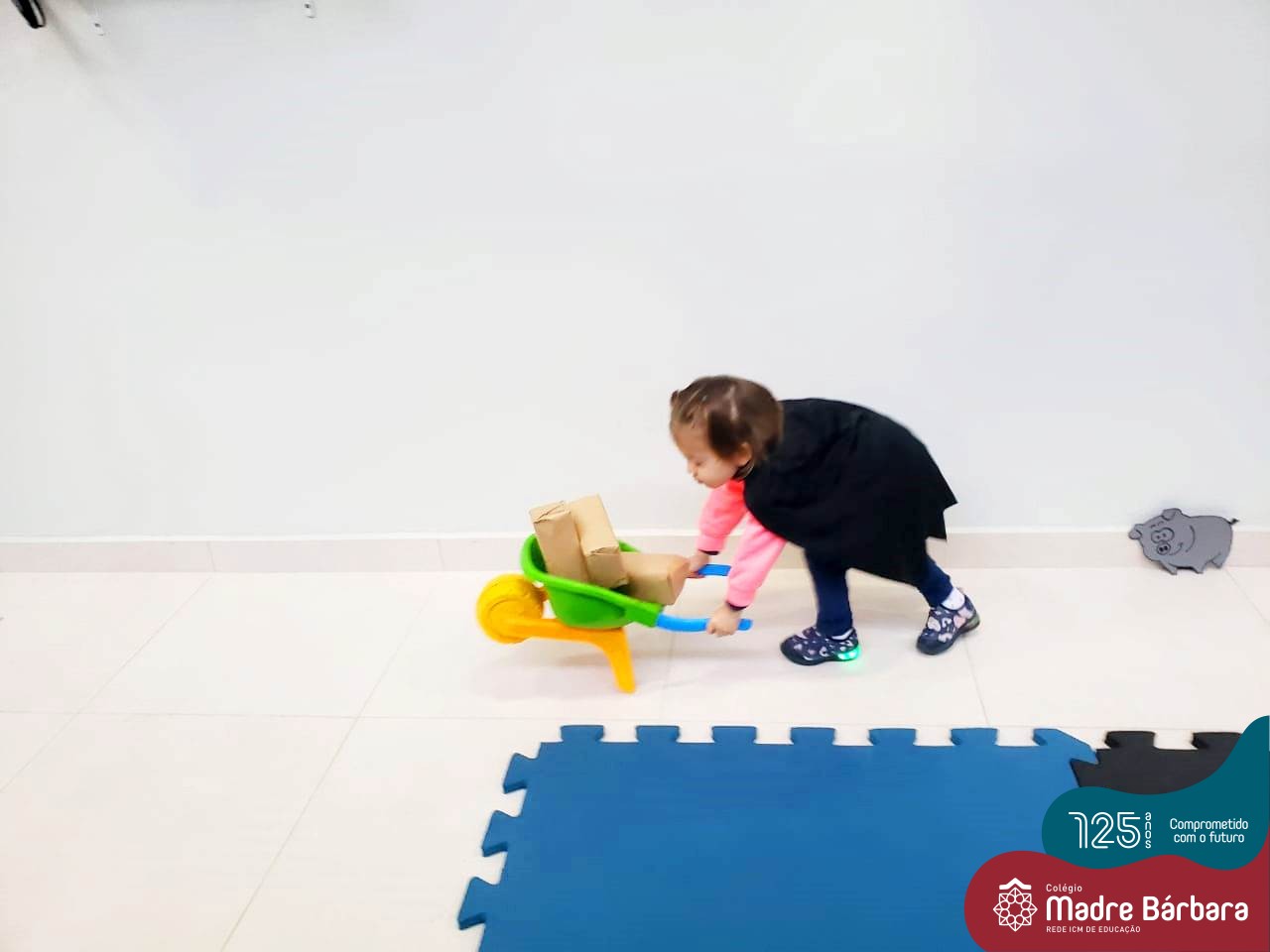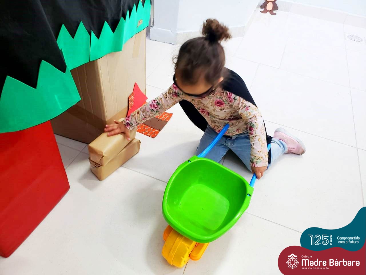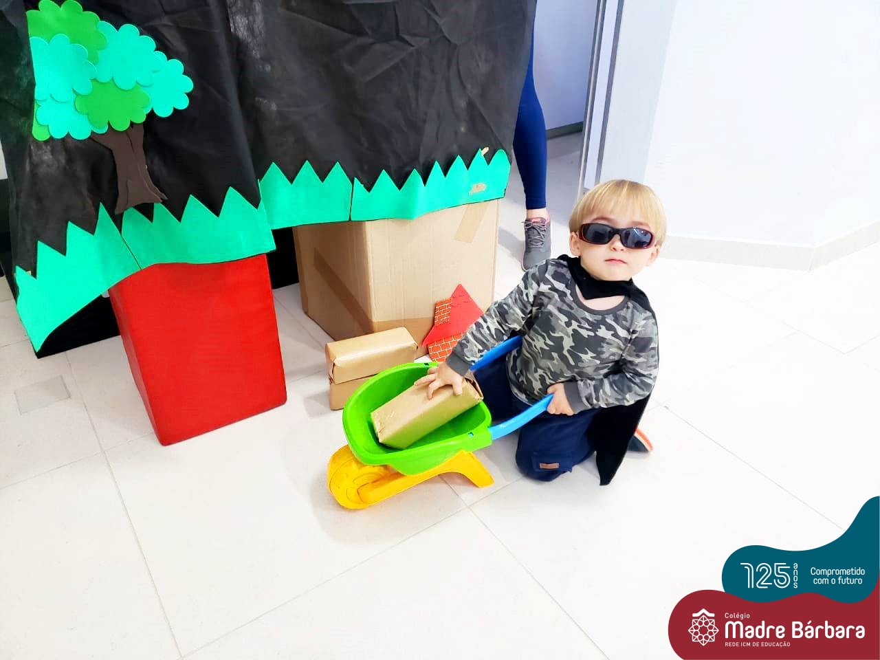 Na tarde desta segunda-feira (03.10), as crianças participaram de um momento de psicomotricidade bem especial. Dentro do projeto “Explorando, criando e recriando”, a turma está vivenciando propostas envolvendo o jogo simbólico e as professoras Isabel, Joice e Laura propuseram um momento lúdico e muito significativo. As crianças usaram um óculos, uma capa para que ficassem invisíveis para que o lobo não as visse. Assim, utilizavam o carrinho de mão para levar os tijolinhos até a casa dos porquinhos para auxiliá-los. Durante a brincadeira, passavam por desafios corporais, equilibrando o tijolo no carrinho, onde o imaginário se fez muito presente.
