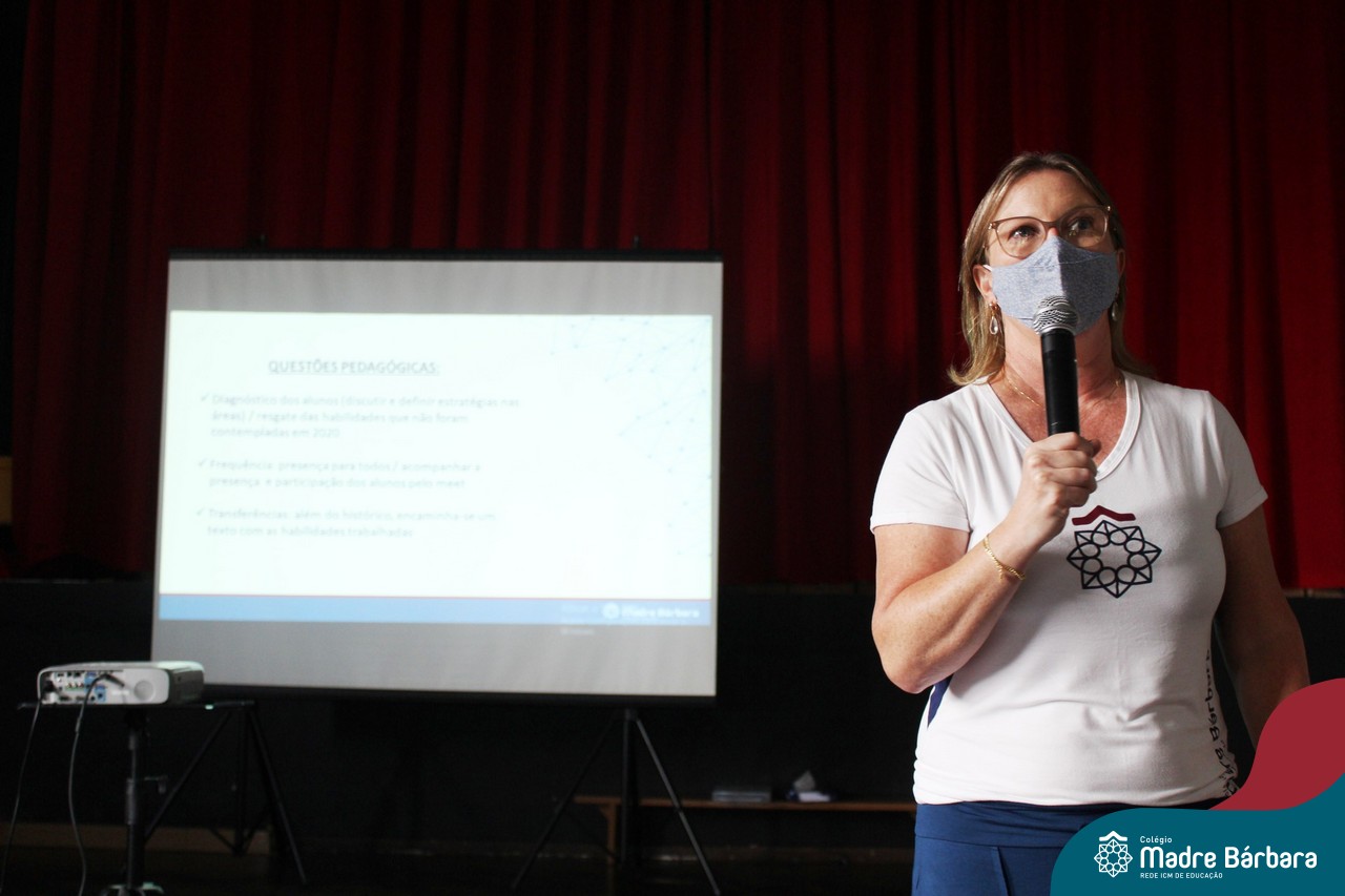Na tarde desta segunda-feira (08.02) os professores do Ensino Fundamental – Anos Finais e do Ensino Médio se reencontraram no Colégio Madre Bárbara – Rede ICM. A coordenadora pedagógica Justine Thomas e a diretora Maria Elena Jacques conversaram sobre o ano letivo e as perspectivas para 2021. A atividade deu abertura a semana da Jornada Pedagógica.