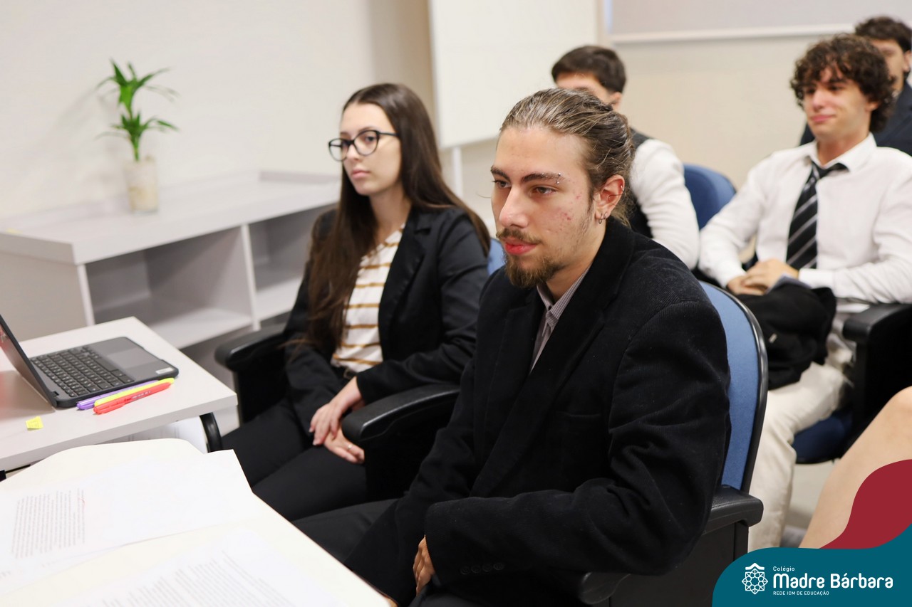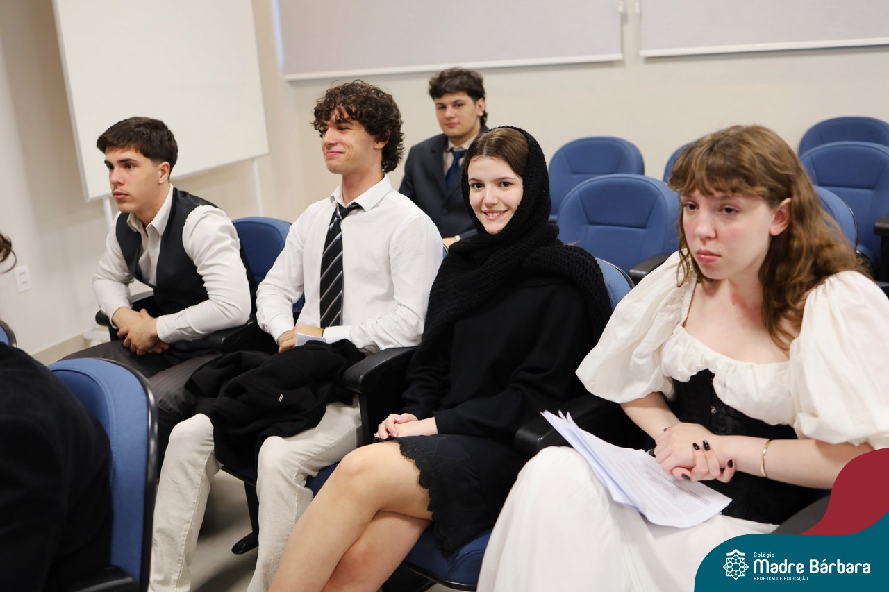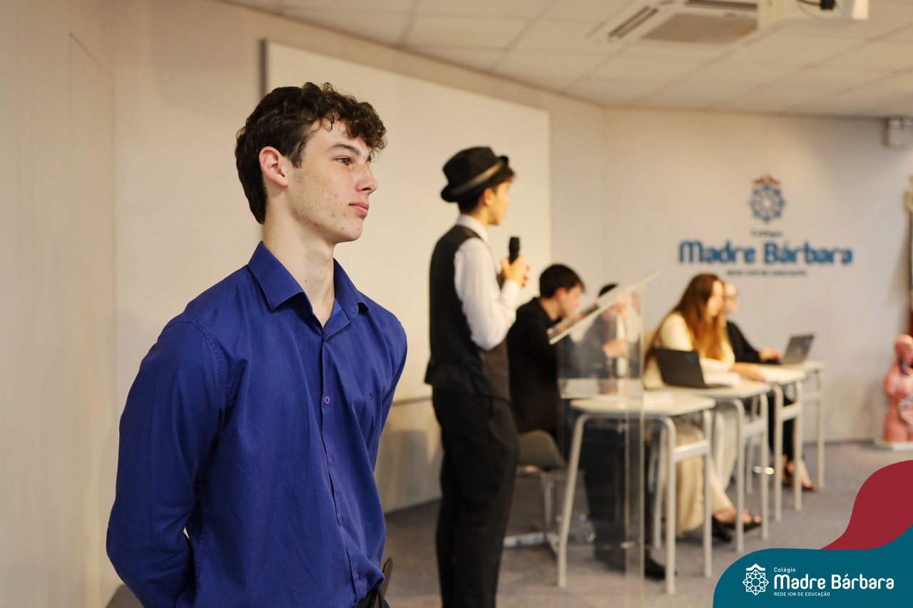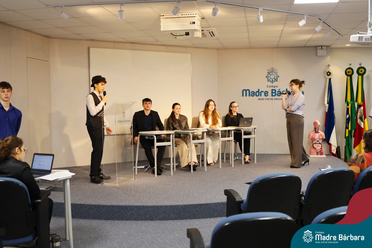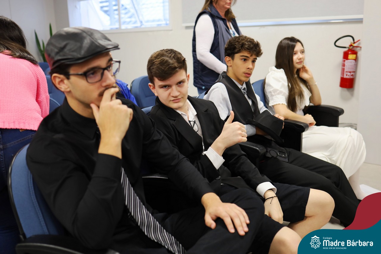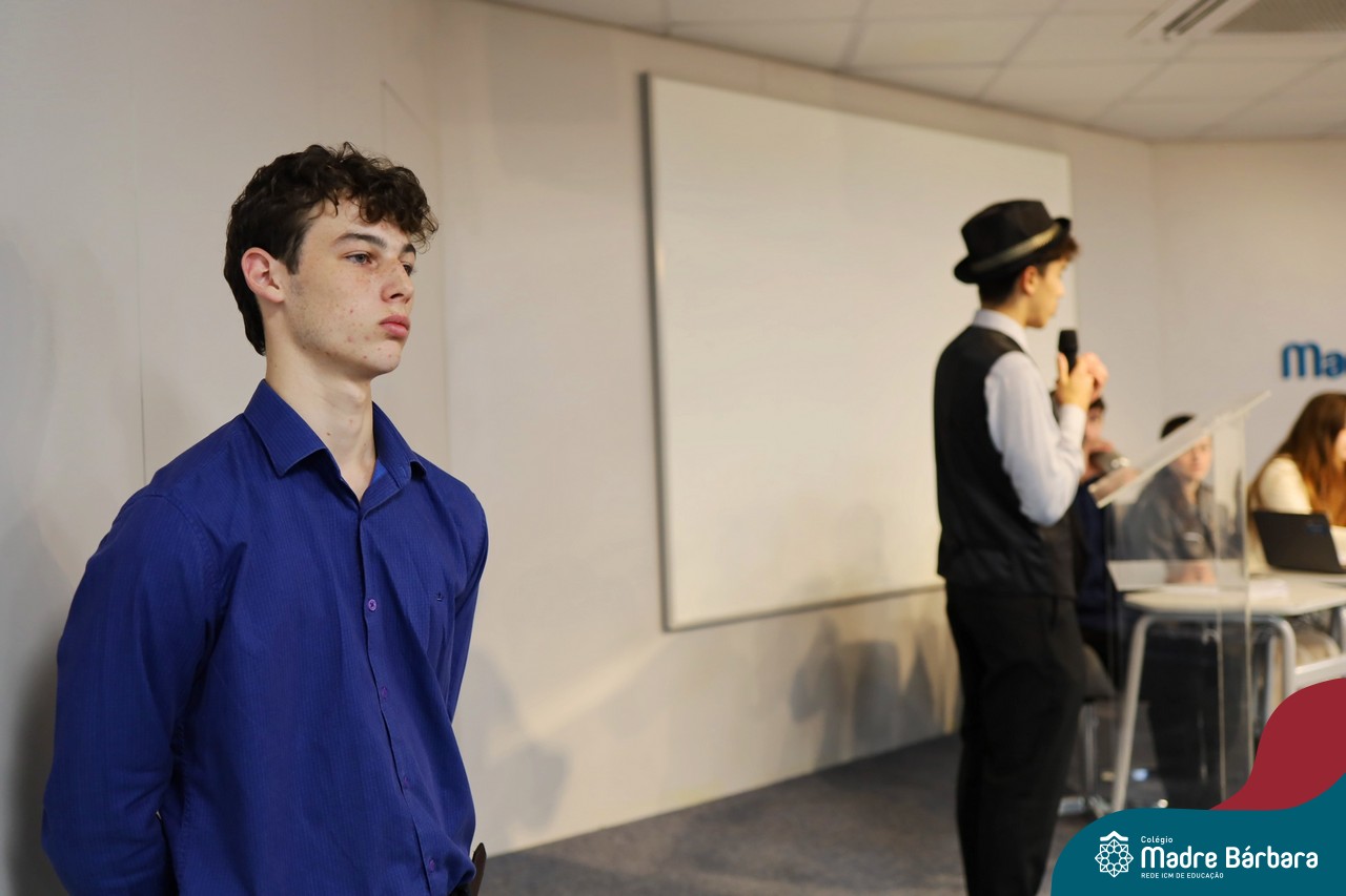 A partir da leitura da obra Dom Casmurro, de Machado de Assis, os estudantes do 3º ano do Ensino Médio foram desafiados a realizar o Júri Simulado das personagens Capitu e Bentinho. No Julgamento da Capitu, julgou-se se Capitu traiu ou não Bentinho. Já no Julgamento do Bentinho, o personagem respondeu pela acusação de calúnia e difamação. Para a atividade, os alunos foram divididos em acusação e defesa, que tiveram de usar de todo o seu poder persuasivo para convencer o júri de suas teses. Além da equipe de acusação e defesa, havia a equipe do Juíz, responsável pela organização e condução dos casos. Já o Júri foi composto pelas convidadas externas Adriana Diemer, que é advogada, além das professoras de literatura Rosane Cardoso, Ana Emília Klein e Vitória Schmidt.