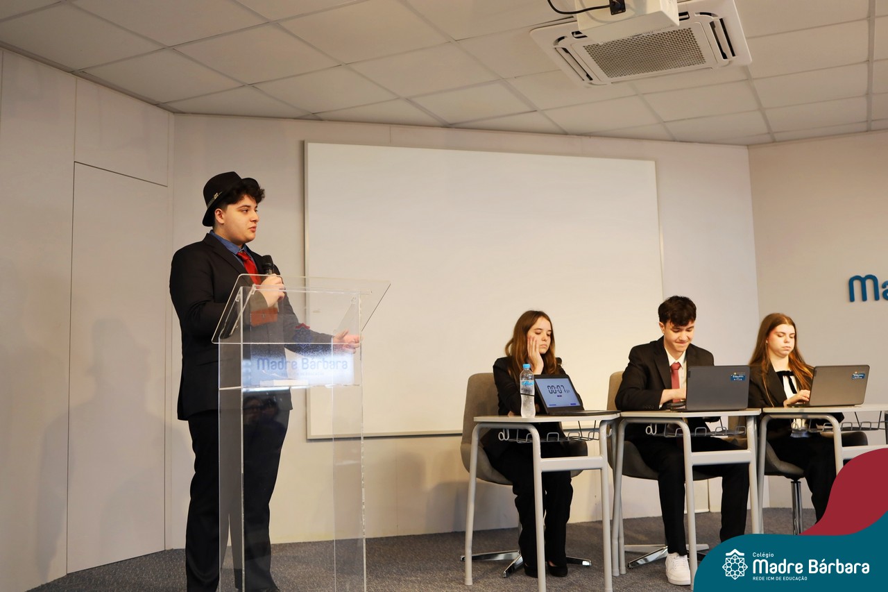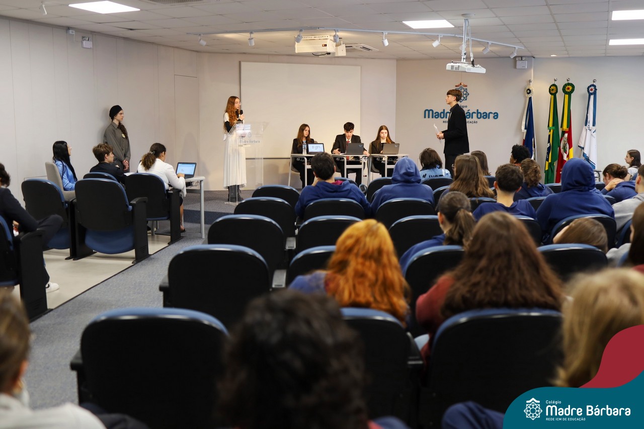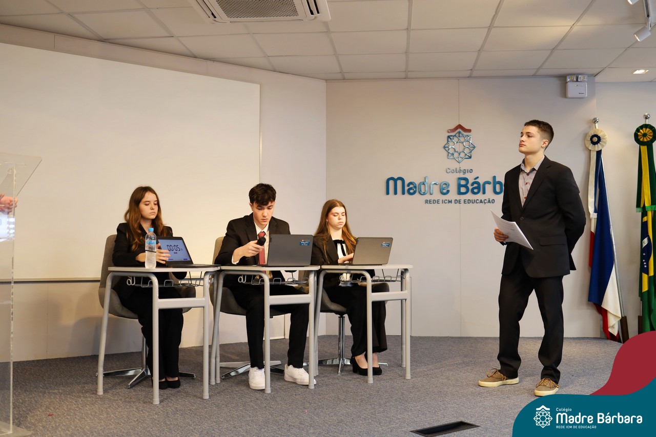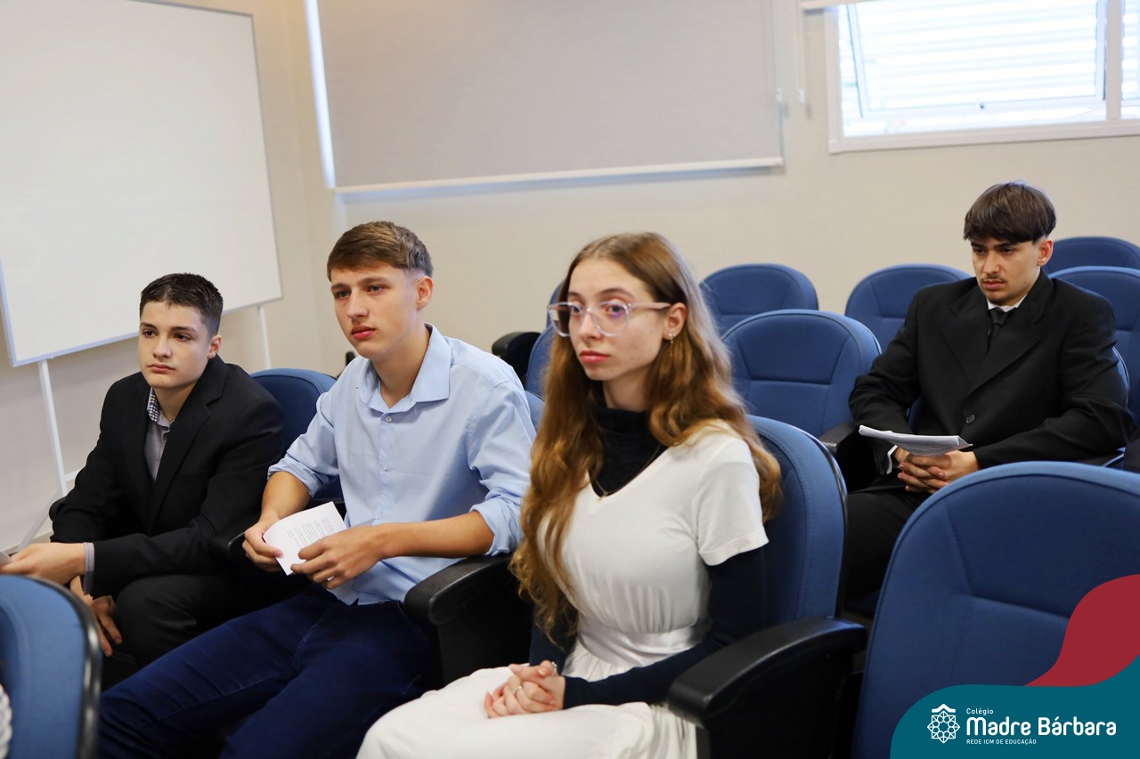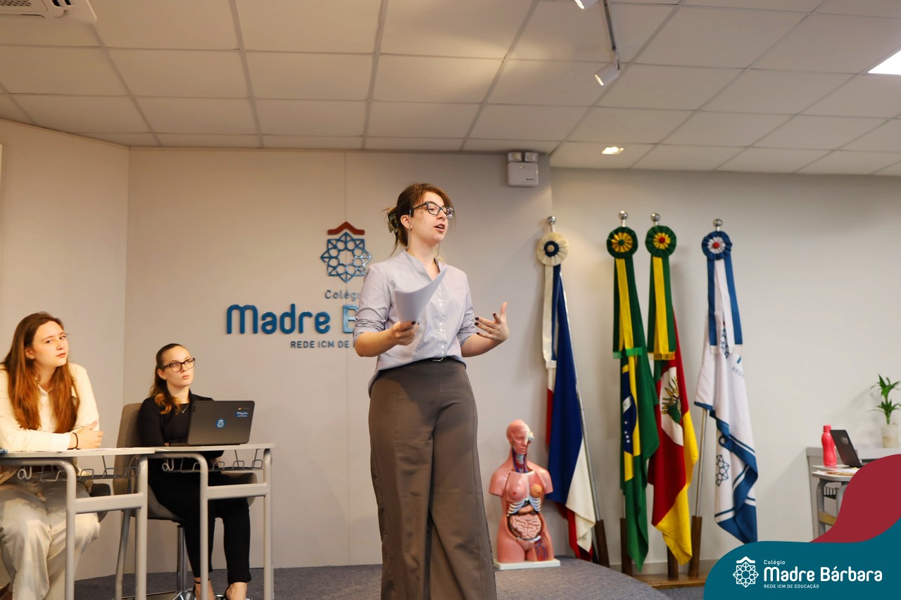 A partir da leitura da obra Dom Casmurro, de Machado de Assis, os estudantes do 3º ano do Ensino Médio foram desafiados a realizar o Júri Simulado das personagens Capitu e Bentinho. No Julgamento da Capitu, julgou-se se Capitu traiu ou não Bentinho. Já no Julgamento do Bentinho, o personagem respondeu pela acusação de calúnia e difamação. Para a atividade, os alunos foram divididos em acusação e defesa, que tiveram de usar de todo o seu poder persuasivo para convencer o júri de suas teses. Além da equipe de acusação e defesa, havia a equipe do Juíz, responsável pela organização e condução dos casos. Já o Júri foi composto pelas convidadas externas Adriana Diemer, que é advogada, além das professoras de literatura Rosane Cardoso, Ana Emília Klein e Vitória Schmidt.