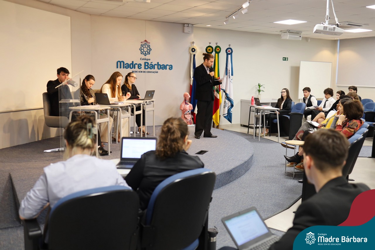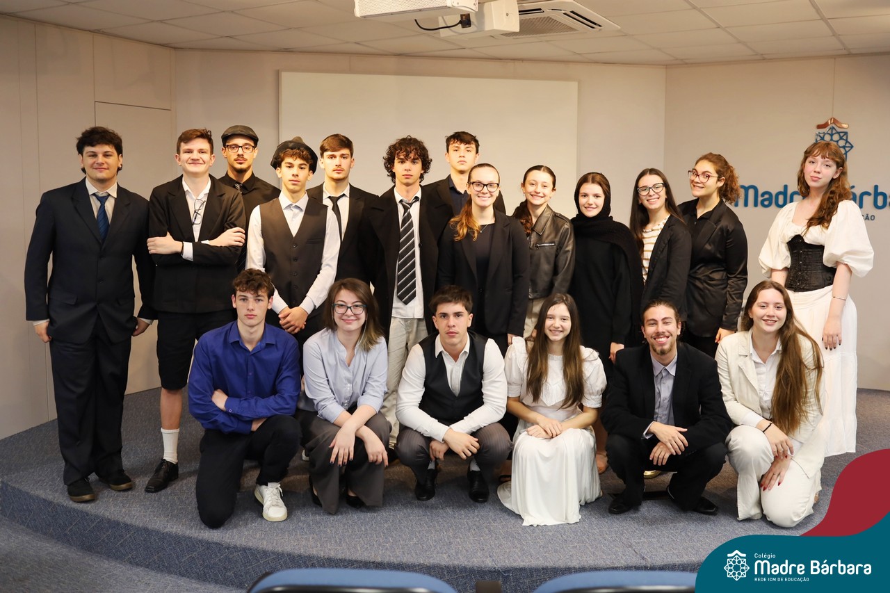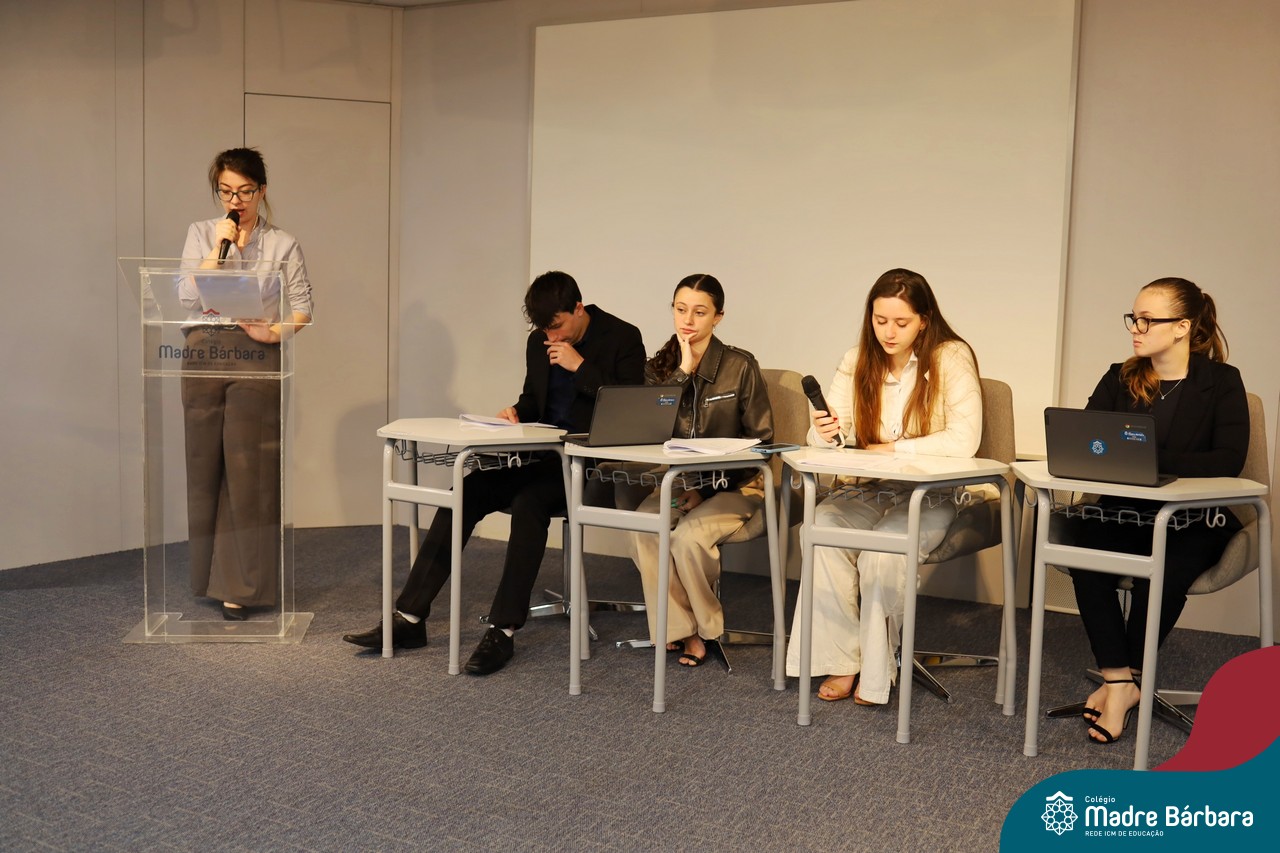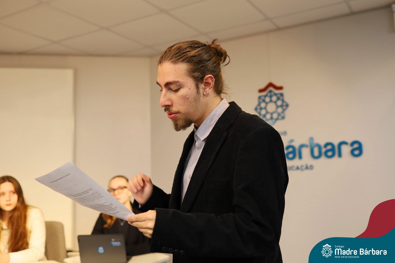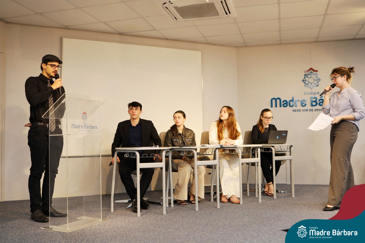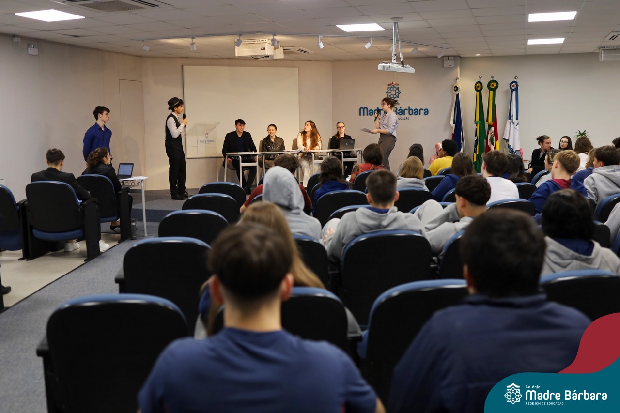 A partir da leitura da obra Dom Casmurro, de Machado de Assis, os estudantes do 3º ano do Ensino Médio foram desafiados a realizar o Júri Simulado das personagens Capitu e Bentinho. No Julgamento da Capitu, julgou-se se Capitu traiu ou não Bentinho. Já no Julgamento do Bentinho, o personagem respondeu pela acusação de calúnia e difamação. Para a atividade, os alunos foram divididos em acusação e defesa, que tiveram de usar de todo o seu poder persuasivo para convencer o júri de suas teses. Além da equipe de acusação e defesa, havia a equipe do Juíz, responsável pela organização e condução dos casos. Já o Júri foi composto pelas convidadas externas Adriana Diemer, que é advogada, além das professoras de literatura Rosane Cardoso, Ana Emília Klein e Vitória Schmidt.
