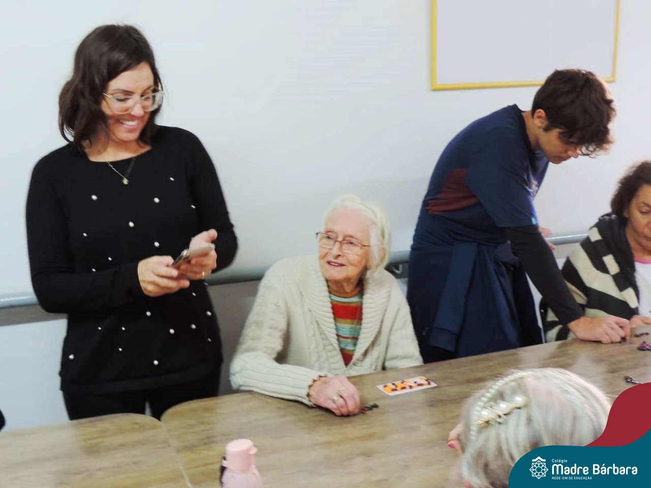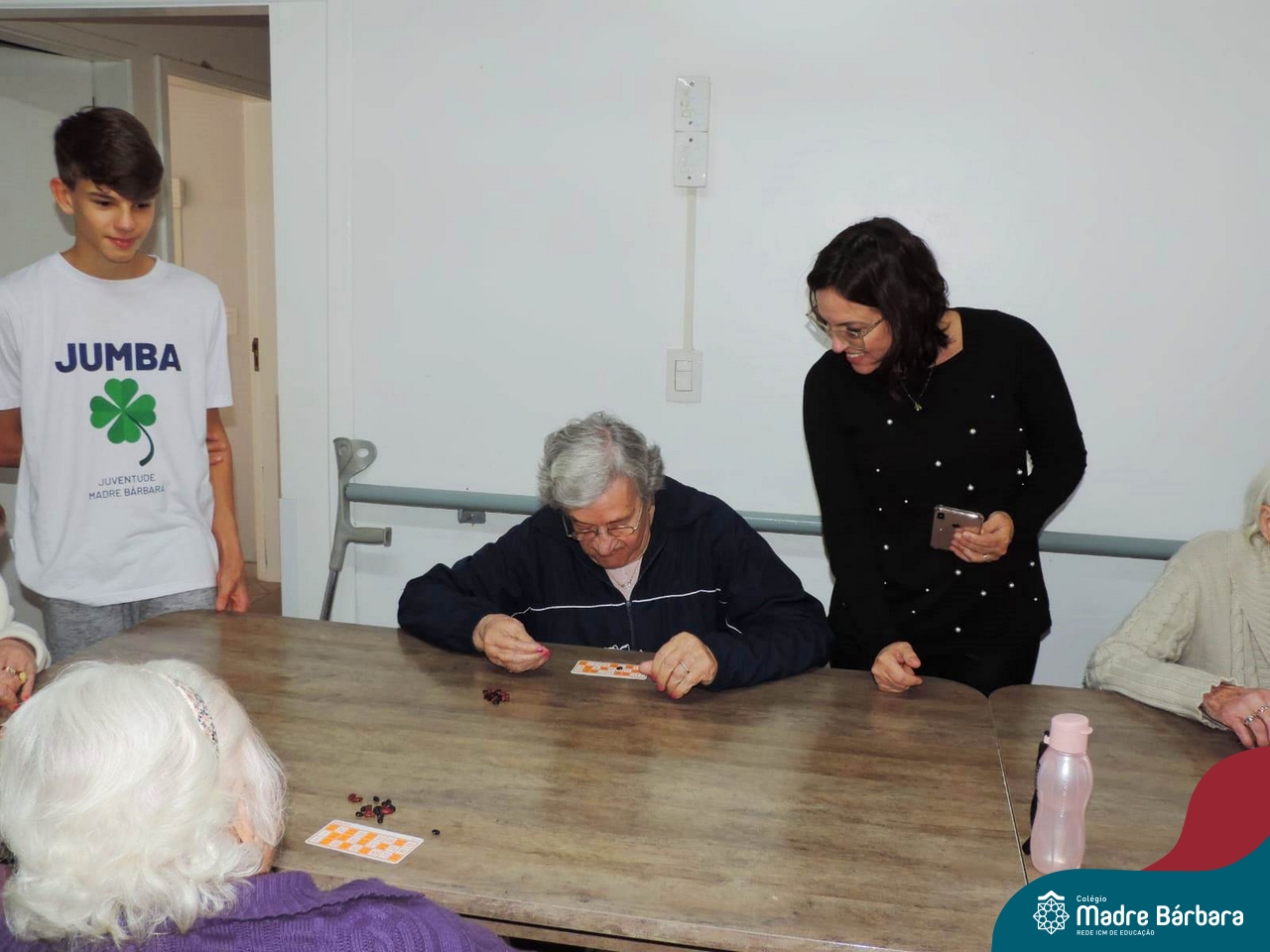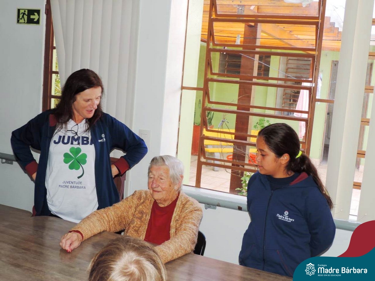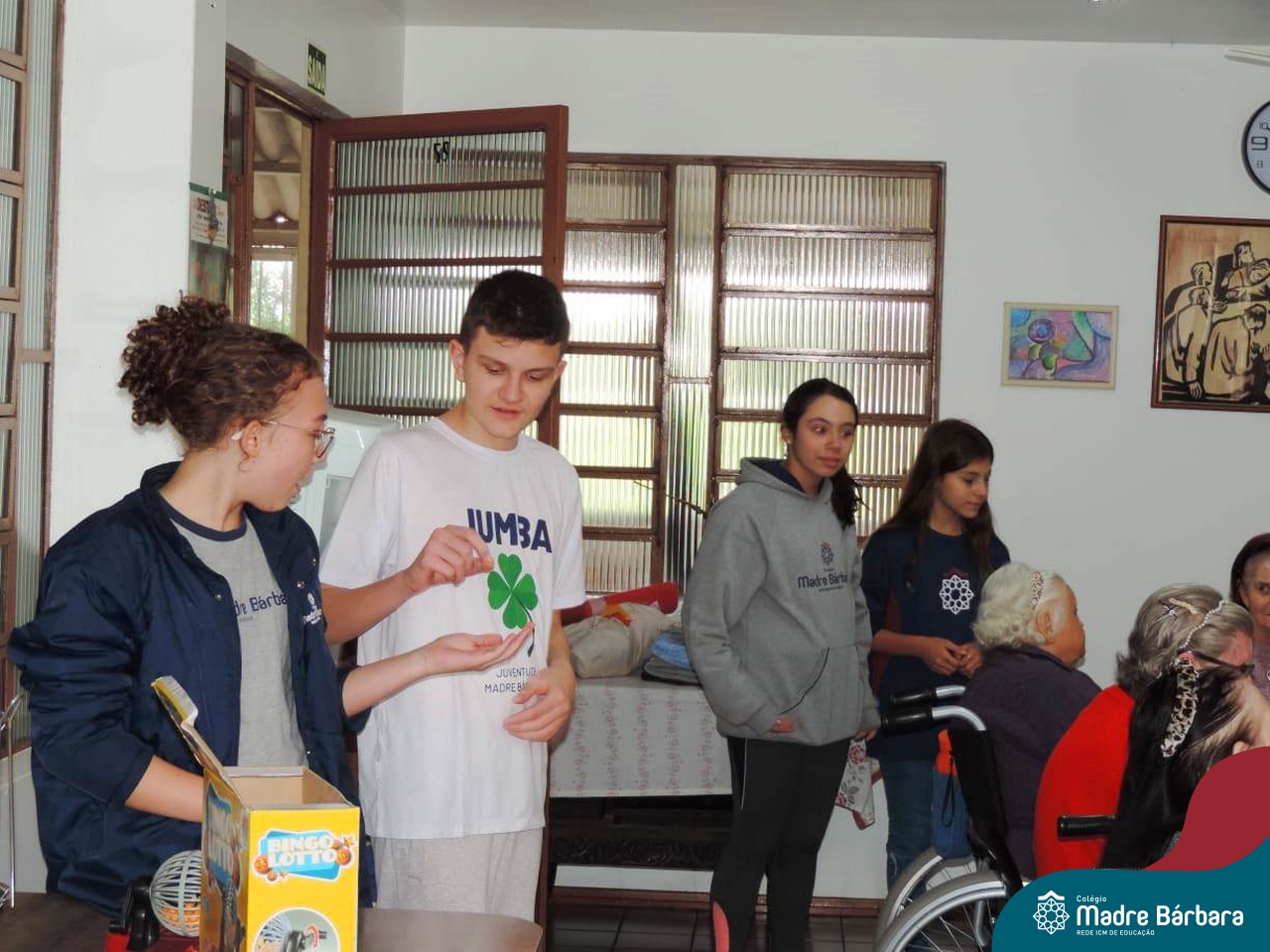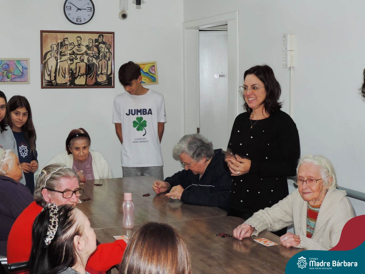 Na tarde de sexta-feira (12.05) o grupo da Juventude Madre Bárbara (Jumba) esteve visitando as senhoras da Vovólar para fazer o Bingo da Alegria. Foi momento de gratidão, carinho, de amor, também pela proximidade do Dia das Mães. Cada uma recebeu de presente um cachecol para que seja um inverno quentinho.