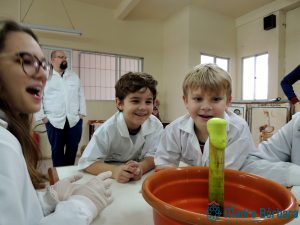 Nessa segunda-feira (10.06) os afilhados das turmas 11, 12, 13 e 14 se reuniram com os dindos do 3º ano do Ensino Médio para mais uma atividade de integração dentro do Programa Laços Afetivos, realizado pelo Serviço de Orientação Educacional (SOE). Dessa vez, o encontro foi no Laboratório de Ciências e contou com diversas práticas, coordenadas pela professora de biologia Ângela Lenz e o professor de química Maurício Hilgemann. Dindos e afilhados se transformaram em verdadeiros cientistas na execução das experiências. Foi um momento muito divertido, de trocas, aprendizado, envolvimento e carinho!