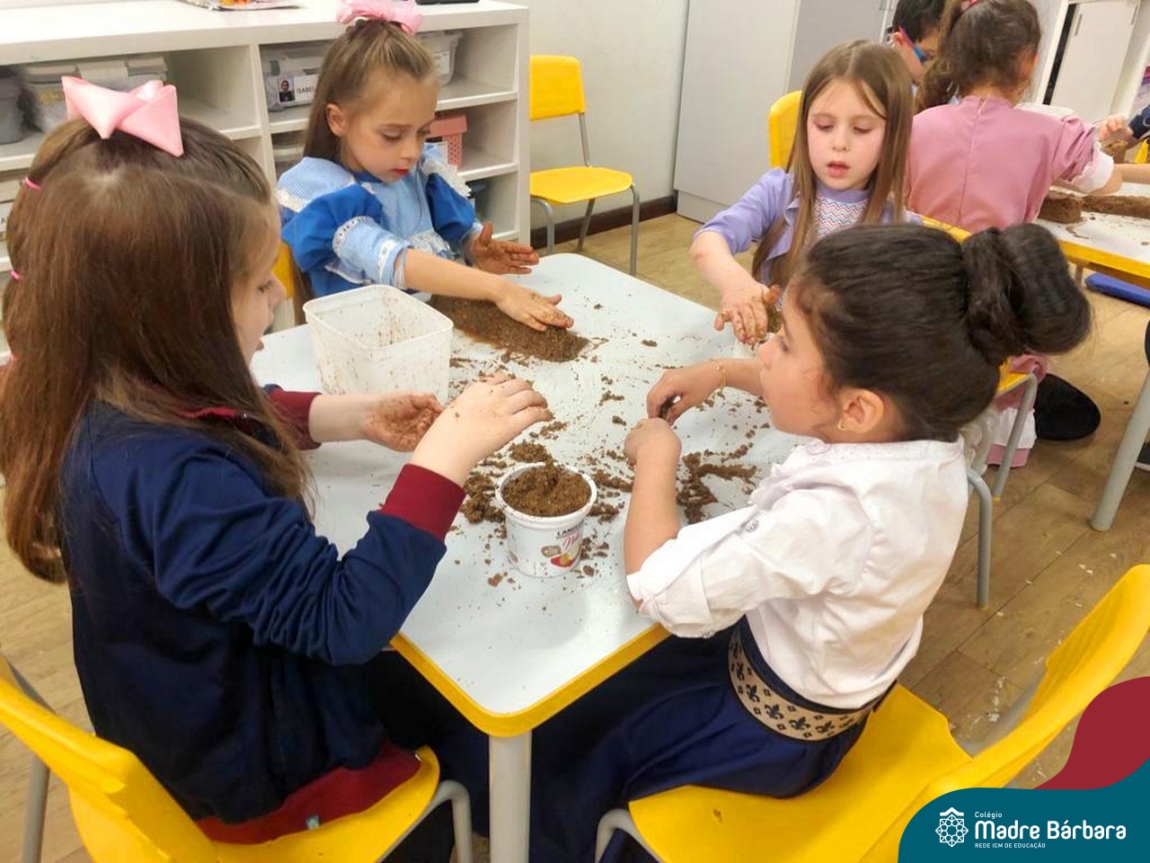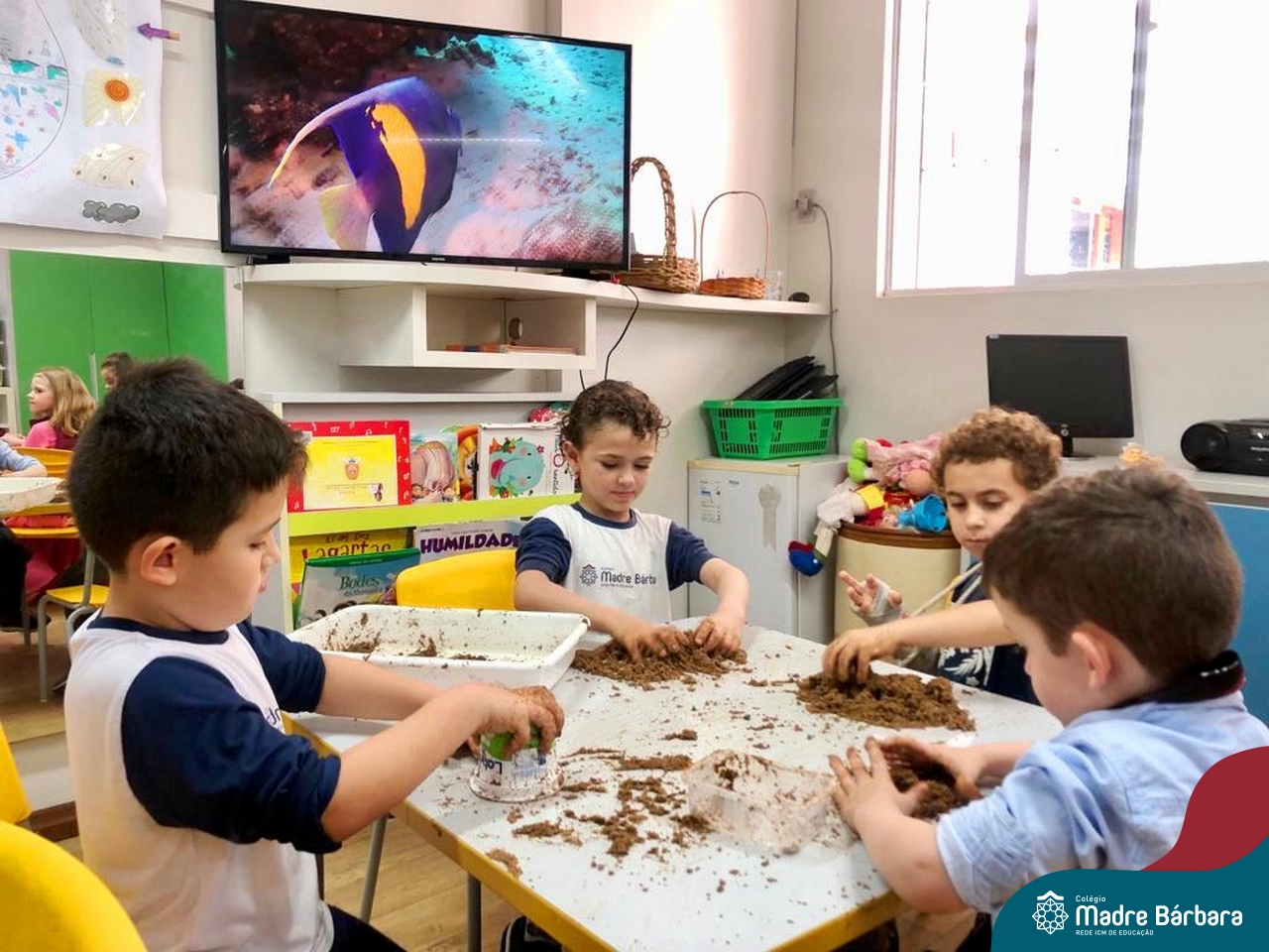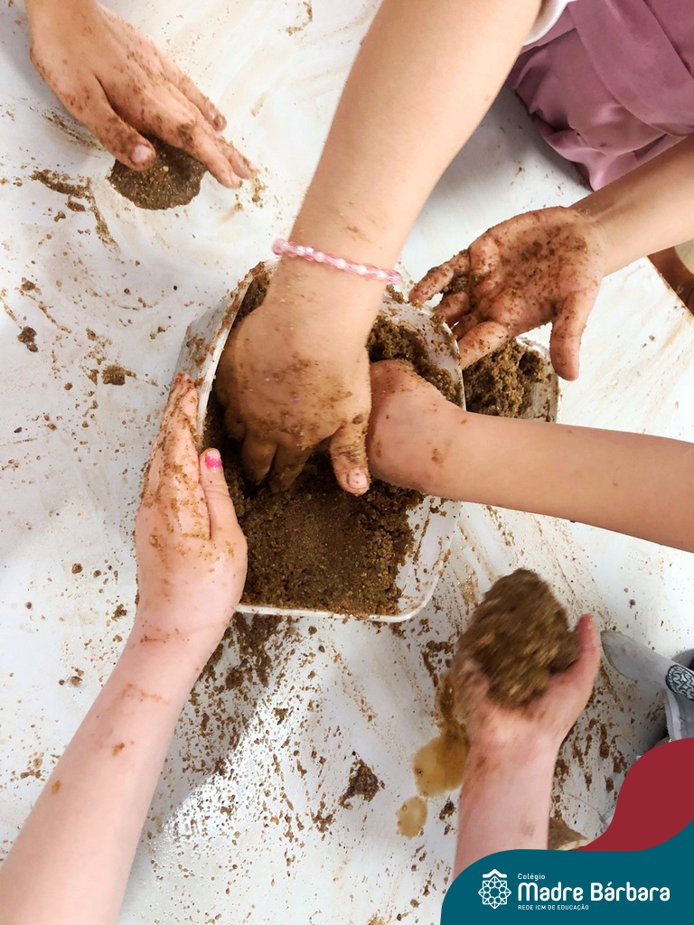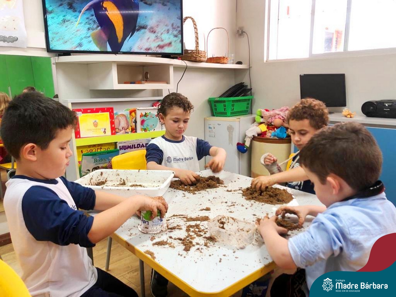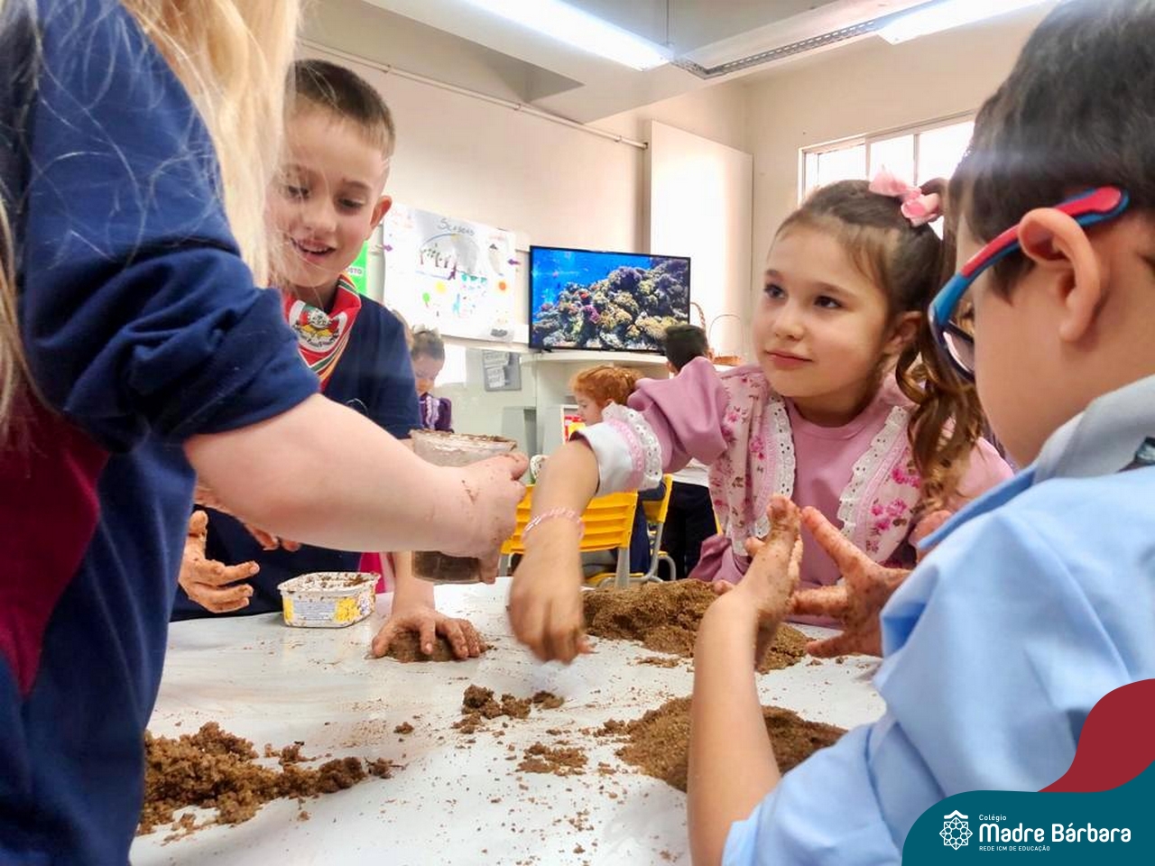 The sensations and experiences we can provide enrich the activities with our students! In the bilingual program classes, level 5D students were encouraged to explore the sand. The Teacher provided a moment for the children to play and build castles in the sand and other things they could imagine because the topics of the classes are being the beach, sand, sea, island and the animals that inhabit these places. It was a class full of discoveries and creativity!