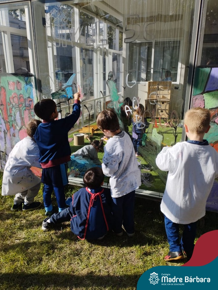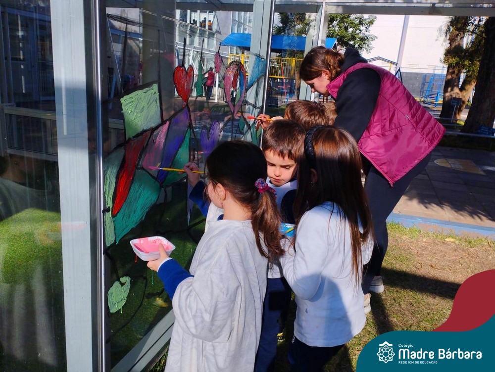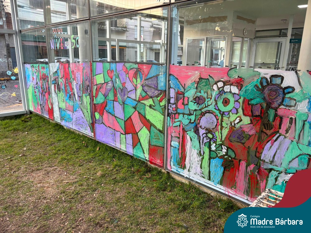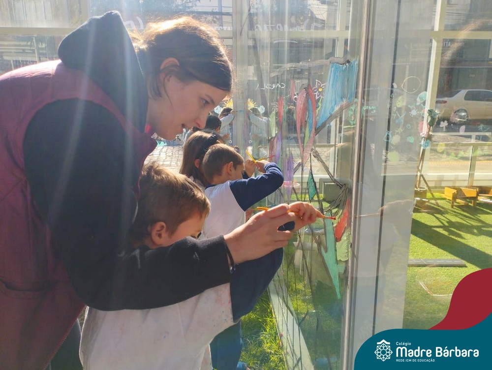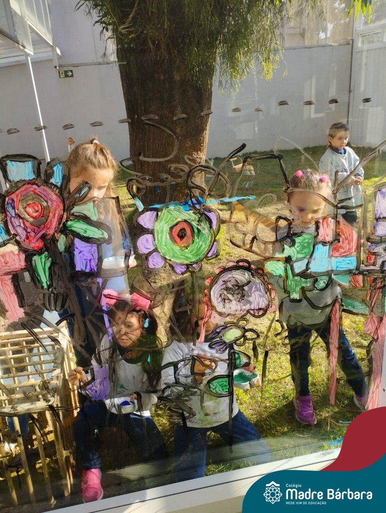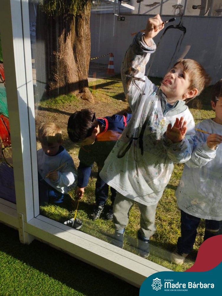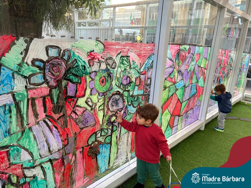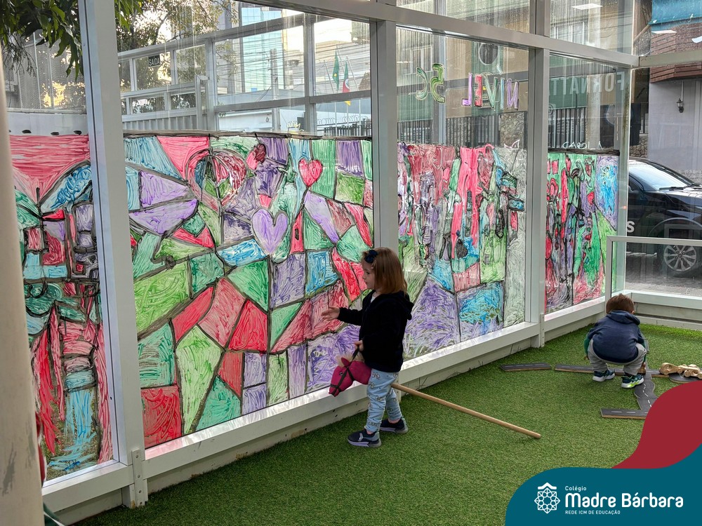 O envolvimento foi tão intenso, que a proposta se expandiu: “vamos fazer vitrais nos vidros da Educação Infantil?” Assim, os vidros do pátio do nosso colégio se transformaram em obras de arte. Em grupos as crianças conversaram e planejaram como construir os vitrais, desenharam cada detalhe, pintaram e se encantaram com a magia das cores, com a luz do sol e com suas criações.