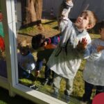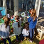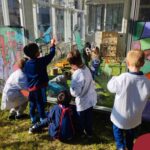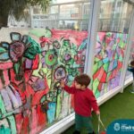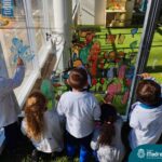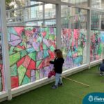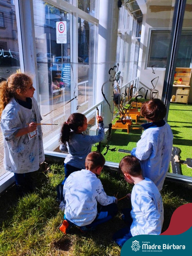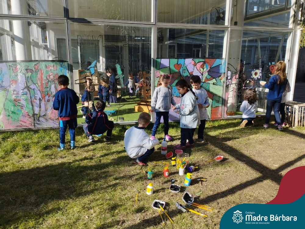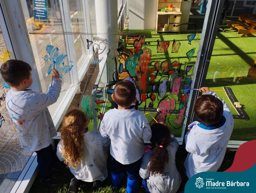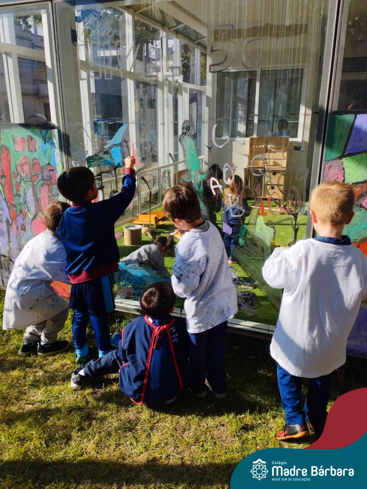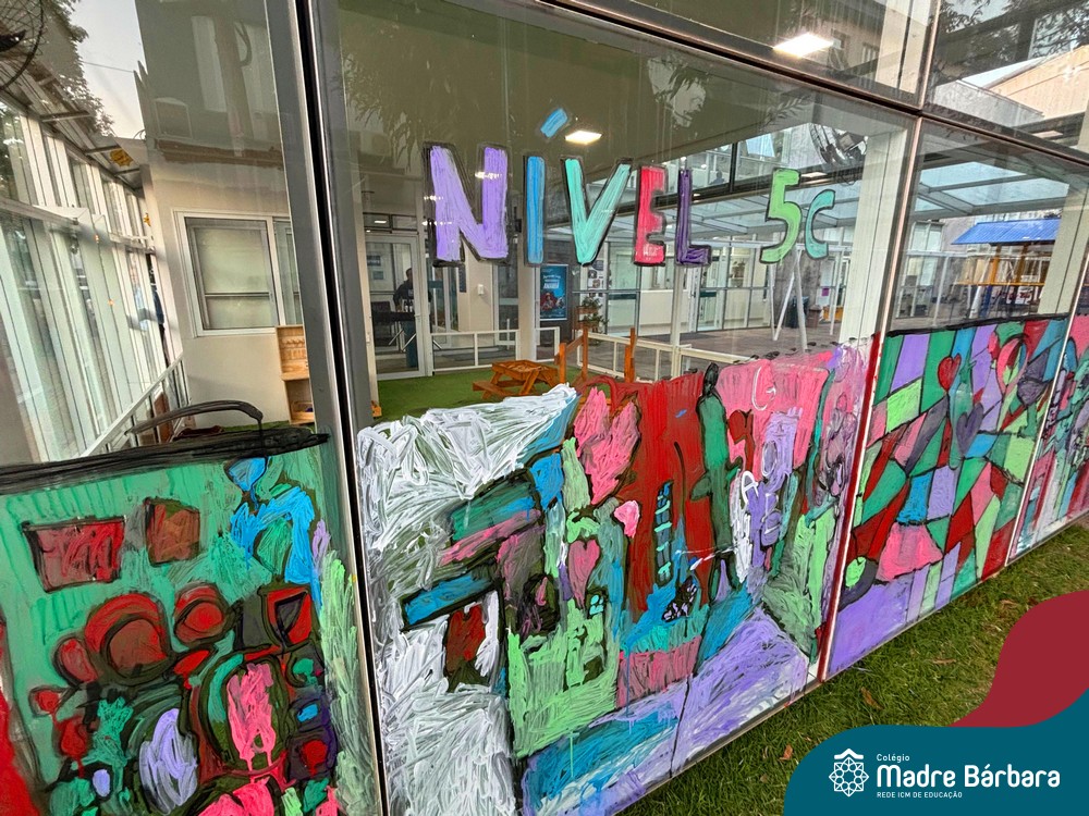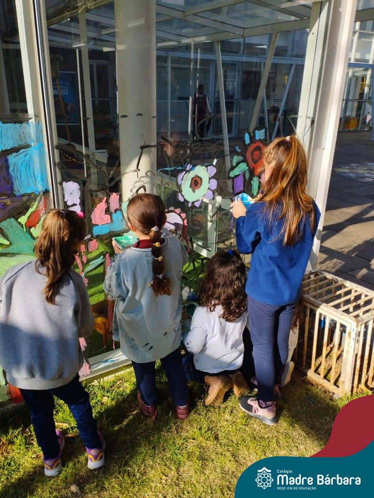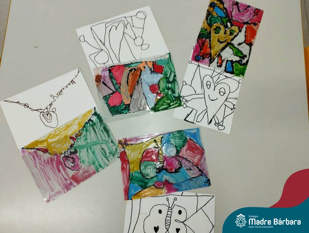 O envolvimento foi tão intenso, que a proposta se expandiu: “vamos fazer vitrais nos vidros da Educação Infantil?” Assim, os vidros do pátio do nosso colégio se transformaram em obras de arte. Em grupos as crianças conversaram e planejaram como construir os vitrais, desenharam cada detalhe, pintaram e se encantaram com a magia das cores, com a luz do sol e com suas criações.