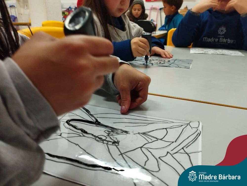 Inspiradas por tanta beleza, curiosidade e encanto, as crianças criaram seus próprios vitrais. Planejaram cada parte da construção, fizeram desenhos, contornaram em auto relevo e pintaram.