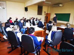 Na quinta (13) e sexta-feira (14) 25 colaboradores que compõe diversos setores do Colégio Madre Bárbara participaram do Seminário de Planejamento Estratégico da Rede ICM de Educação. O encontro foi ministrado pelo assessor da Rede, professor Gustavo de Ávila Martins, que liderou os temas: avaliação dos processos já implantados, análise dos processos administrativos e a projeção de mais ações de qualificação dos serviços prestados pelo Colégio. O Planejamento também contou com a presença da coordenadora de educação da Rede ICM, Irmã Elenar Luísa Berghahn e do responsável pelo TI da Rede, Renato Ramos. No último dia de encontro, crianças dos 4ºs anos do Ensino Fundamental homenagearam os participantes da formação, cantando uma bela música e relembrando o projeto realizado este ano dentro do Programa O Líder em Mim (OLEM), chamado “Calçando o Sapato dos Outros”.