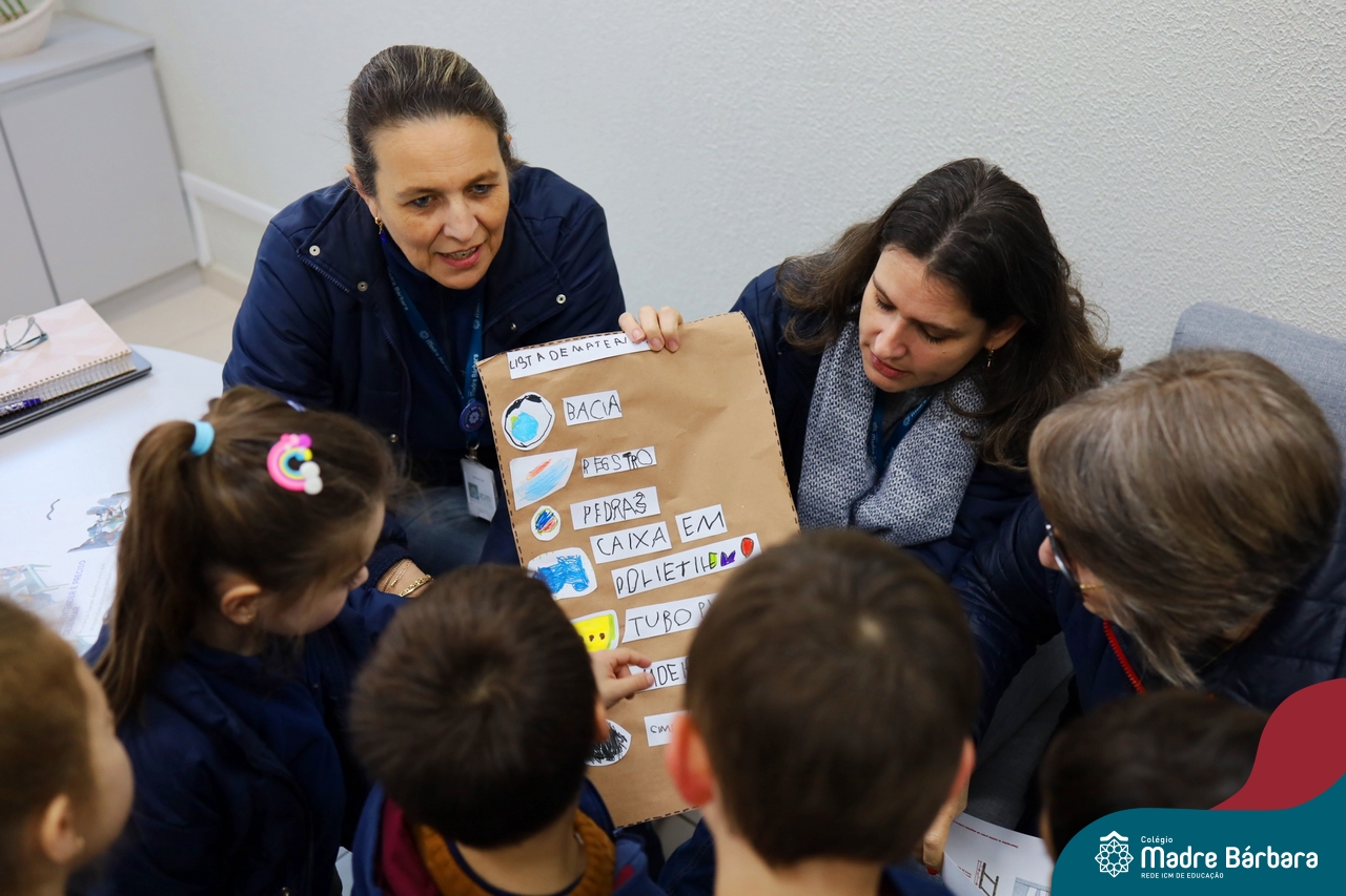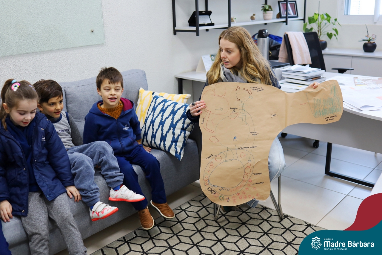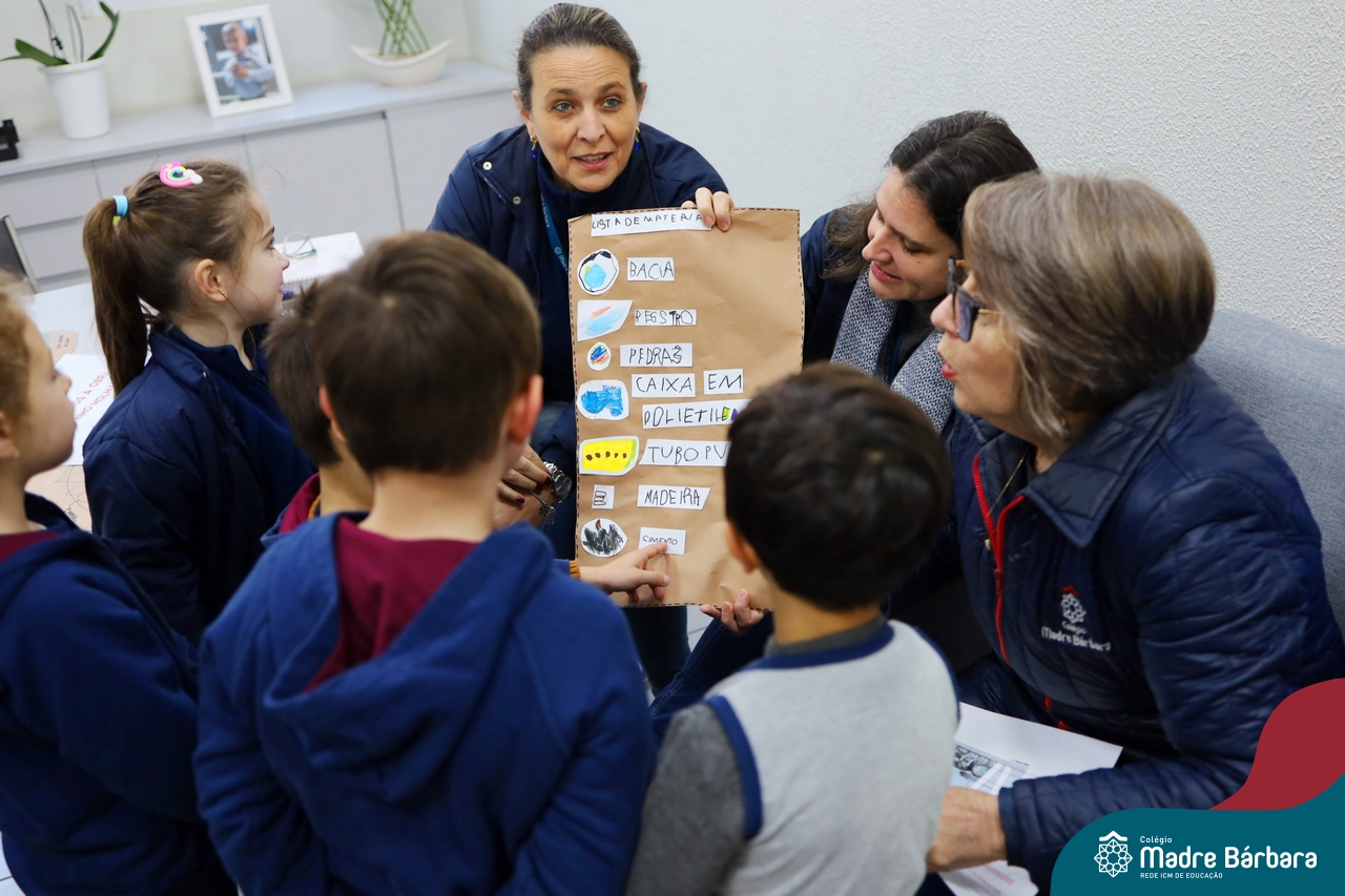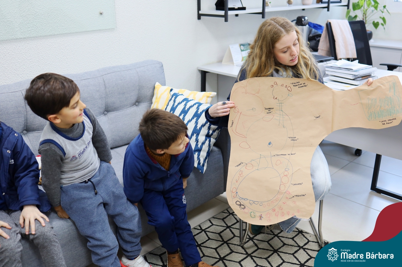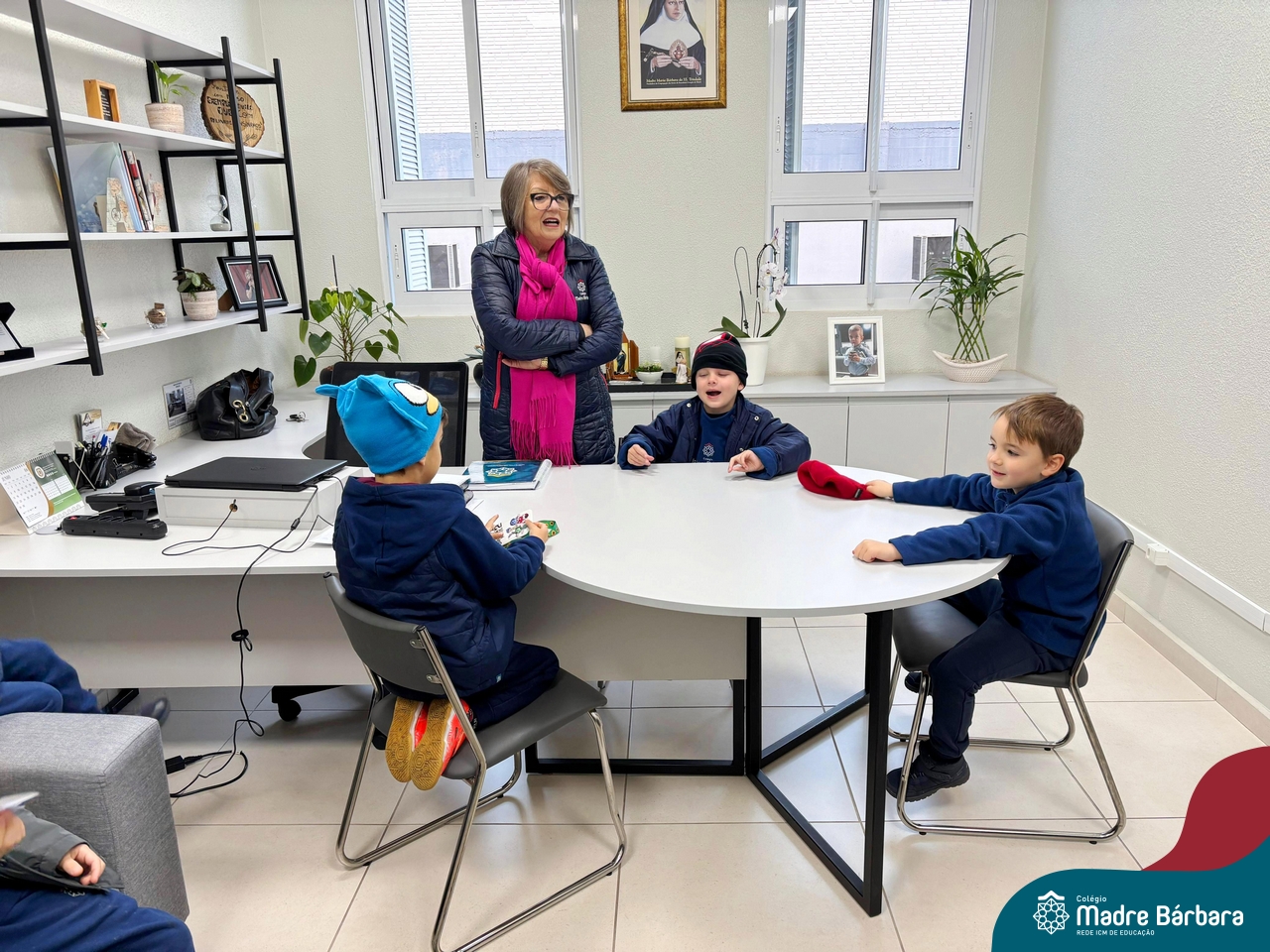 As crianças do 5B se reuniram com a diretora Maria Elena Jacques para apresentar o “Projeto Mãos à Obra: Cantinho Molhado” da Educação Infantil. Uma ideia cheia de pesquisa e propósito, pensada por elas no ateliê. Foi um momento de muitas trocas e escuta. Porque aqui no Madre a criança tem vez e voz!