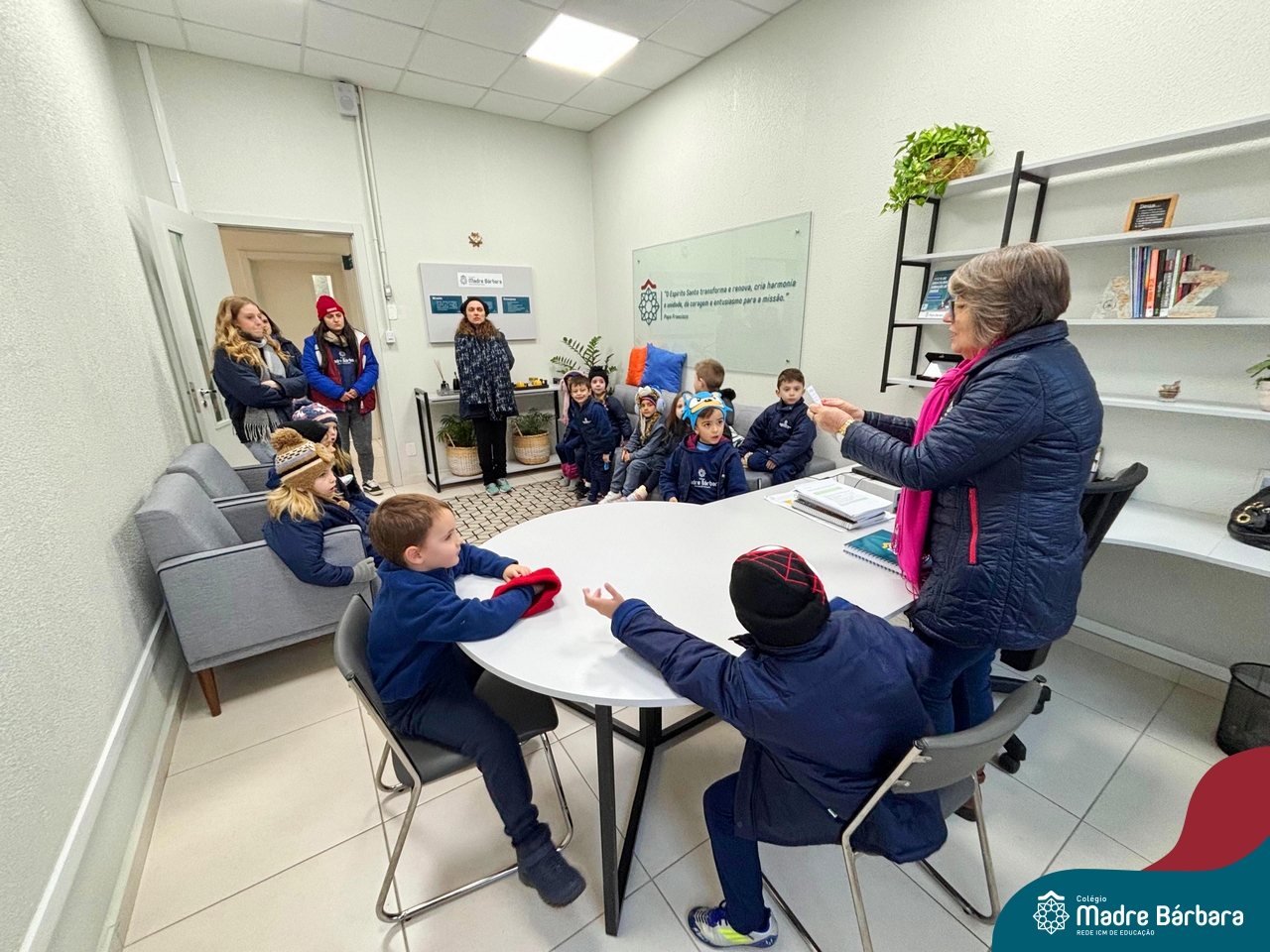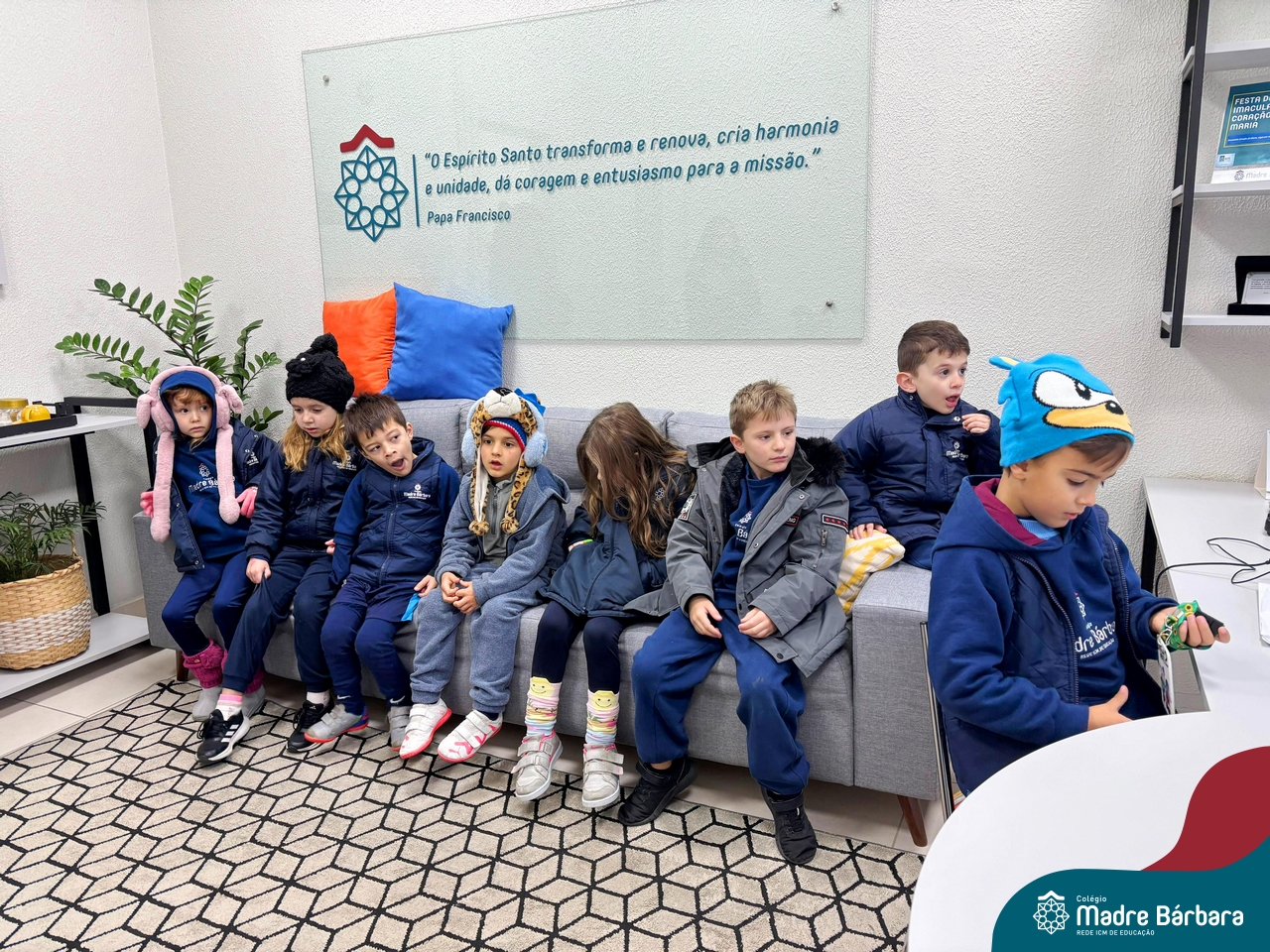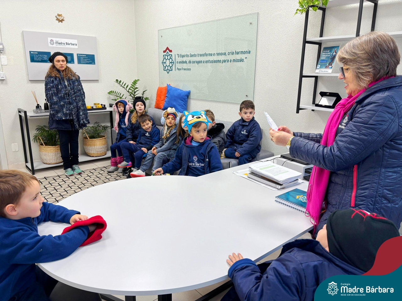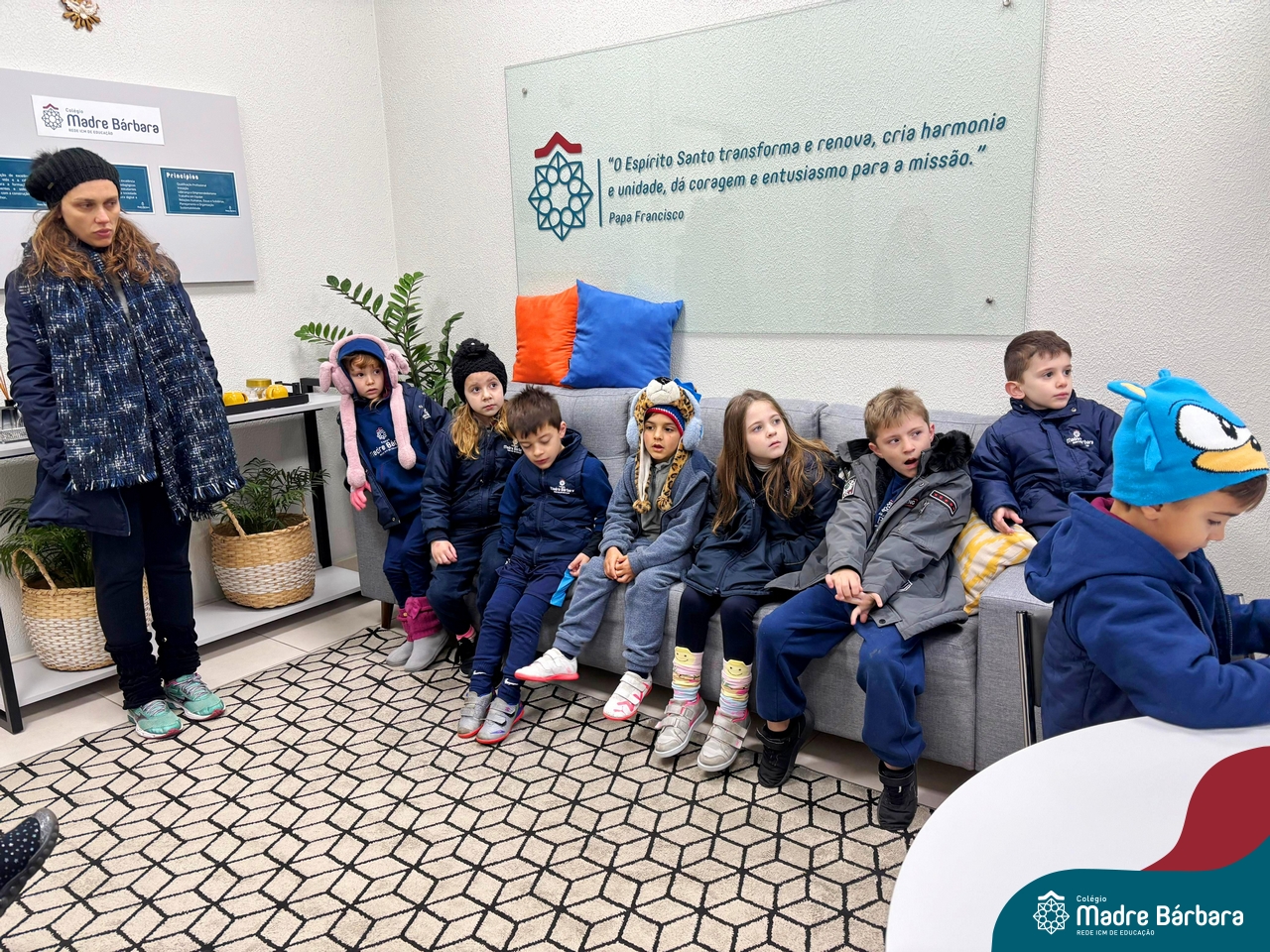 As crianças do 5B se reuniram com a diretora Maria Elena Jacques para apresentar o “Projeto Mãos à Obra: Cantinho Molhado” da Educação Infantil. Uma ideia cheia de pesquisa e propósito, pensada por elas no ateliê. Foi um momento de muitas trocas e escuta. Porque aqui no Madre a criança tem vez e voz!