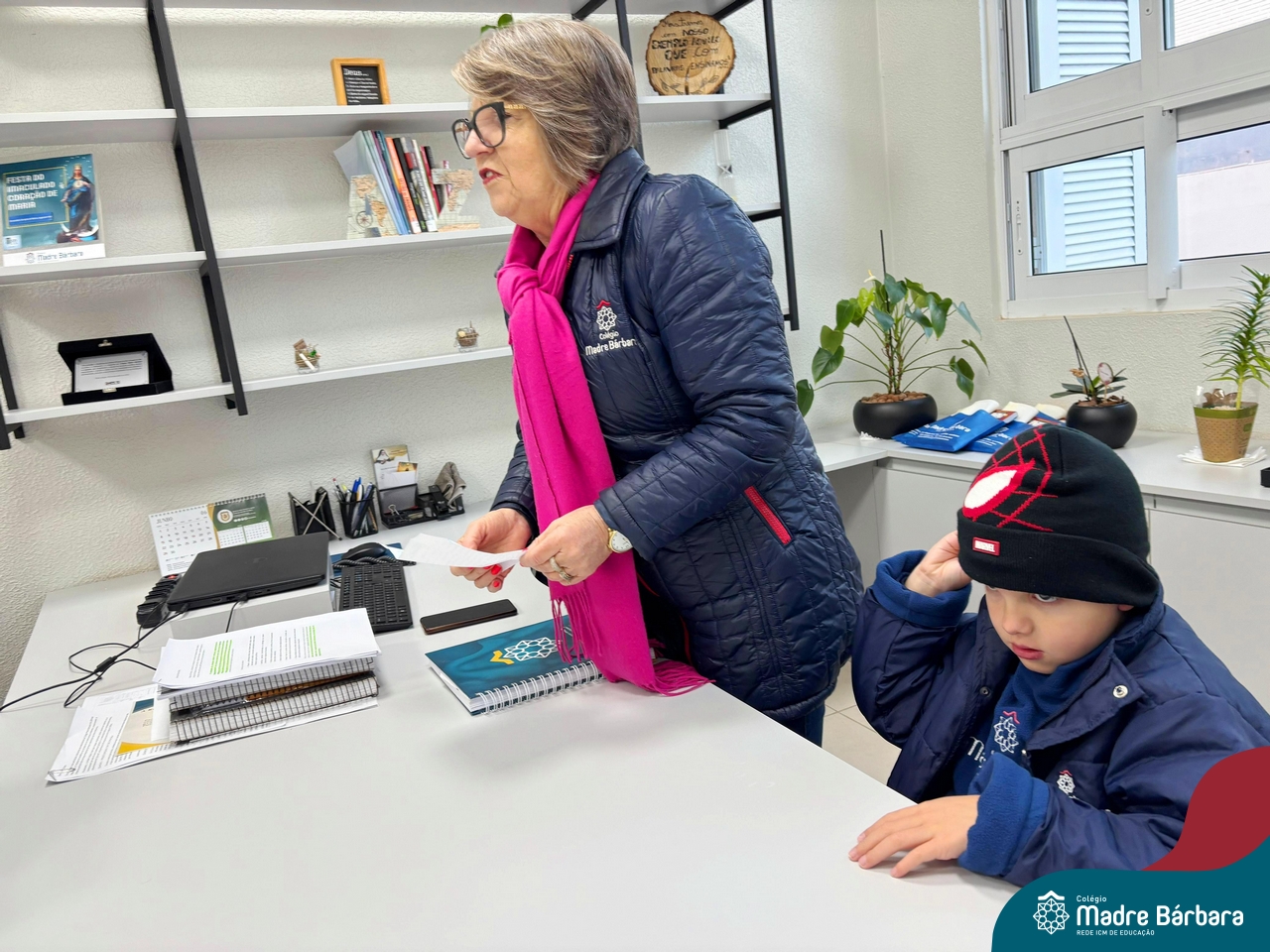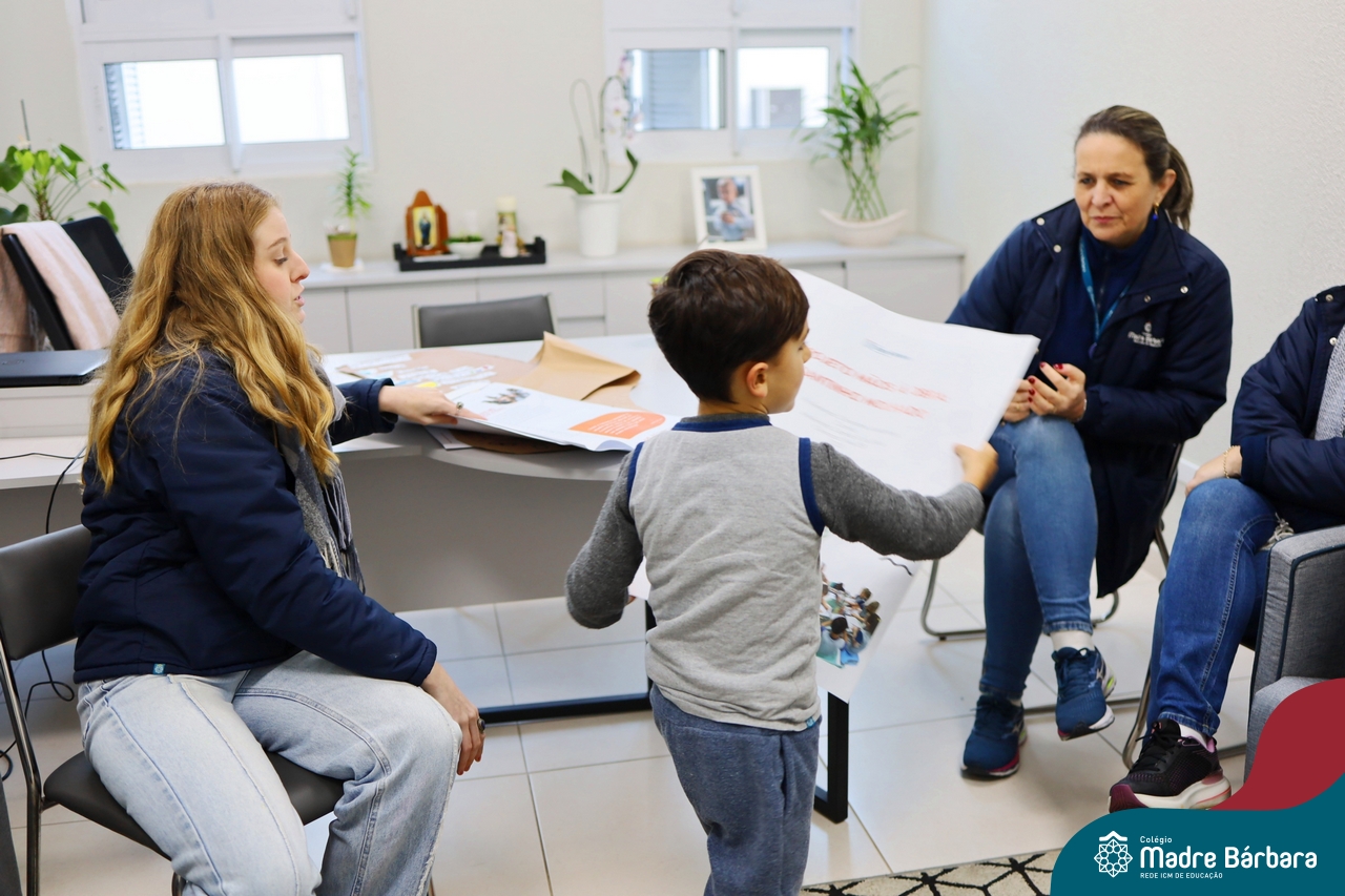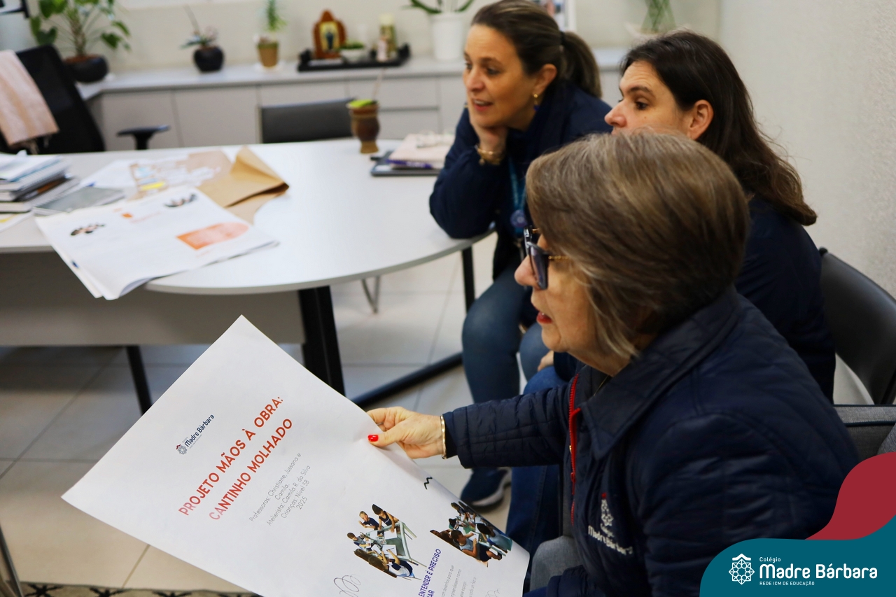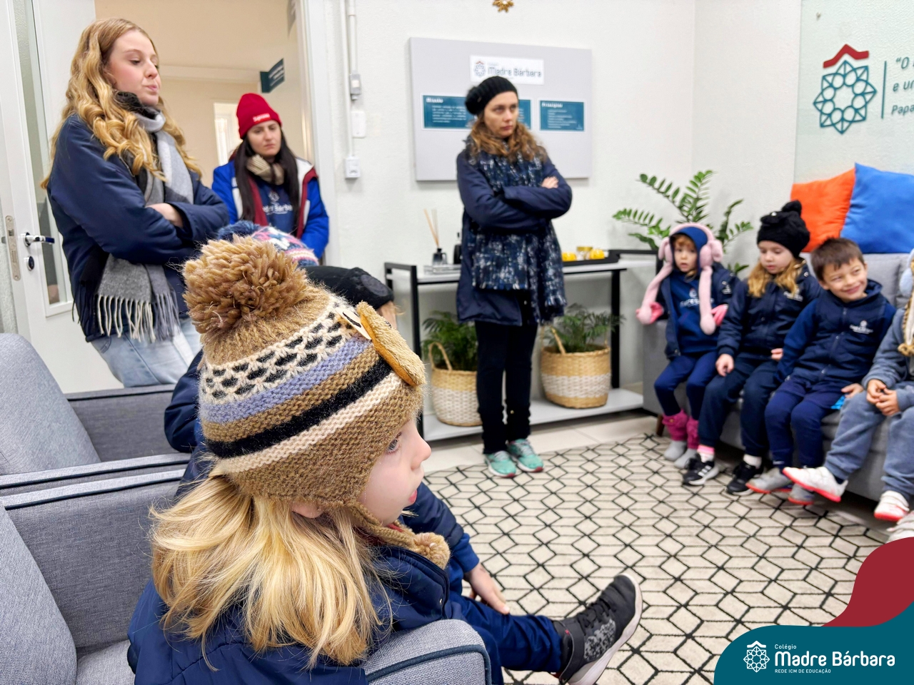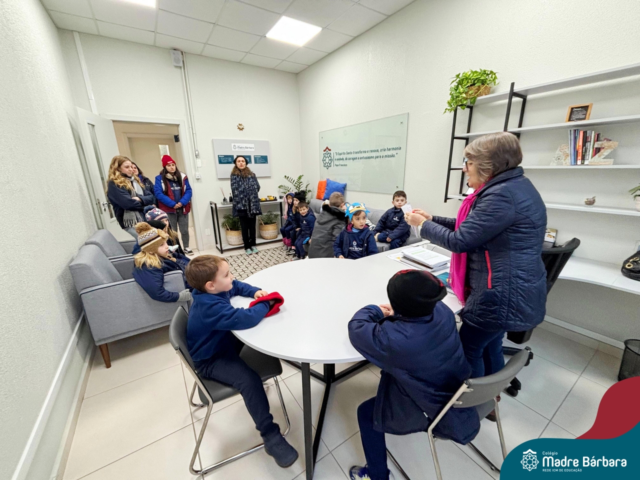 As crianças do 5B se reuniram com a diretora Maria Elena Jacques para apresentar o “Projeto Mãos à Obra: Cantinho Molhado” da Educação Infantil. Uma ideia cheia de pesquisa e propósito, pensada por elas no ateliê. Foi um momento de muitas trocas e escuta. Porque aqui no Madre a criança tem vez e voz!