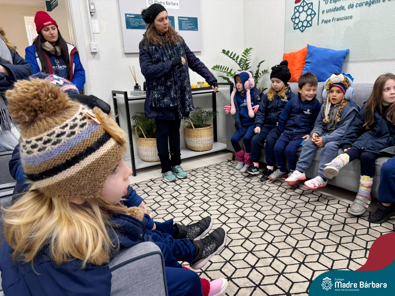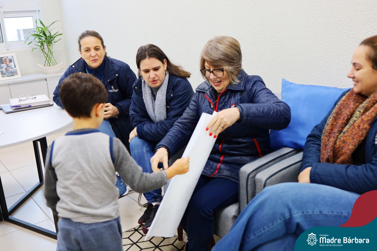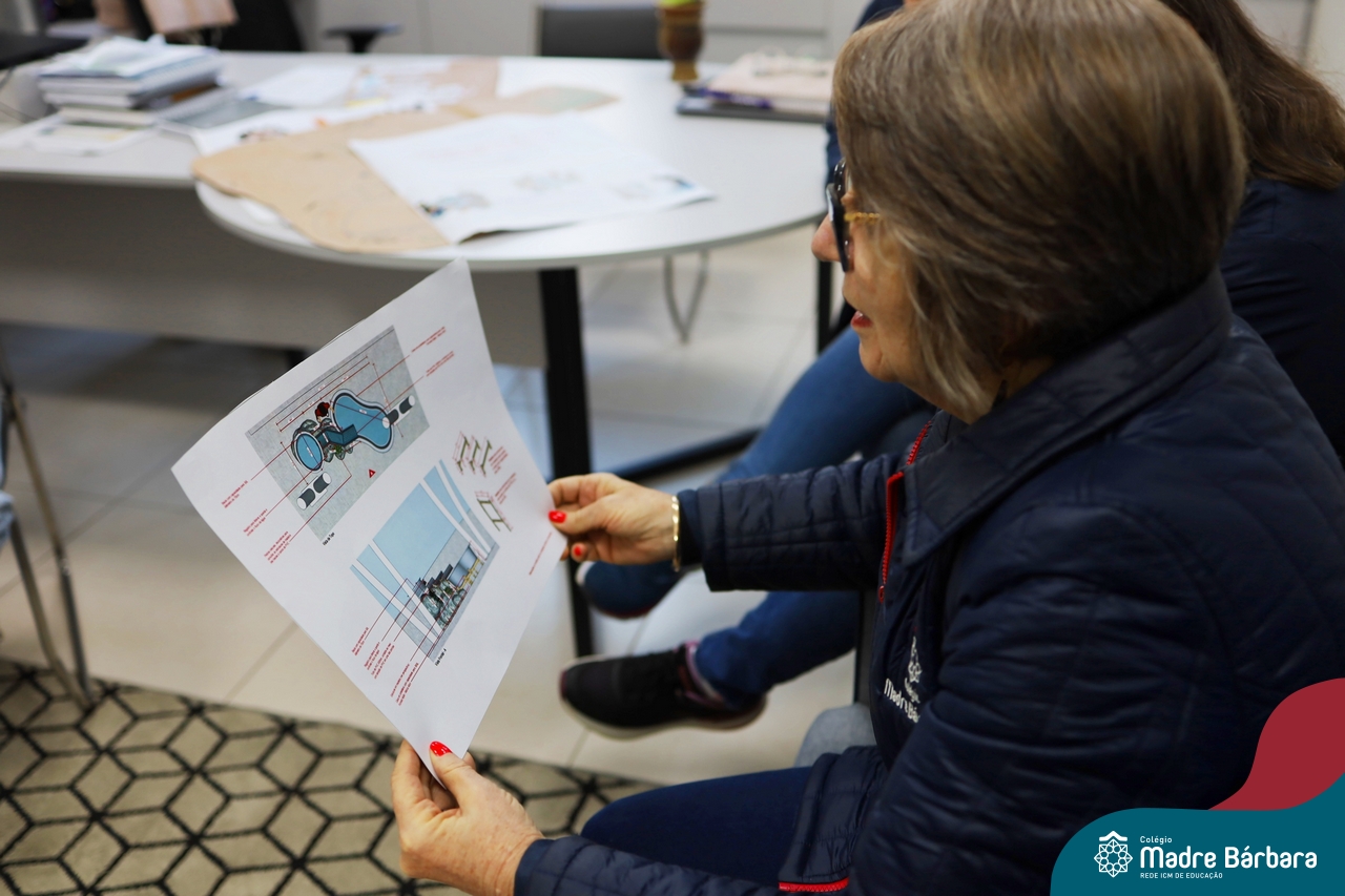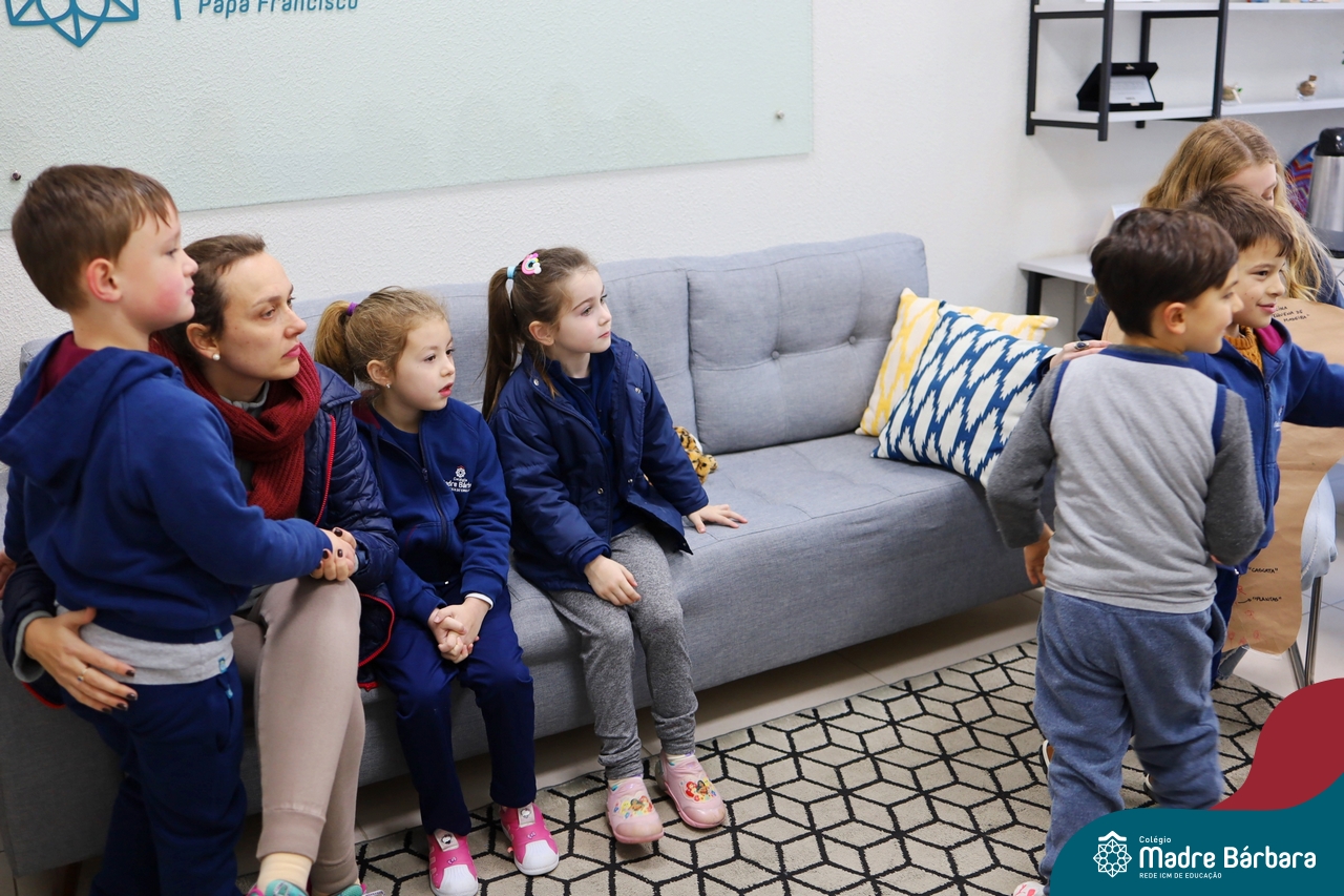 As crianças do 5B se reuniram com a diretora Maria Elena Jacques para apresentar o “Projeto Mãos à Obra: Cantinho Molhado” da Educação Infantil. Uma ideia cheia de pesquisa e propósito, pensada por elas no ateliê. Foi um momento de muitas trocas e escuta. Porque aqui no Madre a criança tem vez e voz!