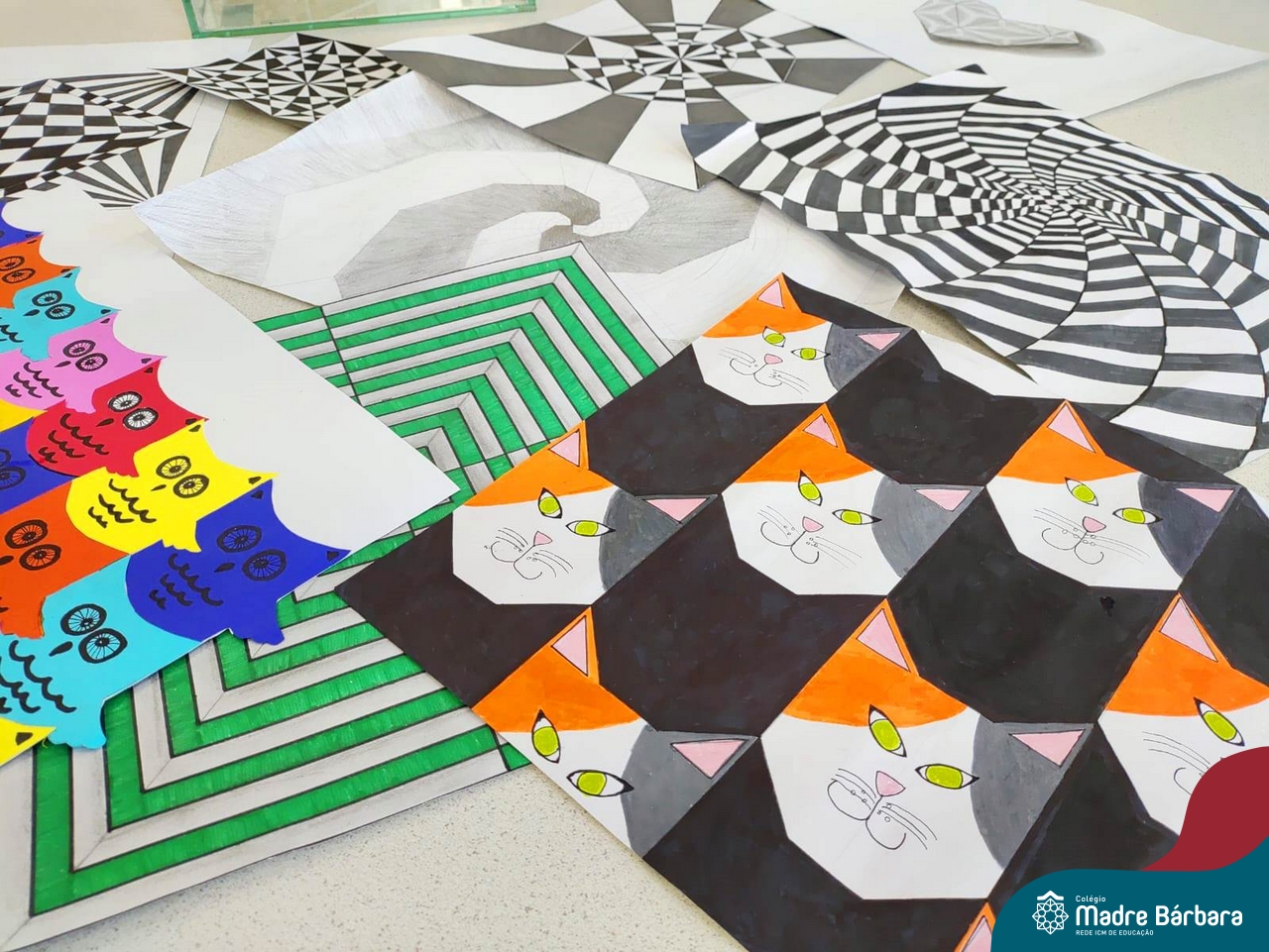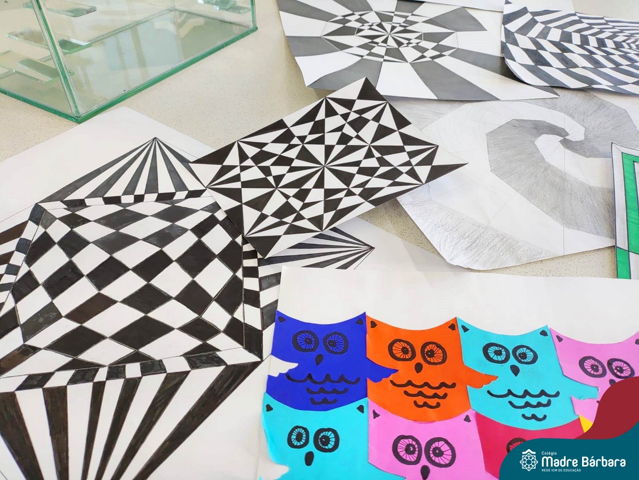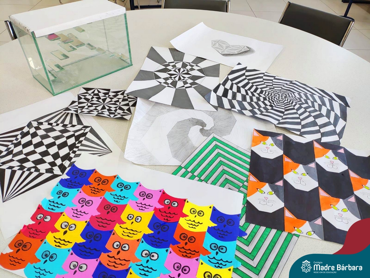 Neste mês de maio, estudantes das turmas 101 e 102 produziram obras interessantes e curiosas nas aulas de Artes e de Matemática. Inspirados nas obras do artista Escher, utilizaram conceitos geométricos relacionados à simetria, rotação, translação e deram asas à criatividade. De seus traçados, recortes, encaixes de polígonos regulares e espelhos, surgiu tridimensionalidade, ilusão de óptica e complexidade característica das instigantes obras de Escher.