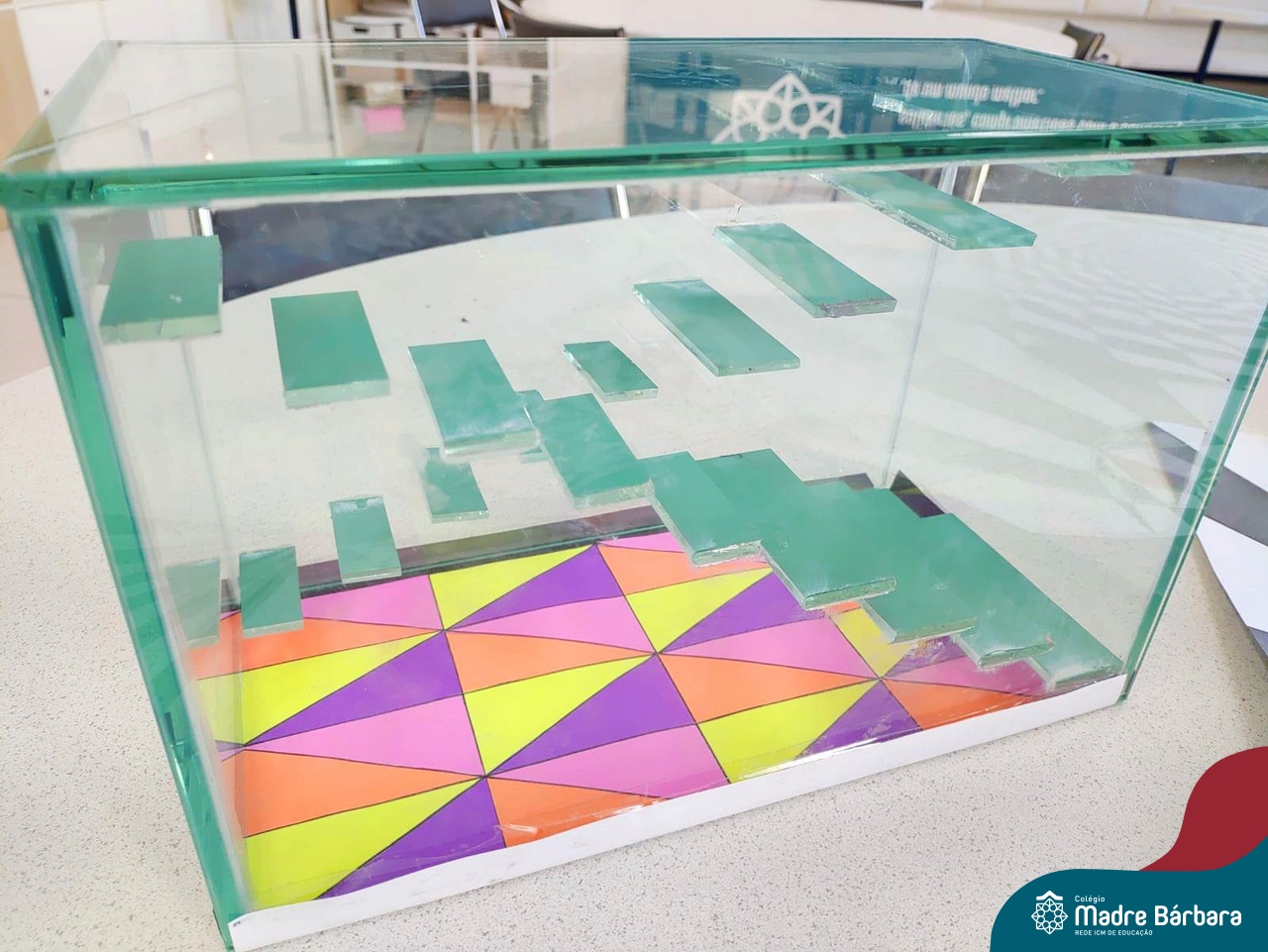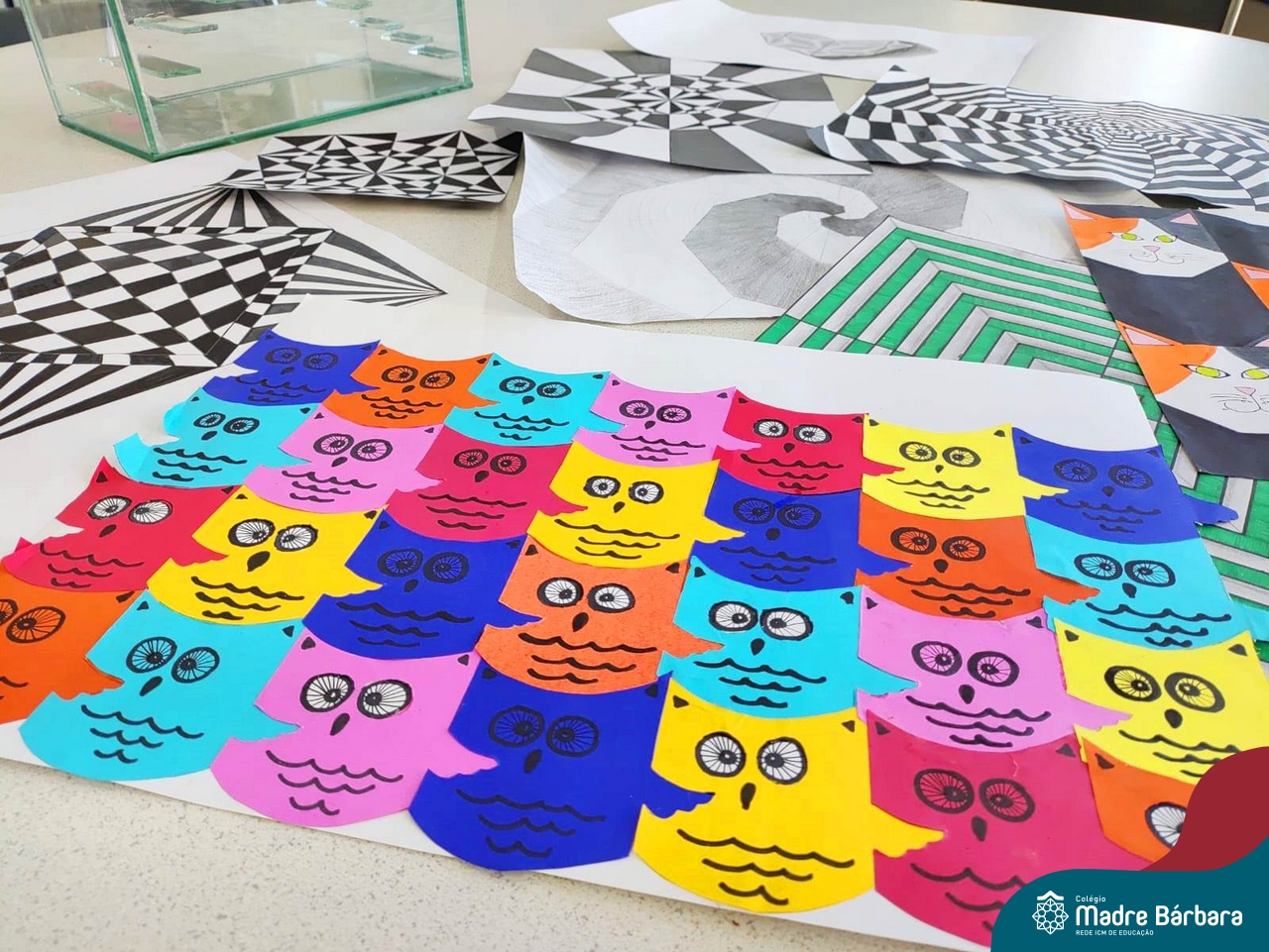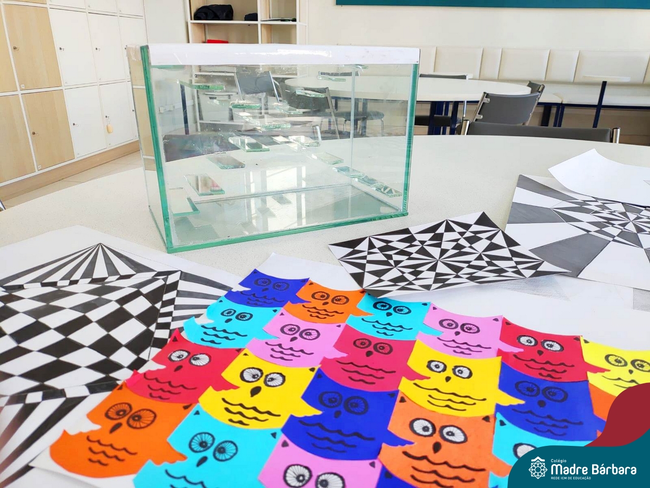 Neste mês de maio, estudantes das turmas 101 e 102 produziram obras interessantes e curiosas nas aulas de Artes e de Matemática. Inspirados nas obras do artista Escher, utilizaram conceitos geométricos relacionados à simetria, rotação, translação e deram asas à criatividade. De seus traçados, recortes, encaixes de polígonos regulares e espelhos, surgiu tridimensionalidade, ilusão de óptica e complexidade característica das instigantes obras de Escher.