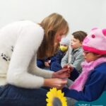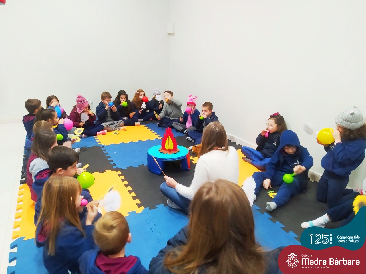 Já no segundo encontro as crianças falaram um pouco sobre os 4 elementos da natureza e exercitaram a respiração com exercício prático de cheirar a flor (inspirar) e assoprar o balão (expirar).