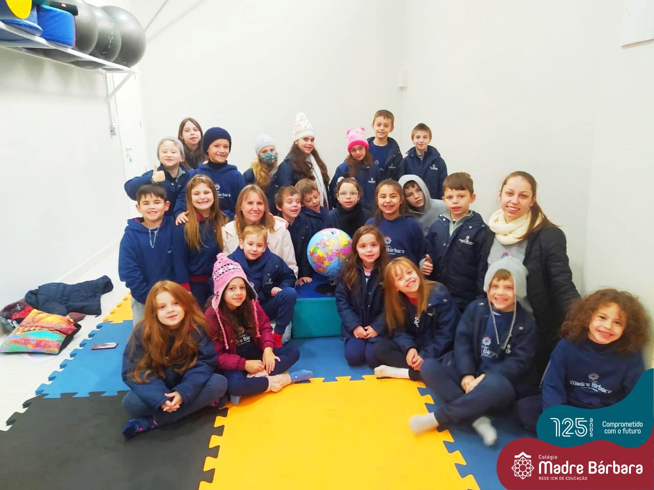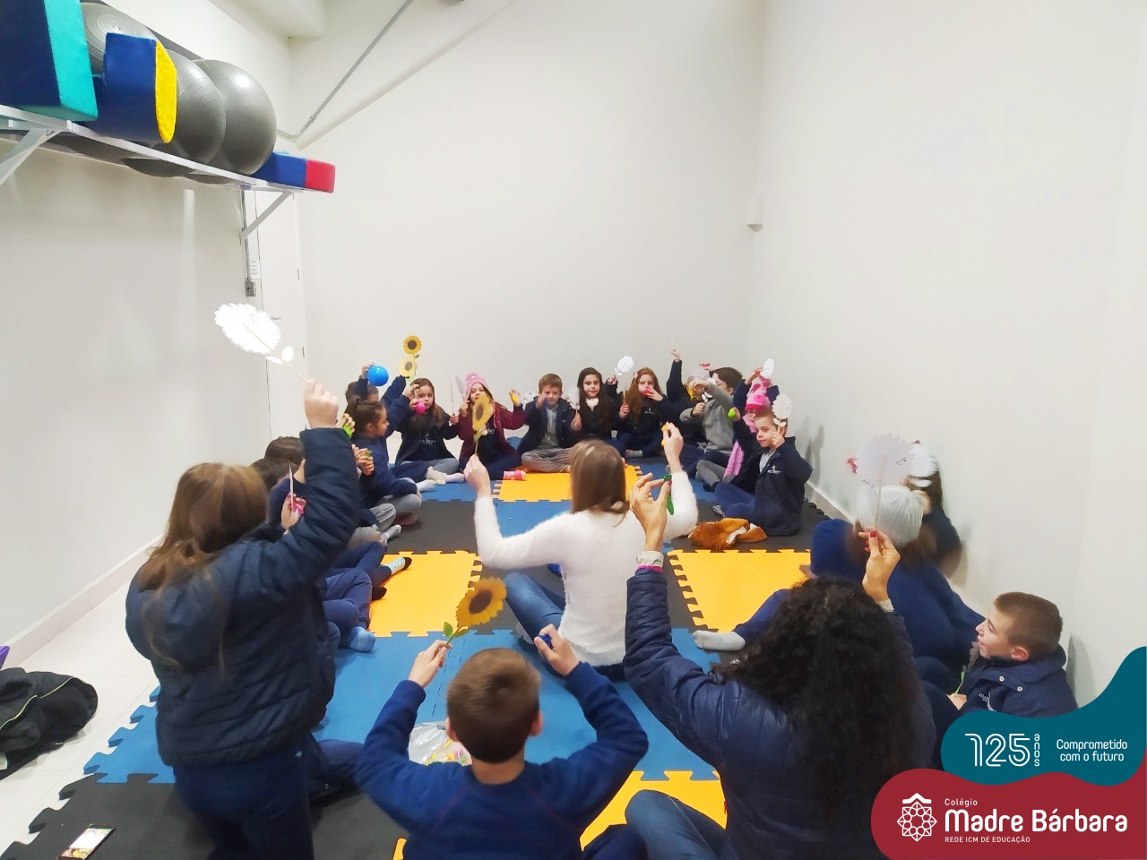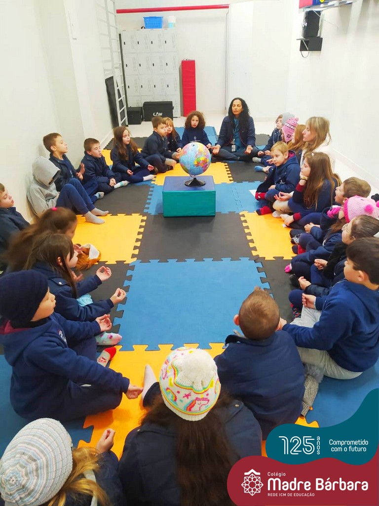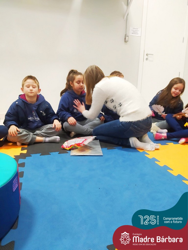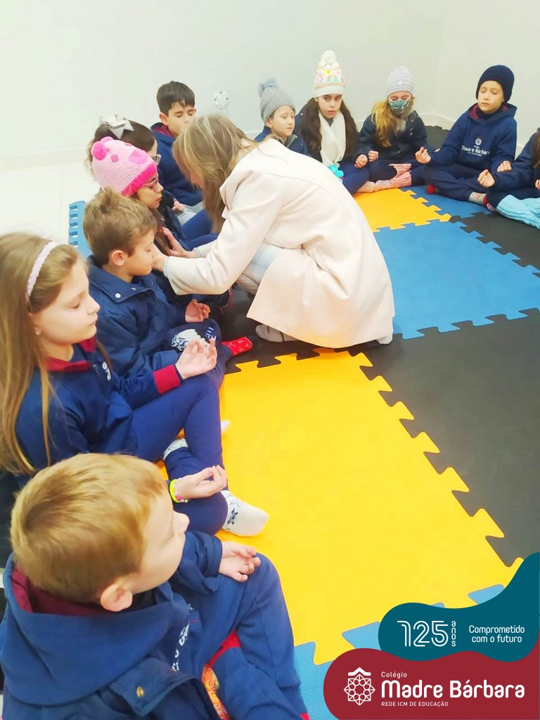 As crianças da turma 11 estão experienciando vivências de meditação com a terapeuta Cristina Scheibel. A Cris como é chamada pelas crianças é mãe do colega Iuri, e está oportunizando a meditação como prática para o contato com o equilíbrio interno desde pequenos. No primeiro encontro, as crianças experienciaram práticas de respiração e de emanar bons sentimentos através das cores para o Planeta Terra.