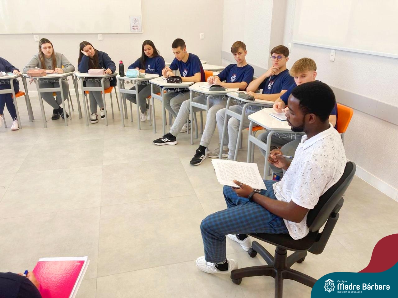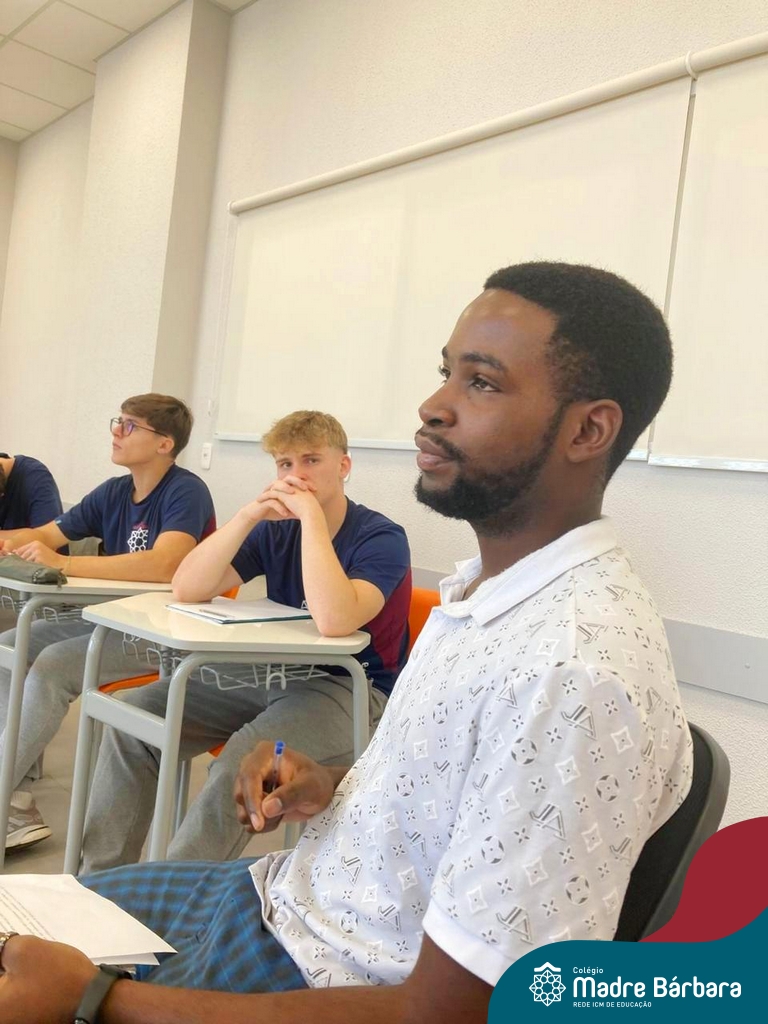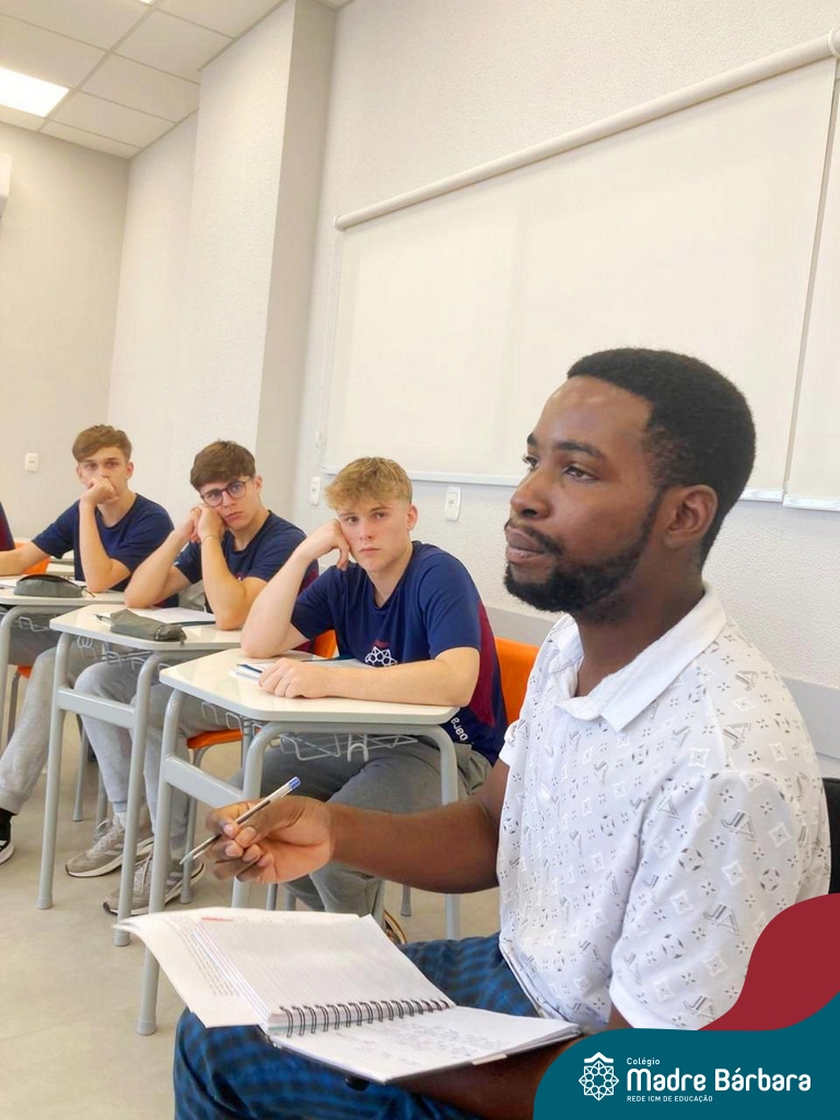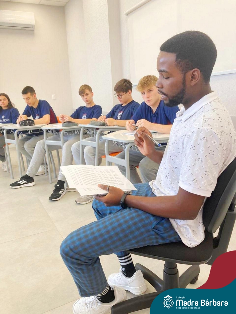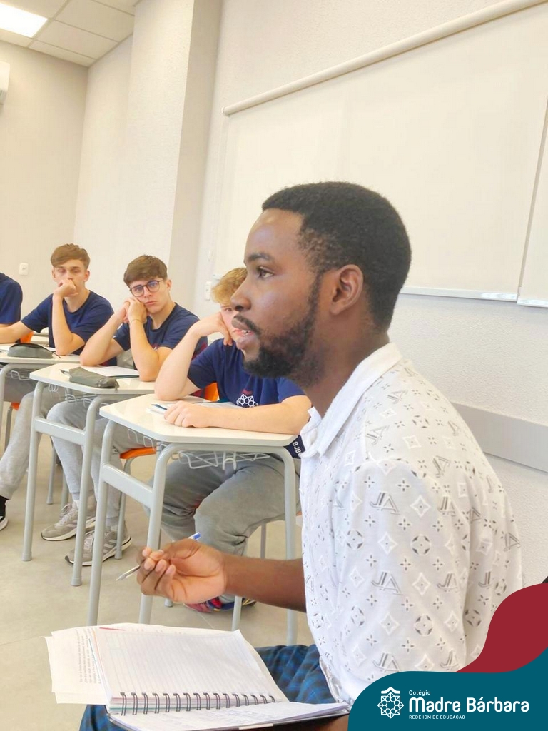 Proposta no Itinerário Direitos Humanos e Ética, a roda de conversa com o intercambista moçambicano Custódio Daniel teve por objetivo provocar a reflexão crítica dos estudantes da 2ª série do Ensino Médio sobre a realidade dos direitos humanos em contextos internacionais e compreender os desafios atuais da governança global da imigração. A atividade foi proposta e mediada pela professora Juciane Beatriz Sehn e pelo monitor Uarlley Santana Santos. A roda de conversa foi uma rica oportunidade de aprendizagem interdisciplinar, a partir do olhar de dentro, sob uma perspectiva da experiência de pessoa deslocada, de conhecimentos ancestrais compartilhados e de um olhar crítico sobre a realidade interna, levando em consideração as interferências externas.