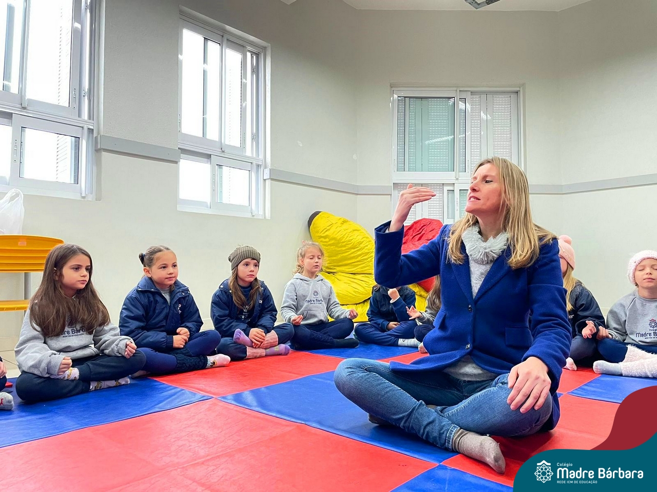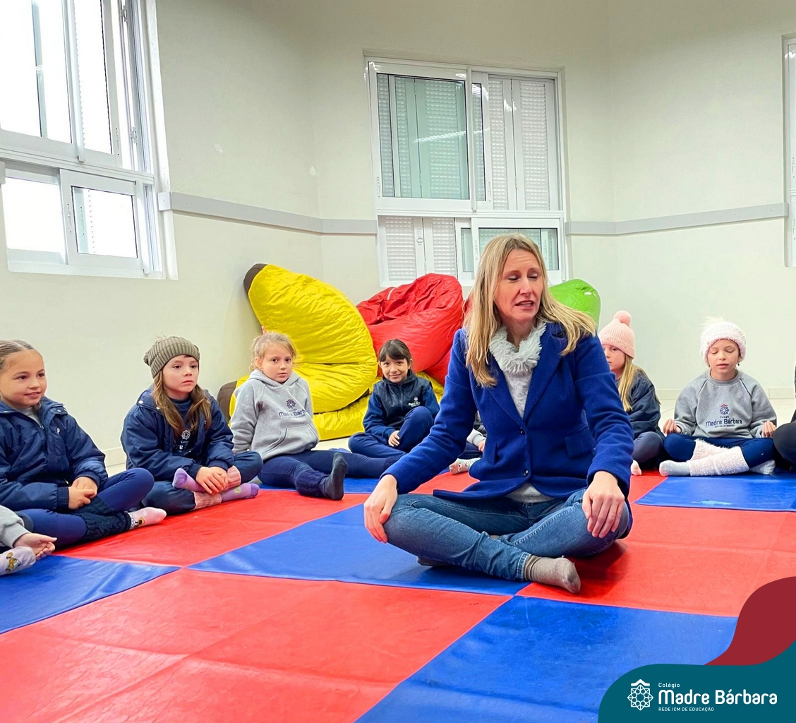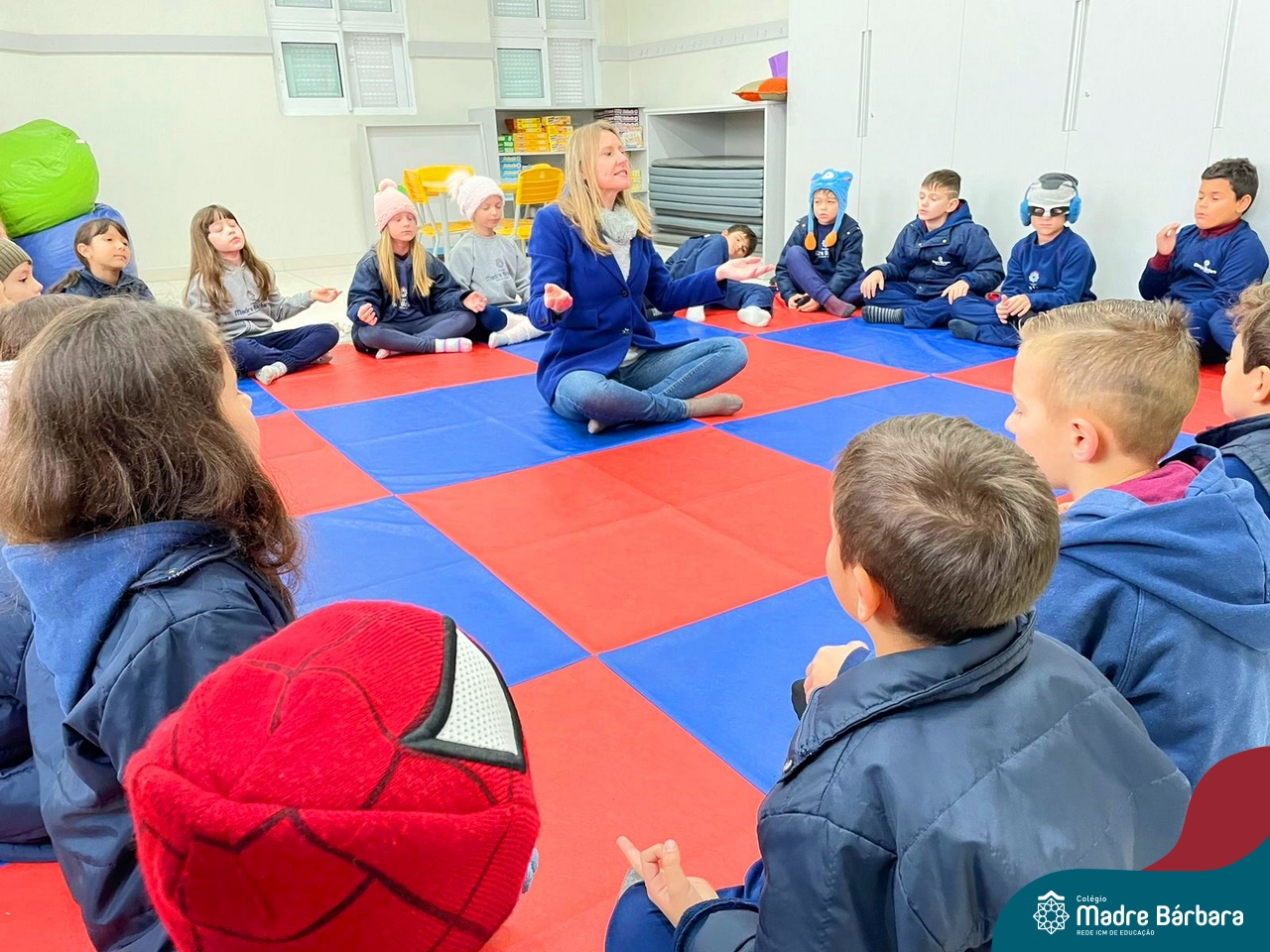 Nesta quarta-feira, dia 14/06, os estudantes da turma 22, do 2º ano do Ensino Fundamental – Anos Iniciais do Colégio Madre Bárbara – Rede ICM, juntamente com sua professora Caroline e monitora Gabriely, receberam a visita da terapeuta mestre em Reiki, Cristina Scheibel, proprietária do Espaço Terapêutico Sol e Lua. A profissional realizou um momento de meditação, propondo exercícios de respiração, equilíbrio do corpo e da mente, contribuindo no desenvolvimento da saúde emocional.