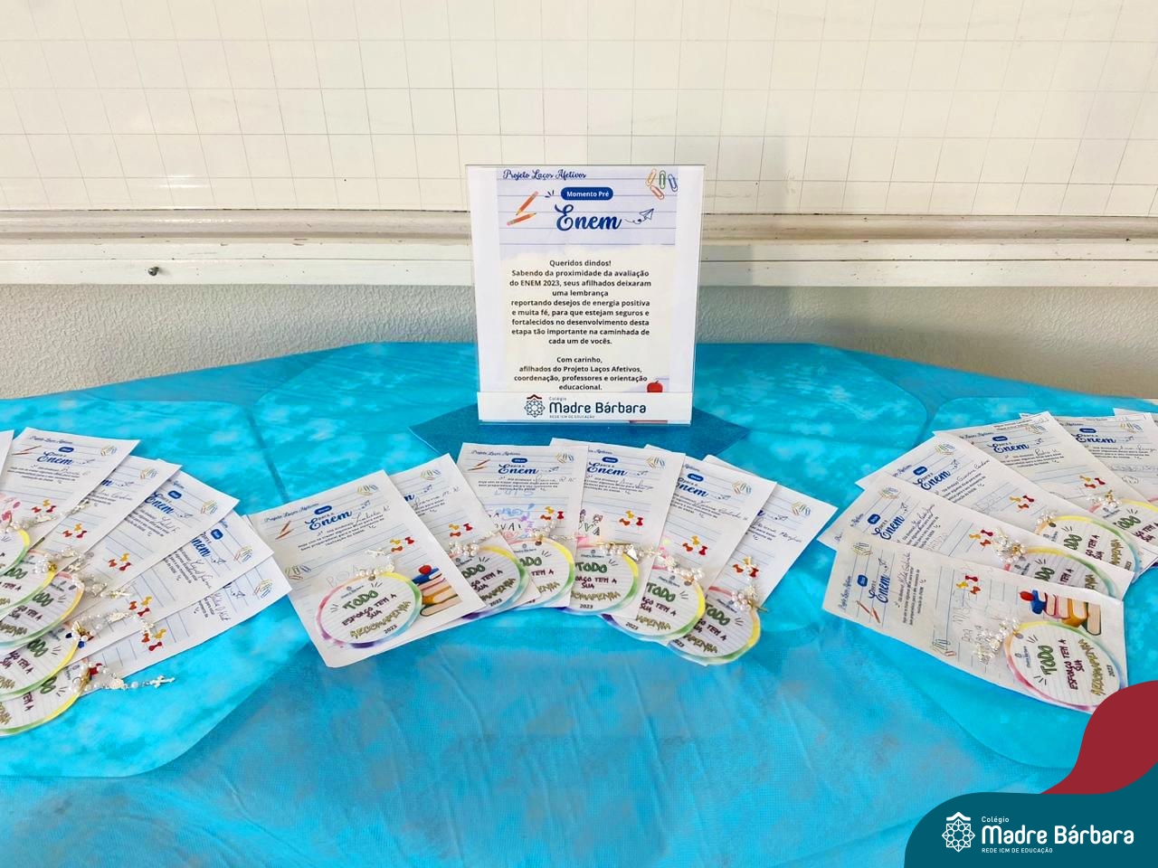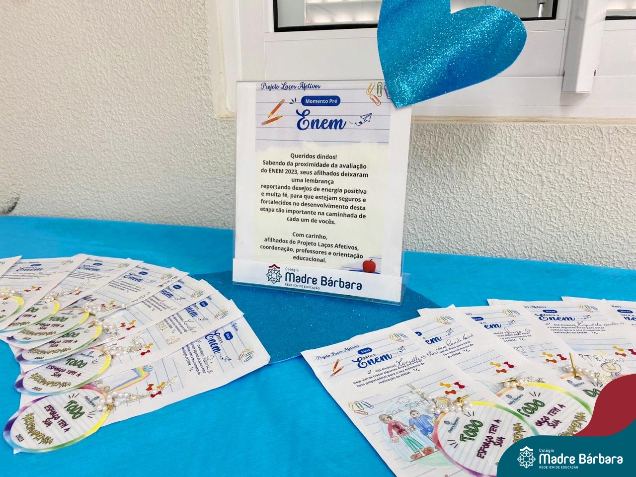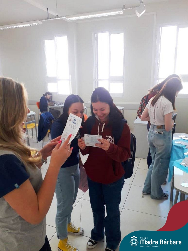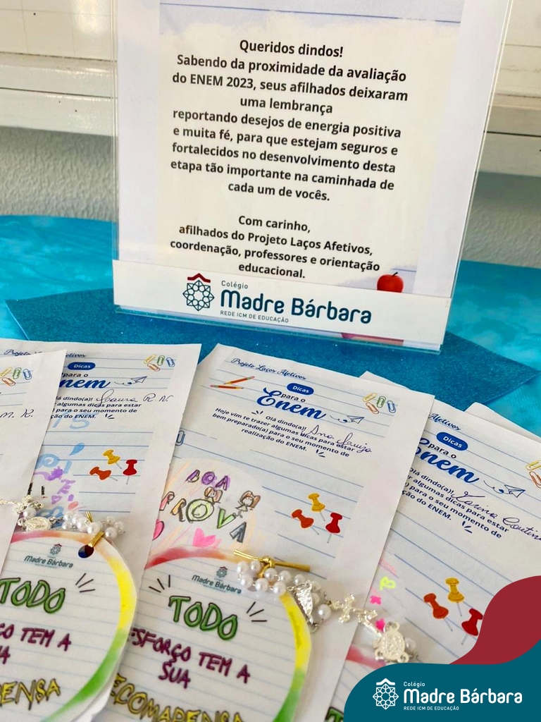 Na manhã desta sexta-feira (27.10), os alunos do Terceirão 2023 foram recepcionados com uma surpresa confeccionada pelos afilhados, alunos dos 1º anos do Ensino Fundamental – Anos Iniciais. A atividade faz parte do Projeto Laços Afetivos, acompanhado e planejado pelo Serviço de Orientação Educacional (SOE) do Colégio Madre Bárbara – Rede ICM. Nesta ocasião, os alunos deixaram um cartão personalizado, com dicas para que os dindos estejam preparados e fortalecidos neste importante momento de suas vidas, que iniciará no domingo do dia 05.11.23, sendo a primeira etapa da prova do ENEM 2023. Junto deste, receberam um tercinho, simbolizando a energia positiva e fortalecendo a importância da fé e determinação para conseguirem seus objetivos e alcancarem os mais diversos sonhos.