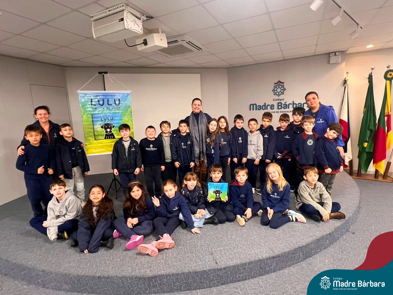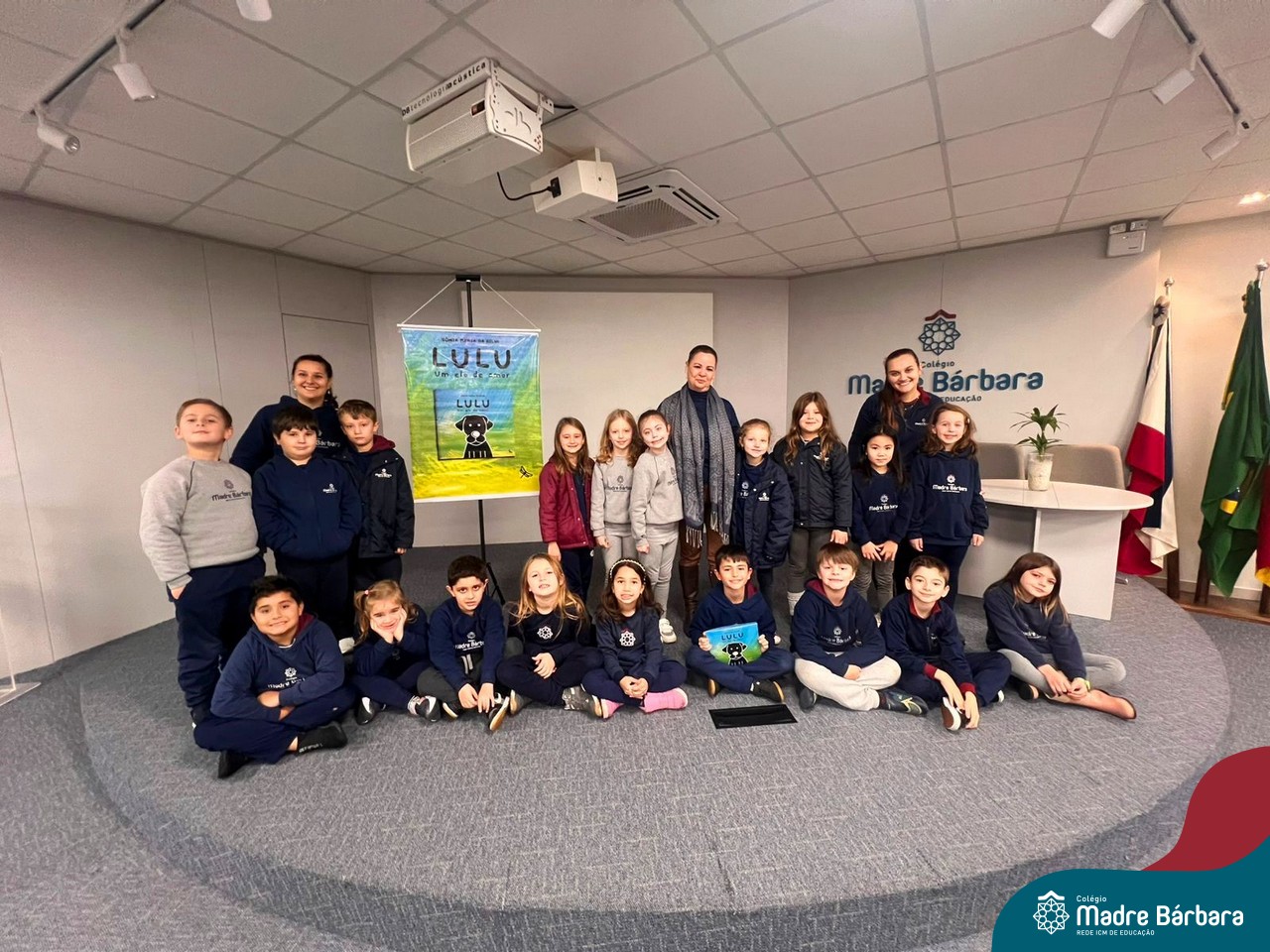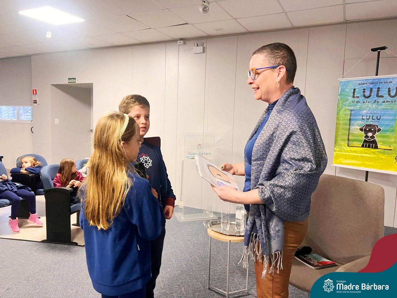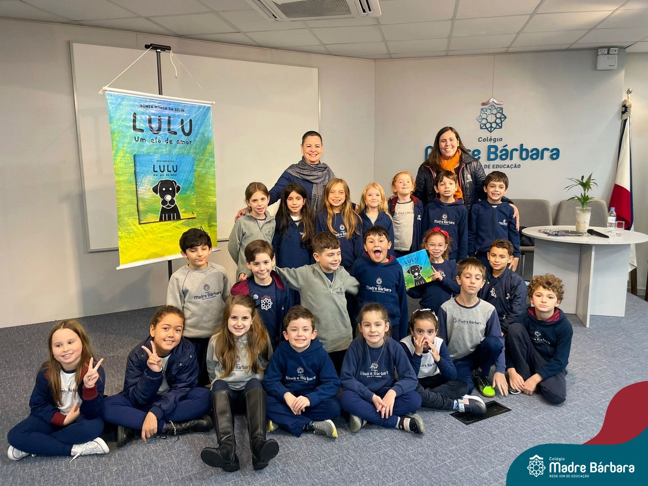 Sônia nos apresentou seu livro: “Lulu, um elo de amor”, obra que percorreu as turmas 21, 22, 23, 24 e 25, sendo explorada com carinho e dedicação pelas professoras Caroline, Mariana, Mara, Simoni e Vitória. Através das rimas e mensagens do livro, os alunos refletiram sobre temas valiosos como adoção responsável de animais, valorização da família, afetos verdadeiros e a importância de fazer o bem.