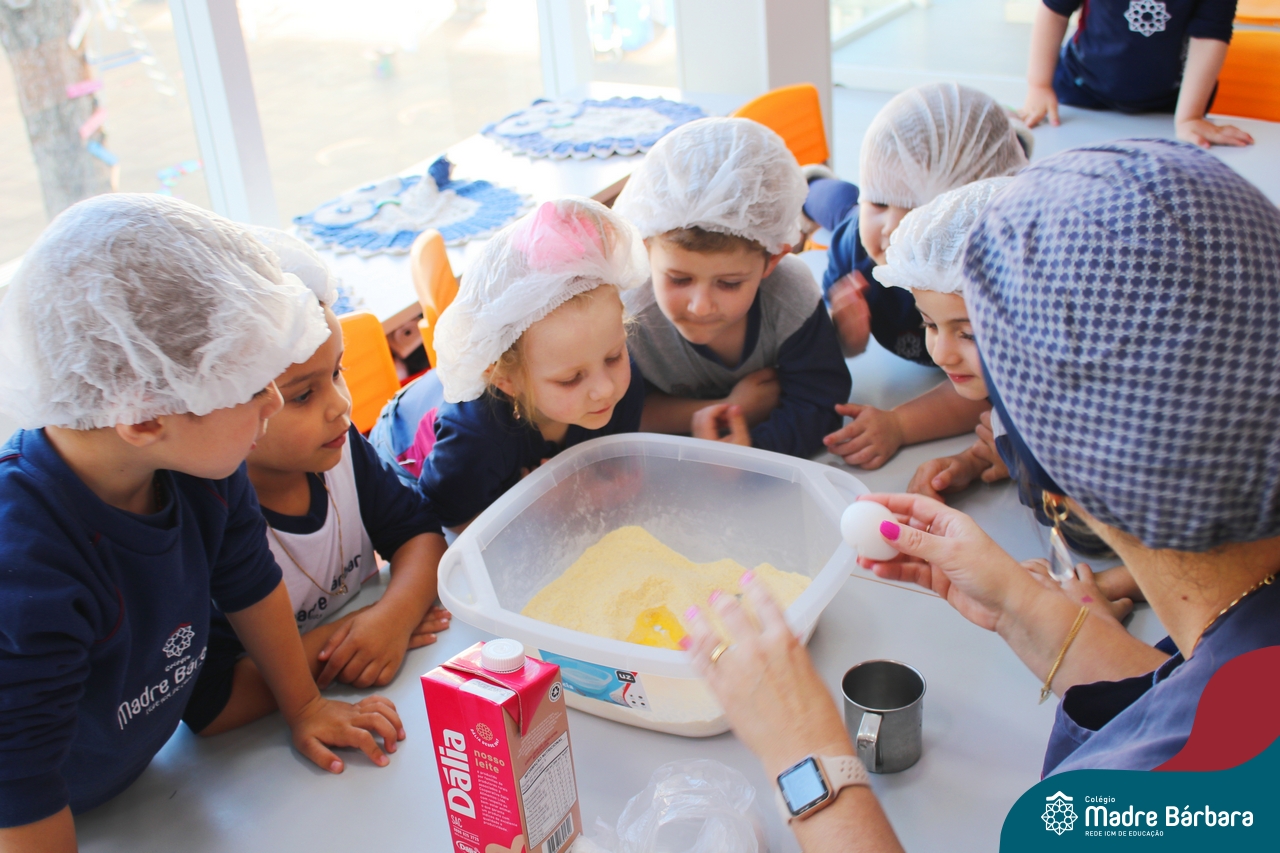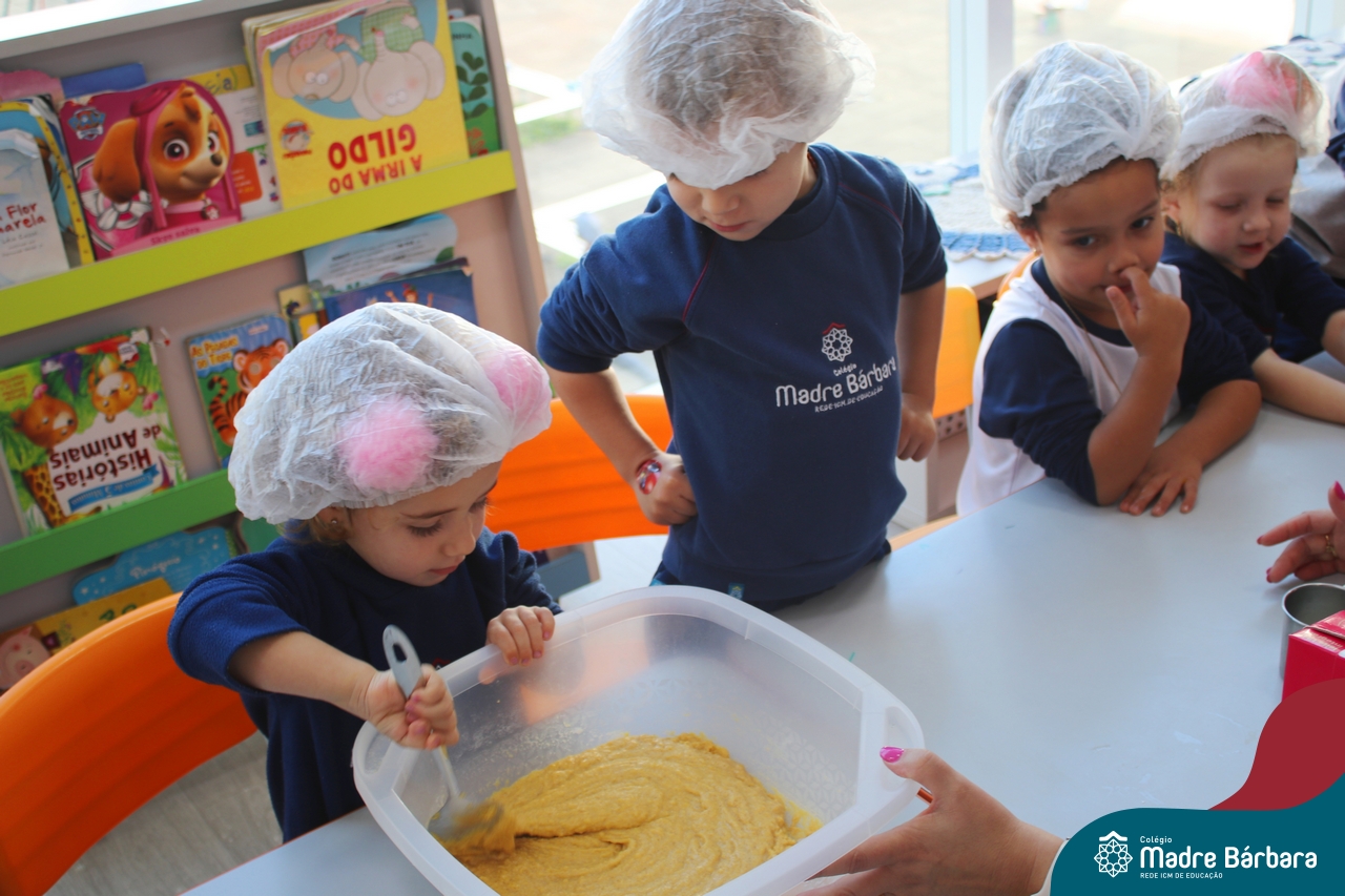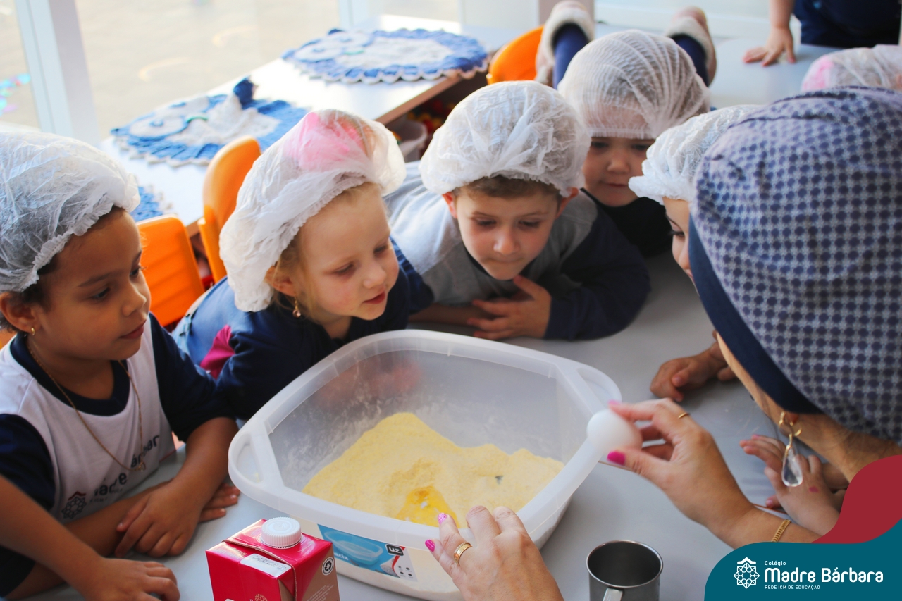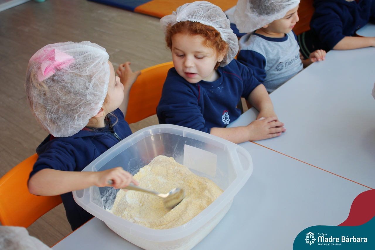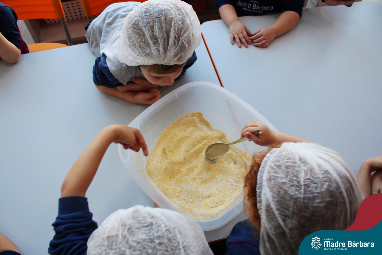 A turma do Nível 3B realizou um momento de culinária, fazendo um delicioso bolo de milho. Agregando ao projeto de arte e sensações, as crianças puderam explorar grãos, sentindo a textura, espessura, entre outras sensações. Eles colocaram a mão na massa! O bolo de milho também é uma comida típica das Festas Juninas, lembrando que no dia 10.06 será realizado o tradicional Arraiá do CMB. Venham todos participar!