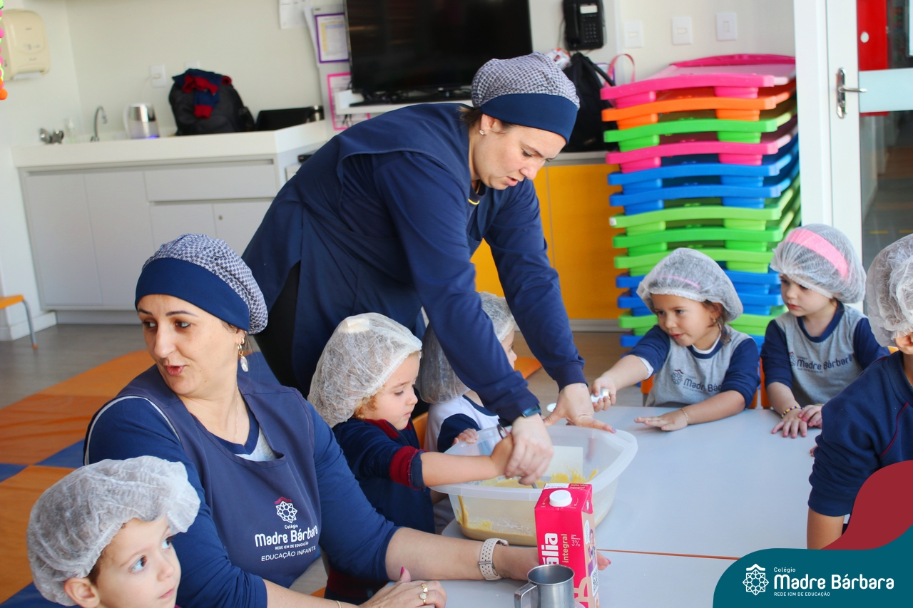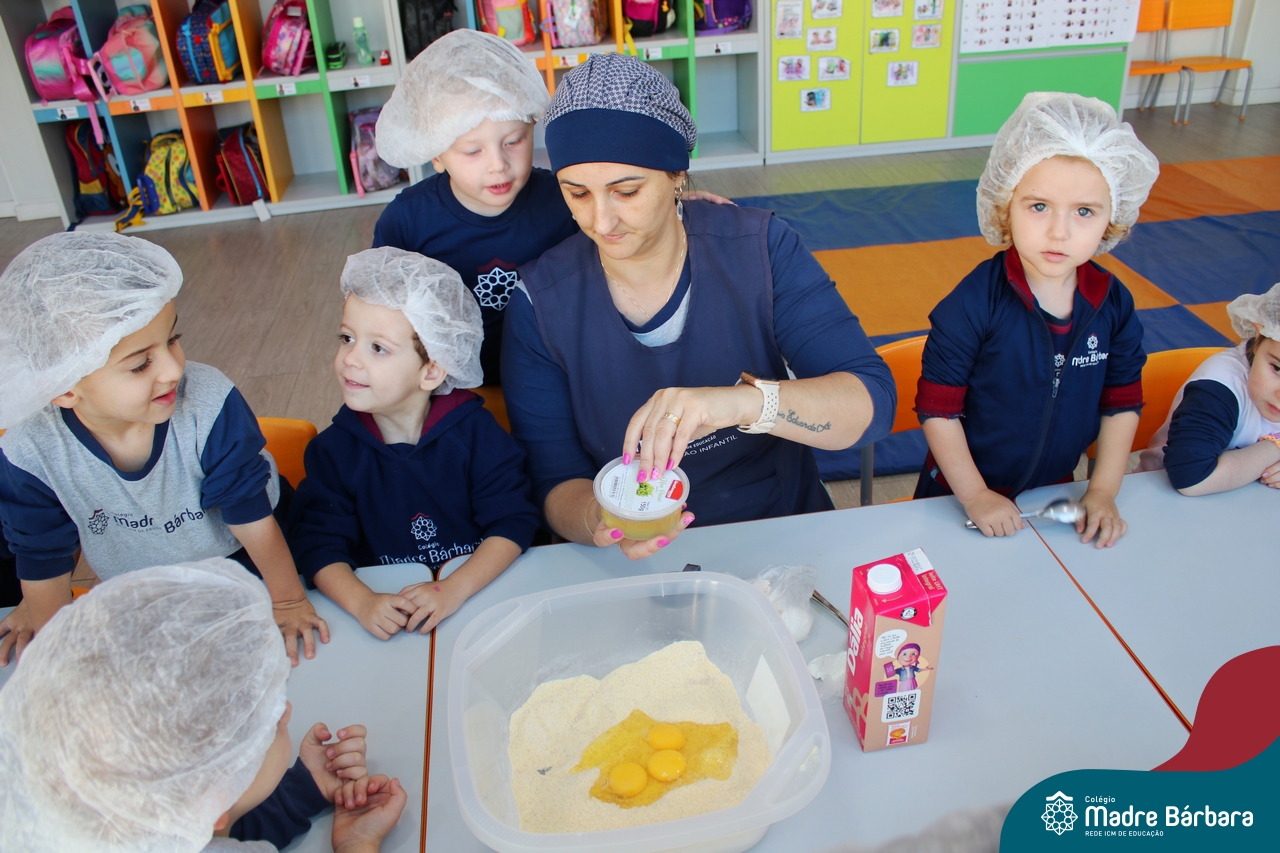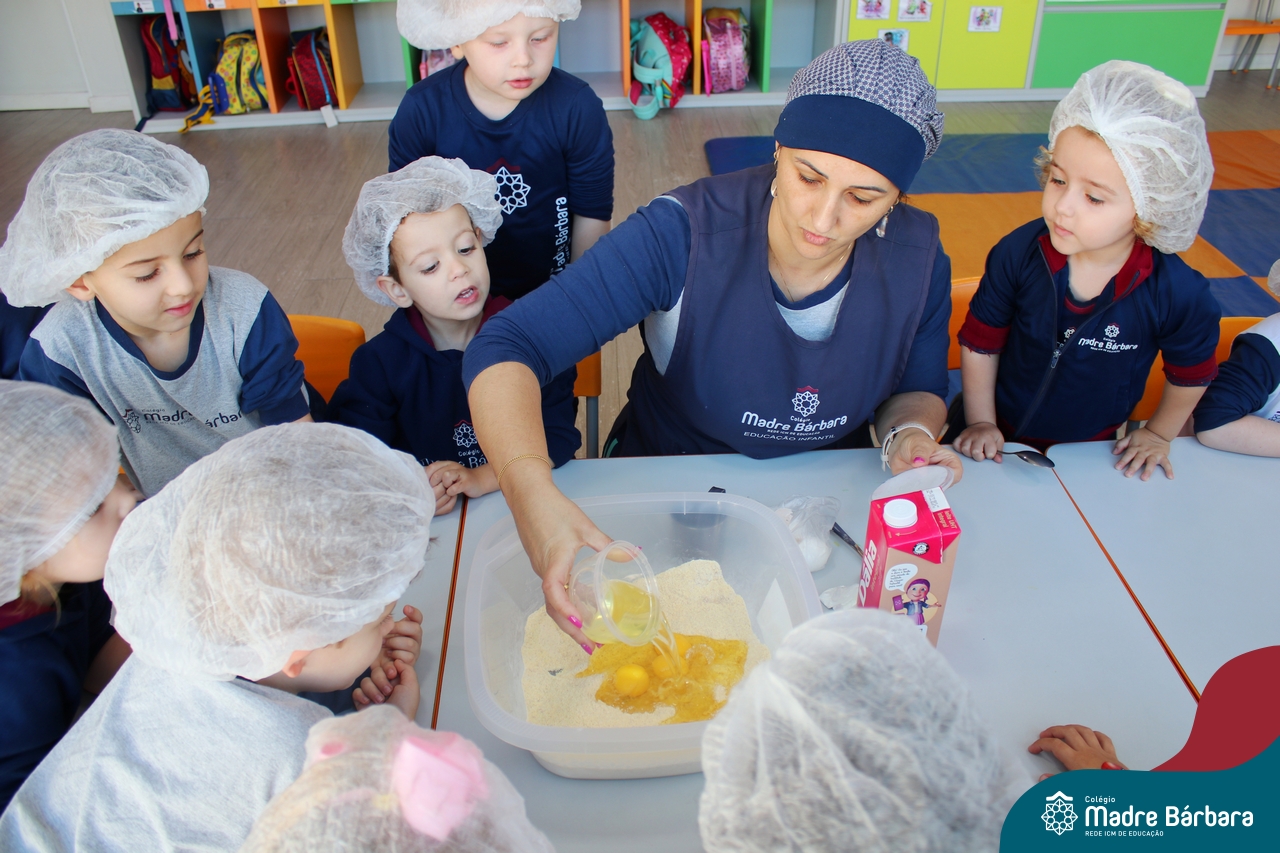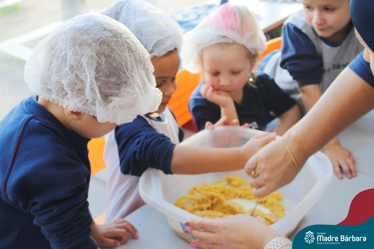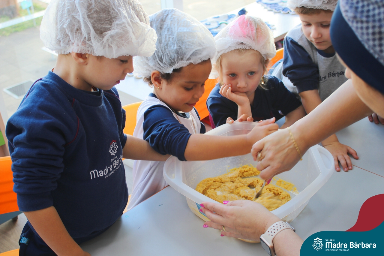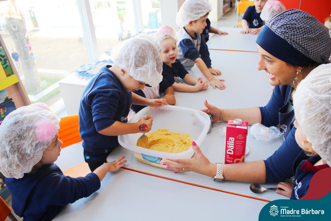 A turma do Nível 3B realizou um momento de culinária, fazendo um delicioso bolo de milho. Agregando ao projeto de arte e sensações, as crianças puderam explorar grãos, sentindo a textura, espessura, entre outras sensações. Eles colocaram a mão na massa! O bolo de milho também é uma comida típica das Festas Juninas, lembrando que no dia 10.06 será realizado o tradicional Arraiá do CMB. Venham todos participar!