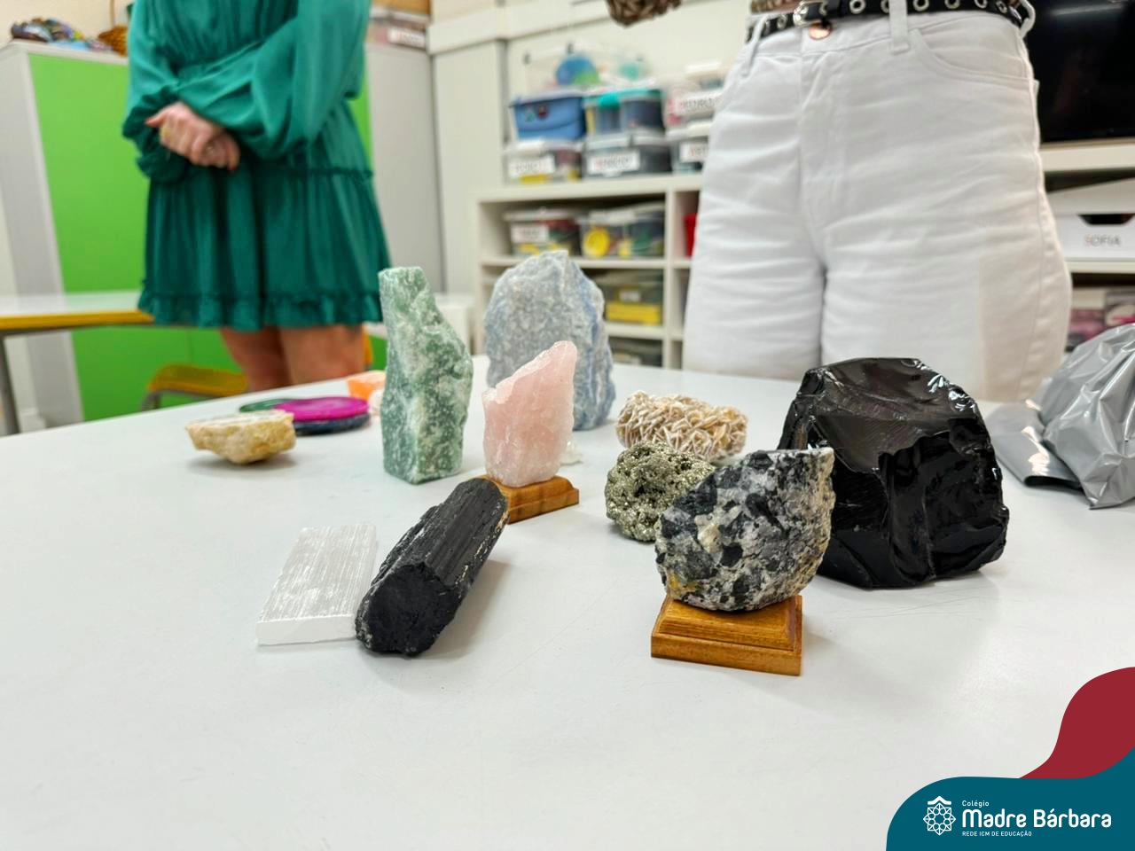 As crianças do Nível 5C, juntamente com sua professora Christiane B. Rockenbach e as monitoras Bruna Guimarães e Daniela Bündchen, estão desvendando o grande universo das pedras, sendo que todas que são encontradas são de extrema preciosidade. Para agregar ainda mais conhecimento sobre o uso das pedras e como elas são encontradas na natureza, a design de joias Jordana e a especialista em pedras Daniela, da empresa Brenner Pedras, vieram até a escola para mostrar e conversar com as crianças sobre este mundo tão fascinante, colorido e gigantesco. Foi uma vivência de muitas trocas, onde as crianças trouxeram seus conhecimentos e puderam aprender ainda mais com estas duas profissionais.
