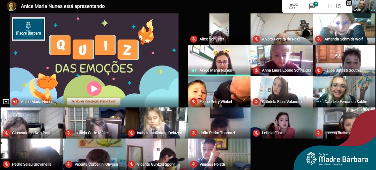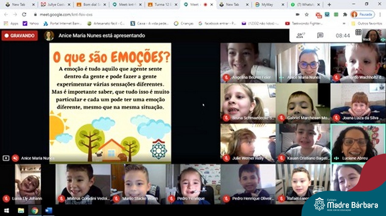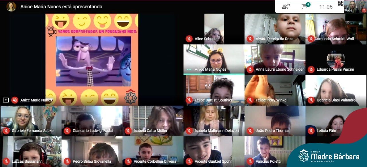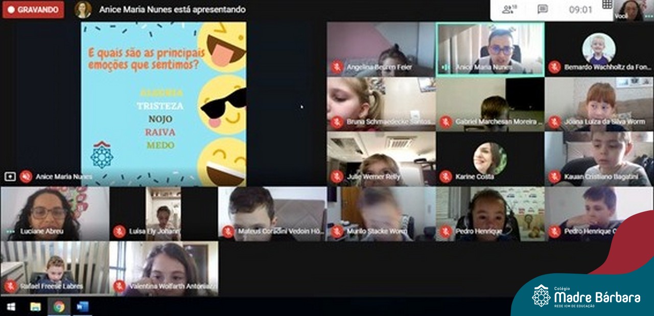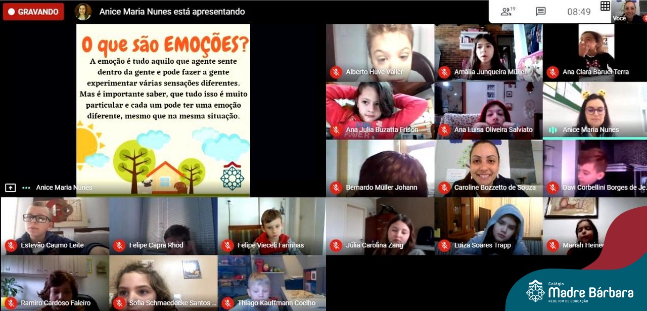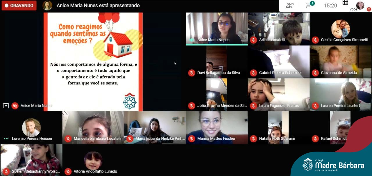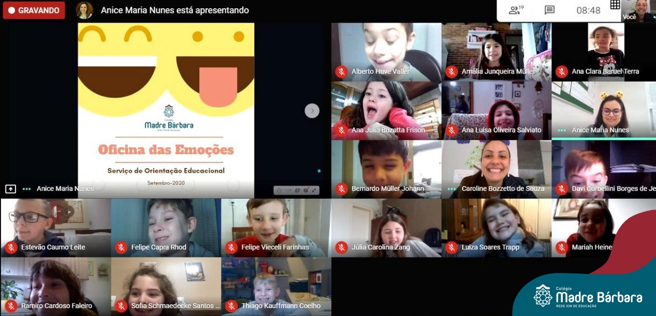 Foi com muita alegria, que os alunos dos Primeiros e Segundos anos do Colégio Madre Bárbara, juntamente com suas professoras, receberam esta semana, nas suas salas de aula Google Classroom, a visita da Orientadora Educacional da escola Anice Nunes, que desenvolveu a “oficina das emoções”.