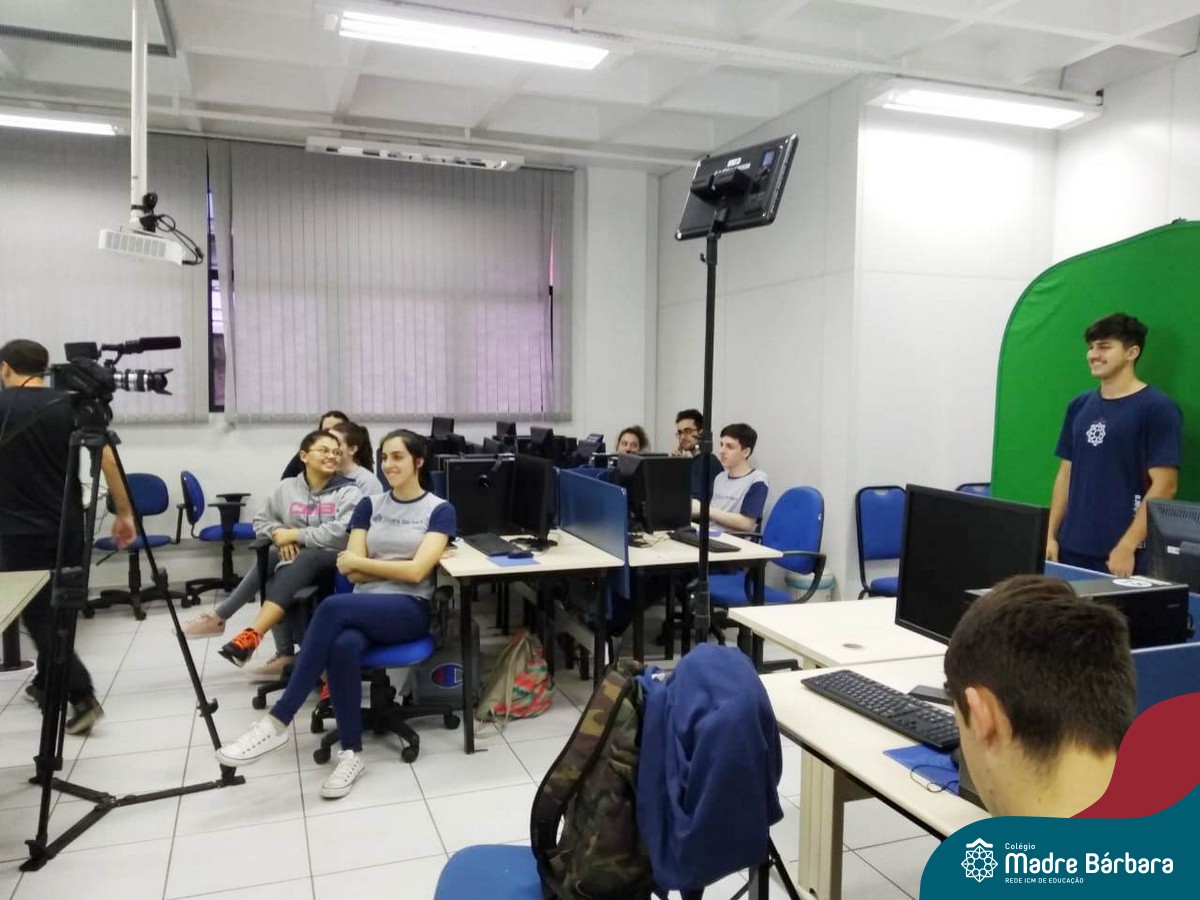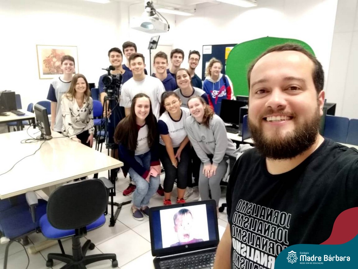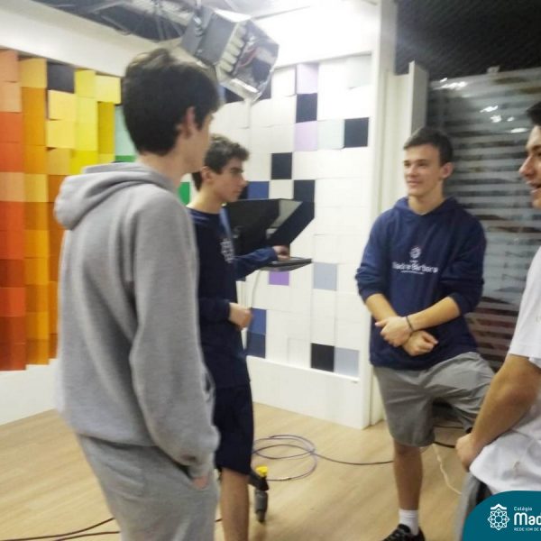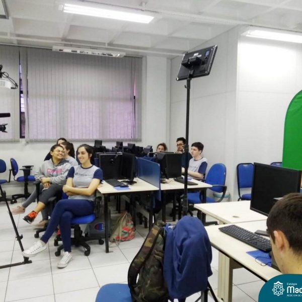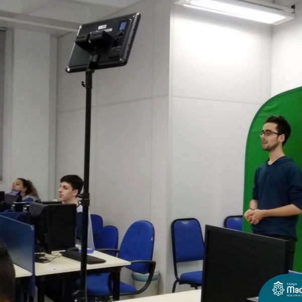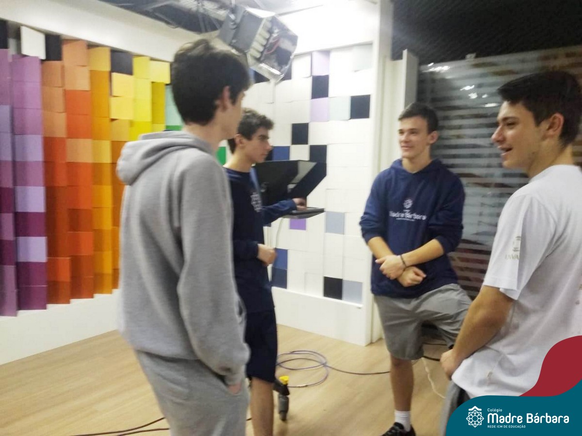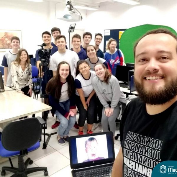 Na tarde de quinta-feira (03), alguns alunos do 2º ano do Ensino Médio, acompanhados pela professora Francieli Winck, participaram da oficina de audiovisual, ministrada pelo jornalista e professor do curso de Comunicação Marcus Staudt, na Univates. Os estudantes puderam experimentar e vivenciar um pouco sobre produção audiovisual, além de conhecerem mais sobre o curso de Comunicação Social e os bastidores da TV Univates.