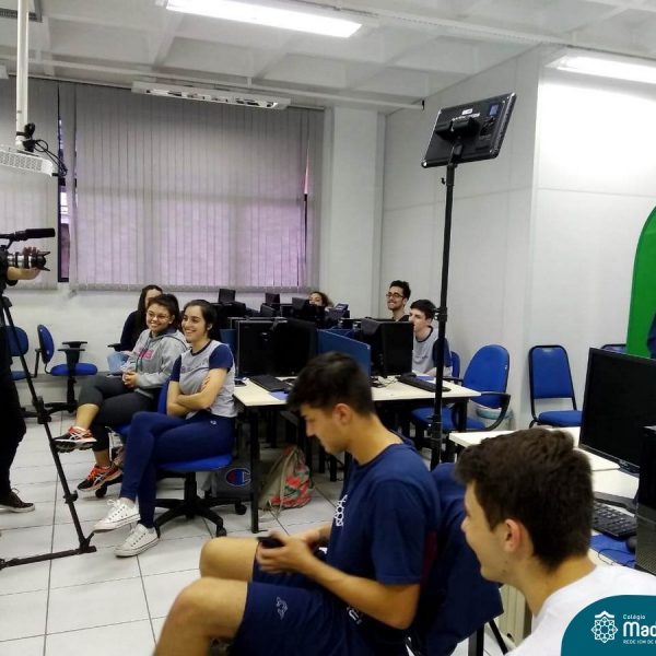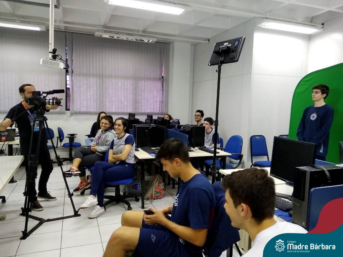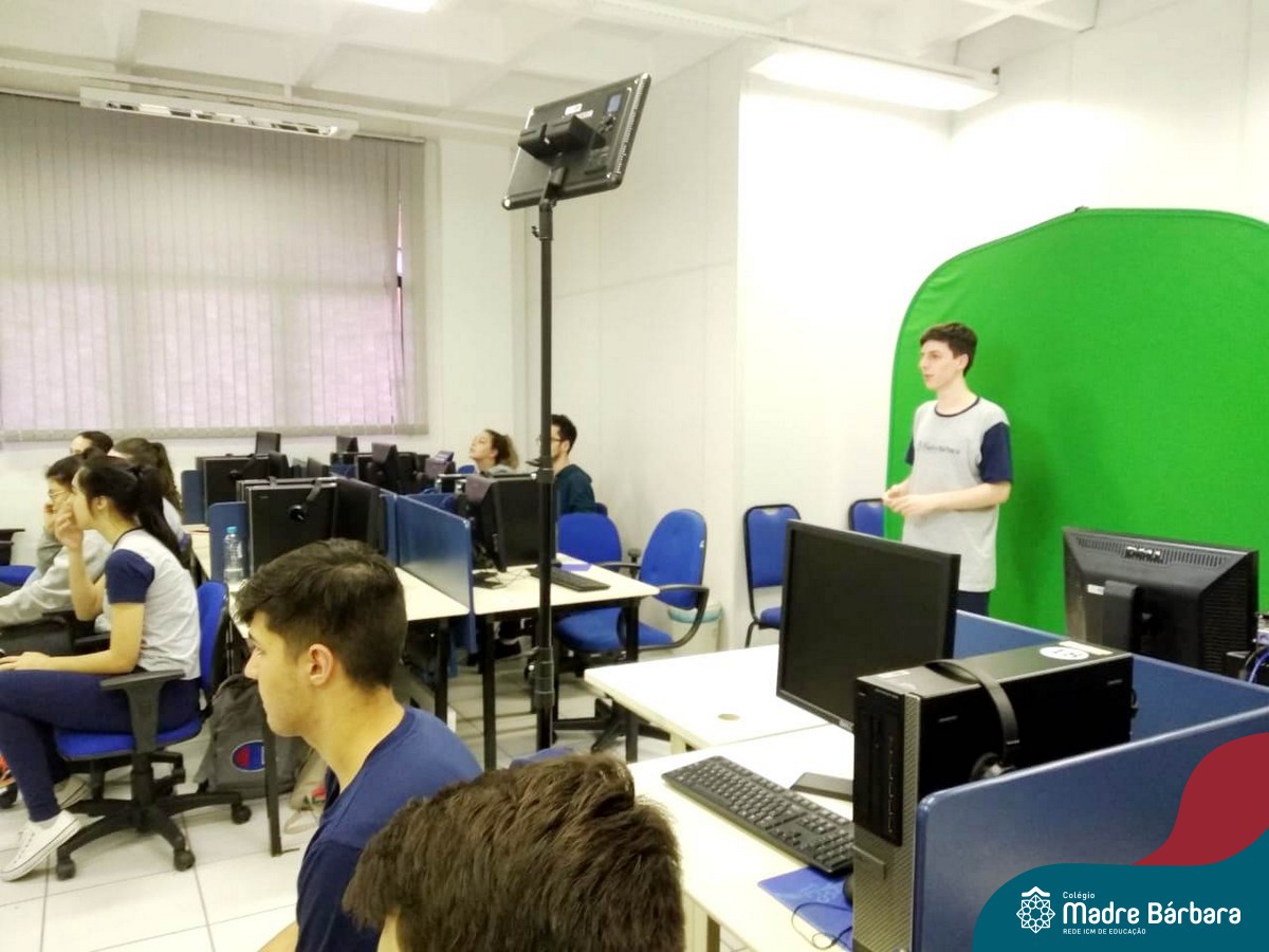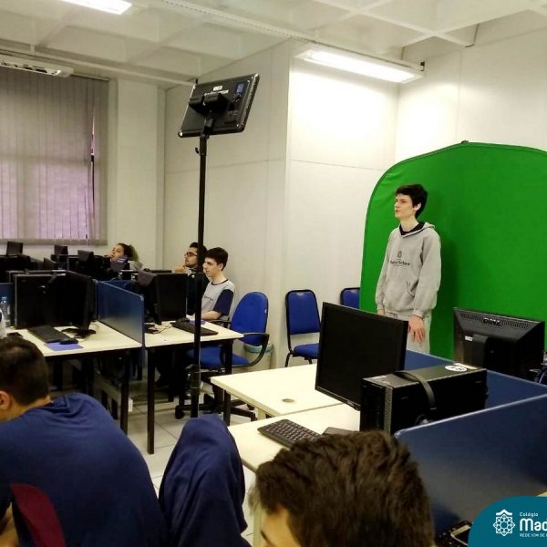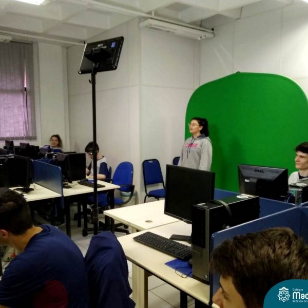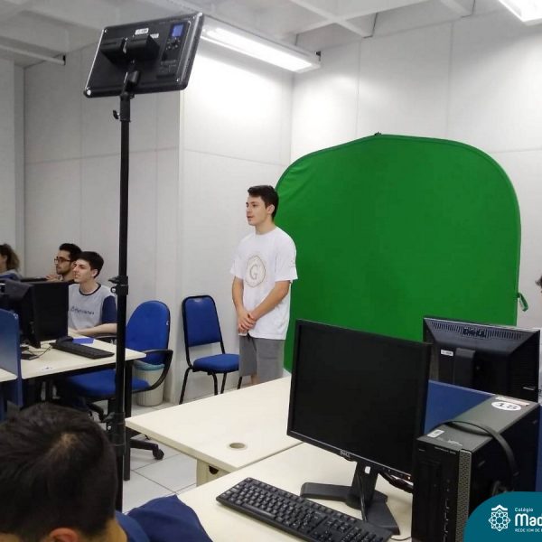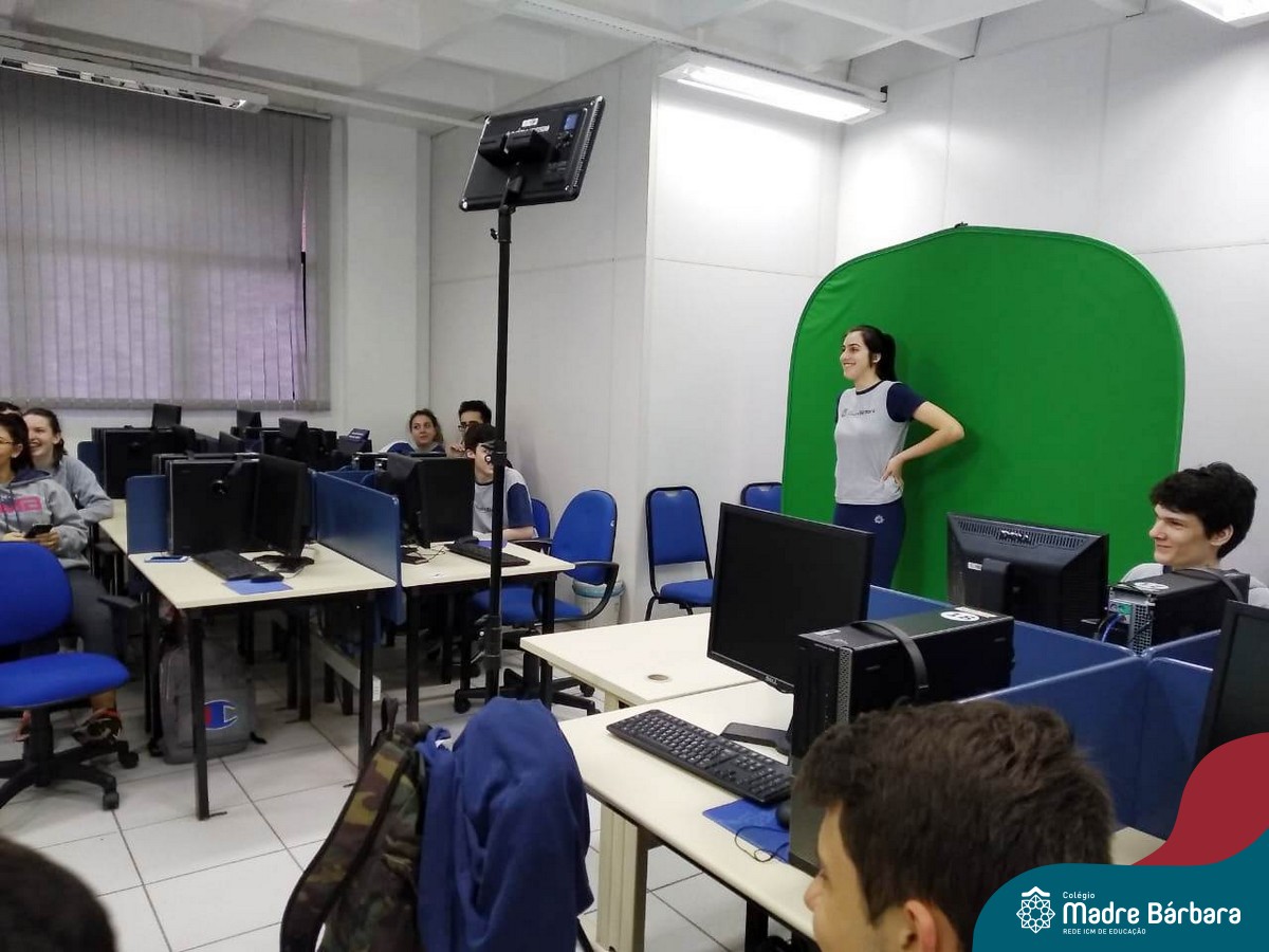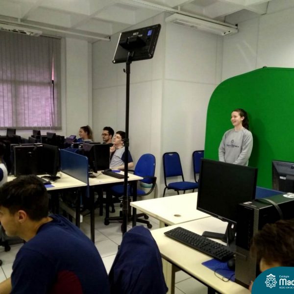 Na tarde de quinta-feira (03), alguns alunos do 2º ano do Ensino Médio, acompanhados pela professora Francieli Winck, participaram da oficina de audiovisual, ministrada pelo jornalista e professor do curso de Comunicação Marcus Staudt, na Univates. Os estudantes puderam experimentar e vivenciar um pouco sobre produção audiovisual, além de conhecerem mais sobre o curso de Comunicação Social e os bastidores da TV Univates.