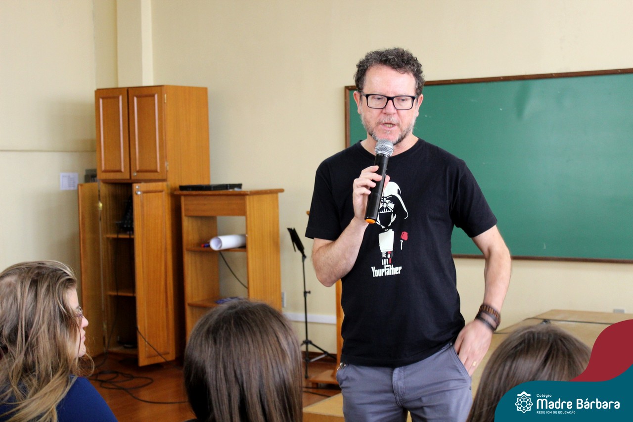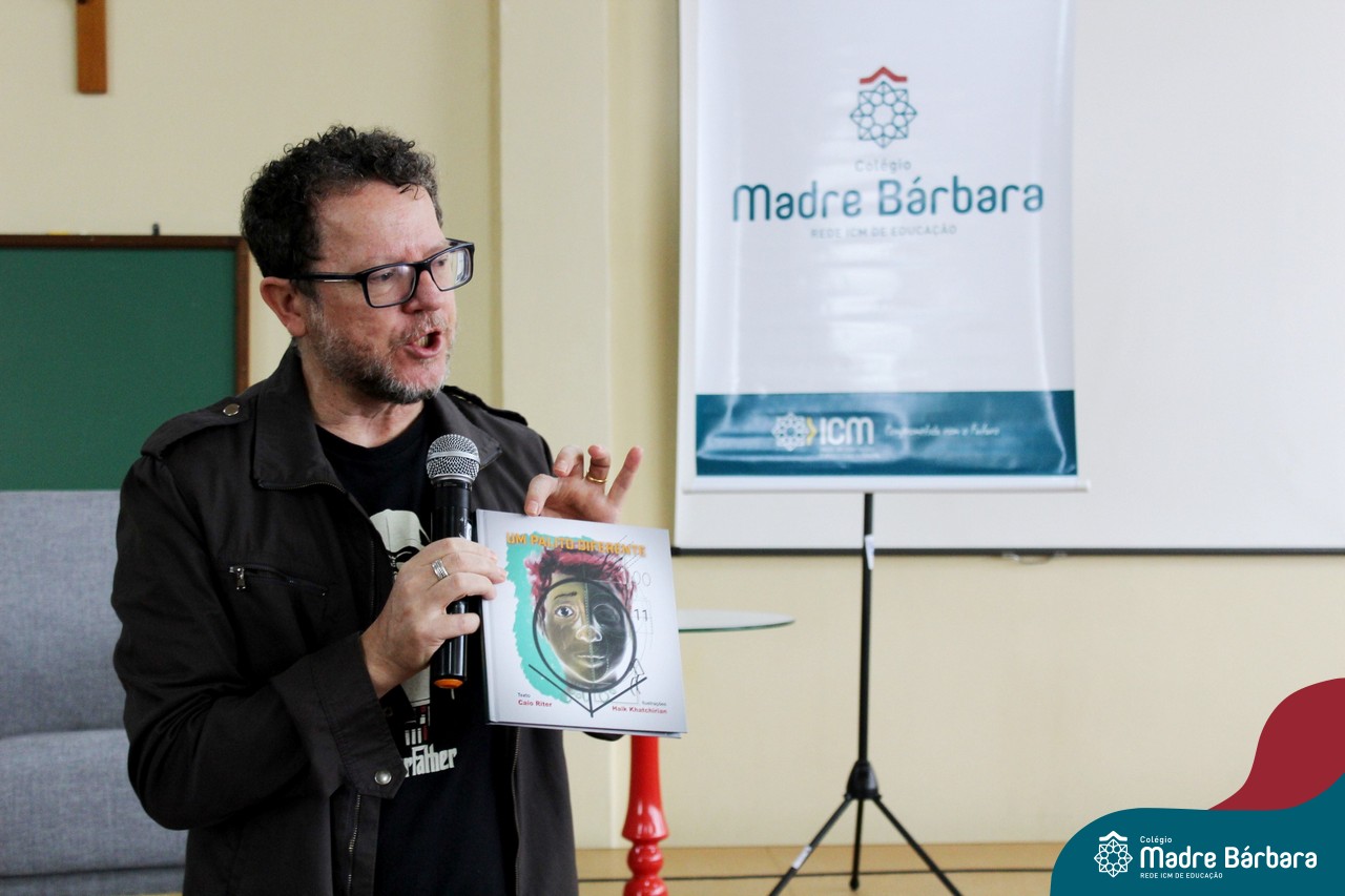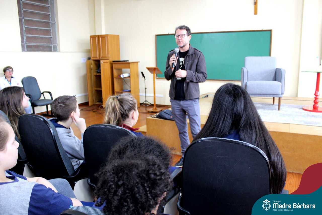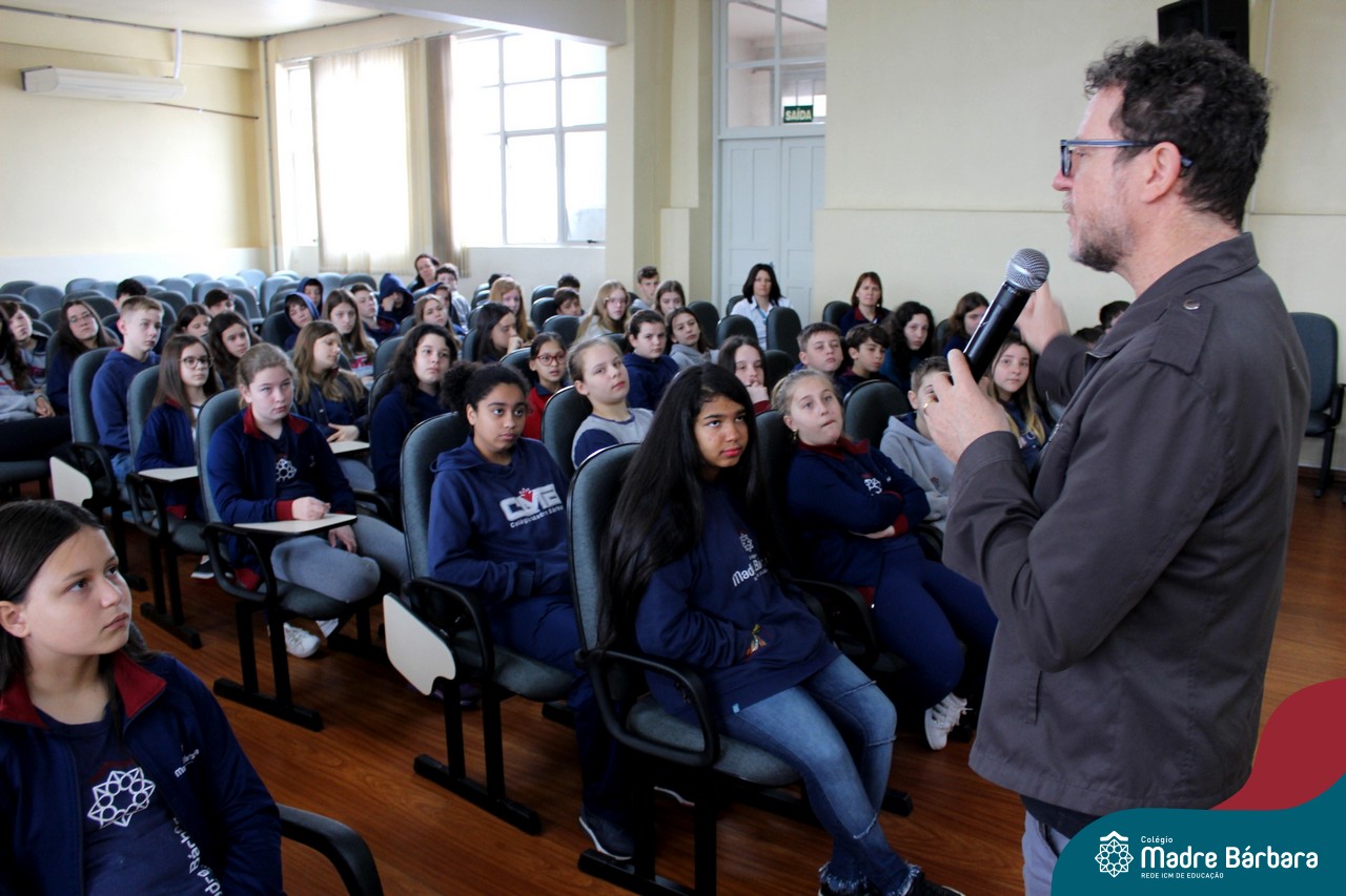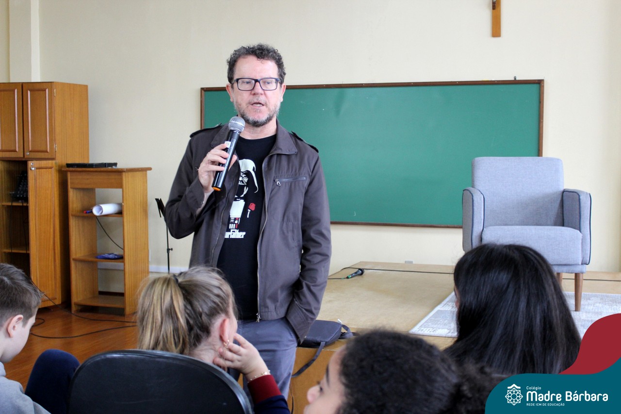 Os alunos do Ensino Fundamental – Anos Finais do Colégio Madre Bárbara – Rede ICM tiveram nessa sexta-feira (27.09) a oportunidade de conversar com o escritor Caio Riter, referente suas obras e a importância da leitura e escrita. Foi um momento de troca de conhecimentos e vivências, realizado a partir da leitura de alguns livros ao longo do ano. A atividade foi proposta pela área das linguagens.