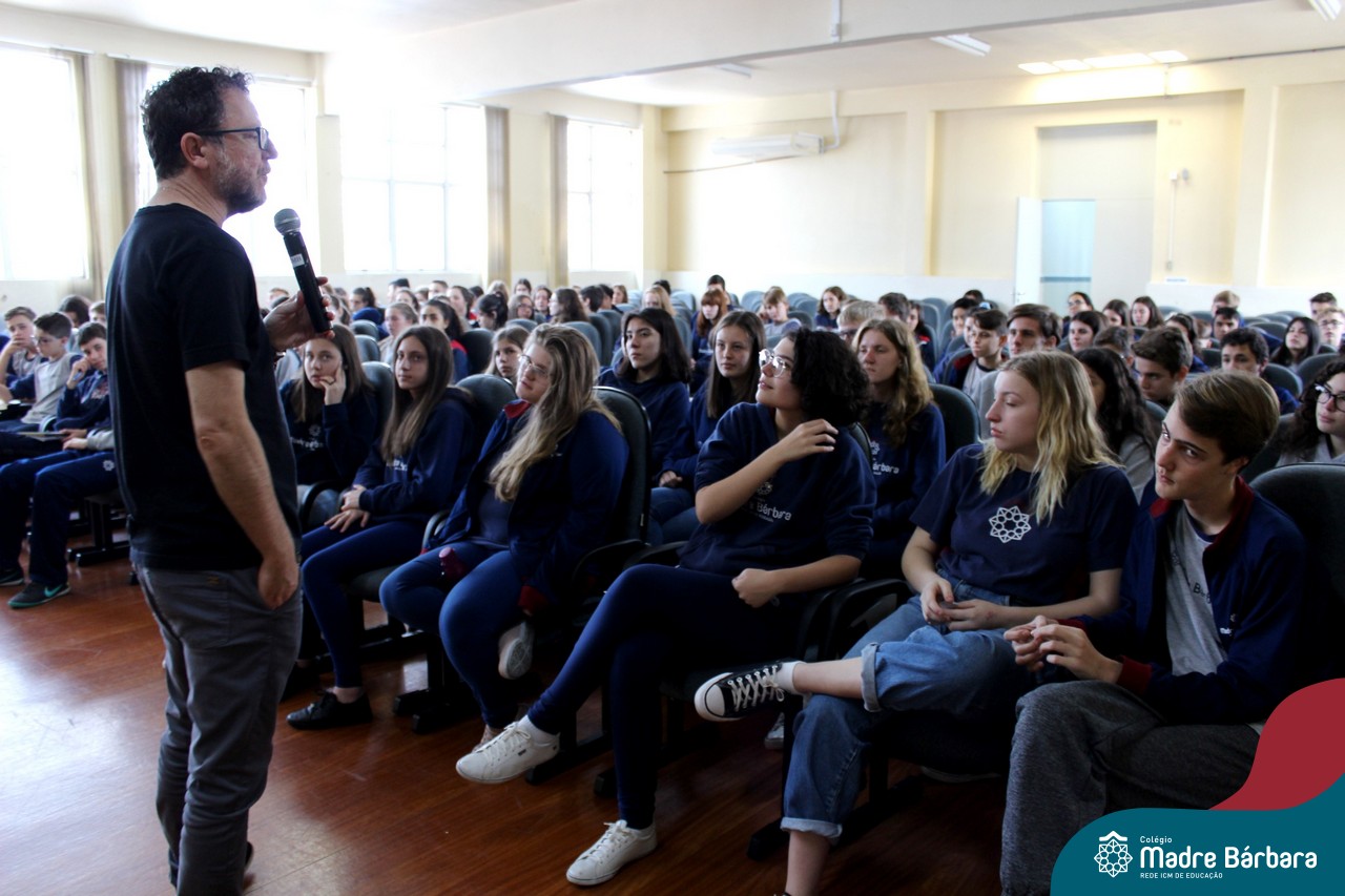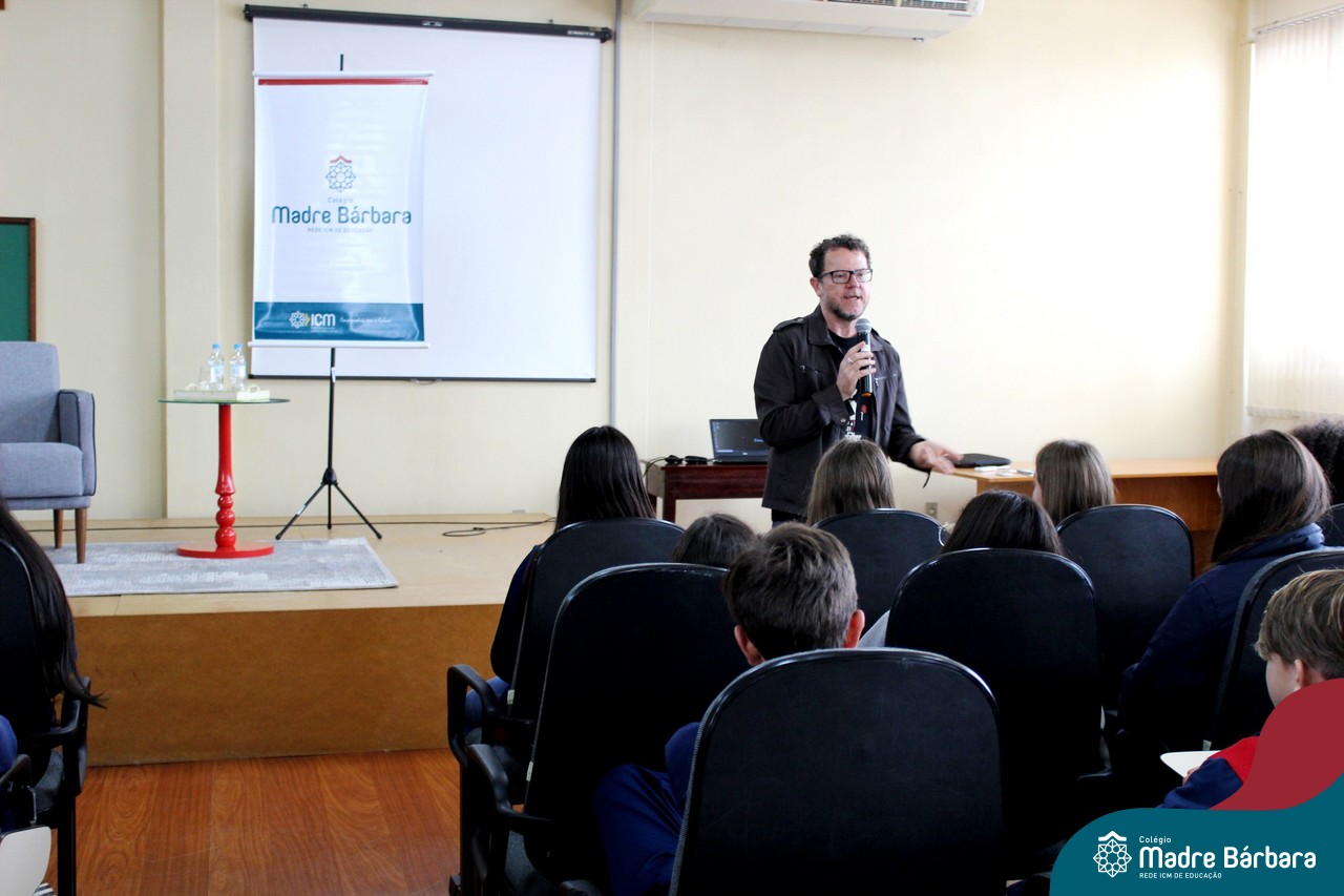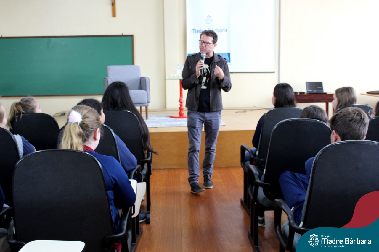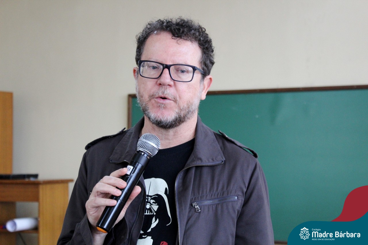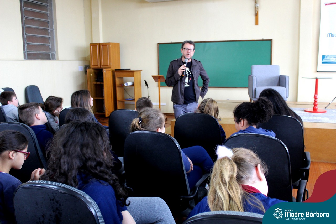 Os alunos do Ensino Fundamental – Anos Finais do Colégio Madre Bárbara – Rede ICM tiveram nessa sexta-feira (27.09) a oportunidade de conversar com o escritor Caio Riter, referente suas obras e a importância da leitura e escrita. Foi um momento de troca de conhecimentos e vivências, realizado a partir da leitura de alguns livros ao longo do ano. A atividade foi proposta pela área das linguagens.