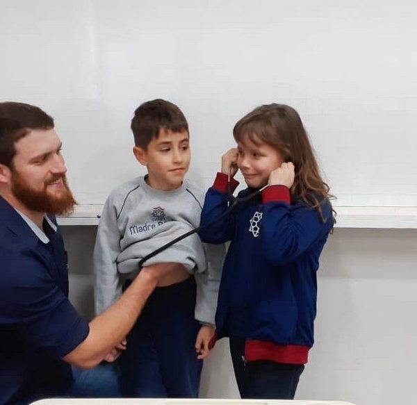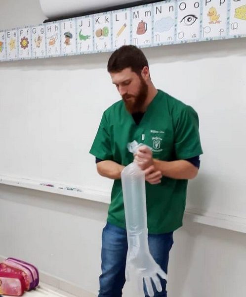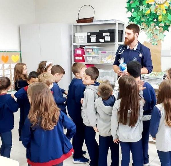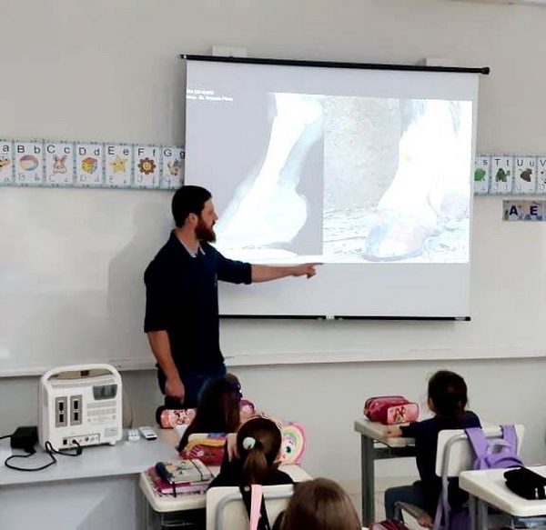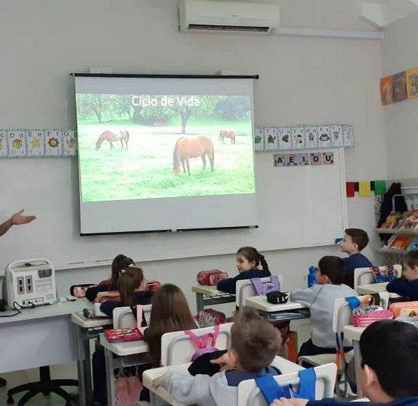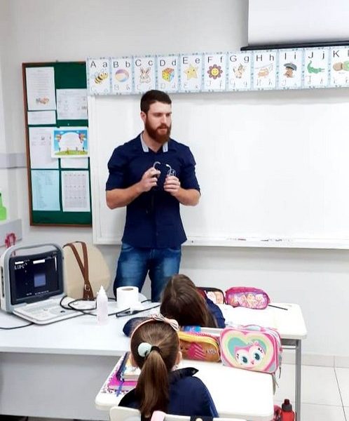 A turma 14 recebeu a visita do médico veterinário William Dörr para complementar o estudo que está sendo desenvolvido em sala de aula pela professora Caroline e Monitora Júlia. O tema da Mostra Científico-Pedagógica é “O fantástico mundo dos cavalos”, sendo que, na palestra, os alunos conversaram sobre todas as suas dúvidas do ciclo de vida e reprodução dos cavalos, alimentação, cuidados, onde vivem, para que são utilizados e alguns tipos de raças. Para tornar ainda mais significativo, os alunos foram convidados a observar e manipular alguns materiais utilizados no trabalho do veterinário William, como o Ultrassom, onde puderam ver o coração de alguns colegas ao vivo no aparelho e o estetoscópio, onde cada um escutou o coração do seu colega.
